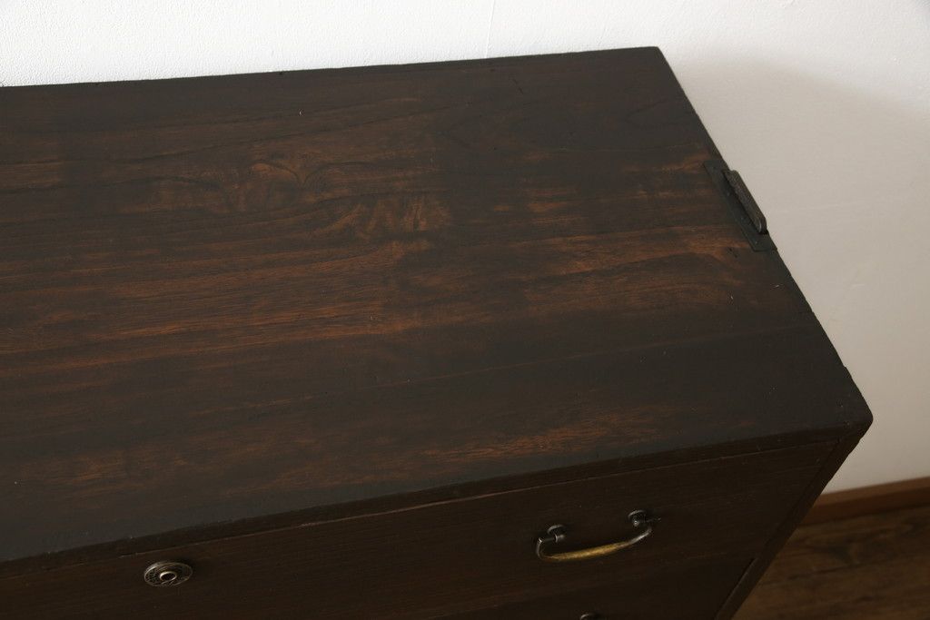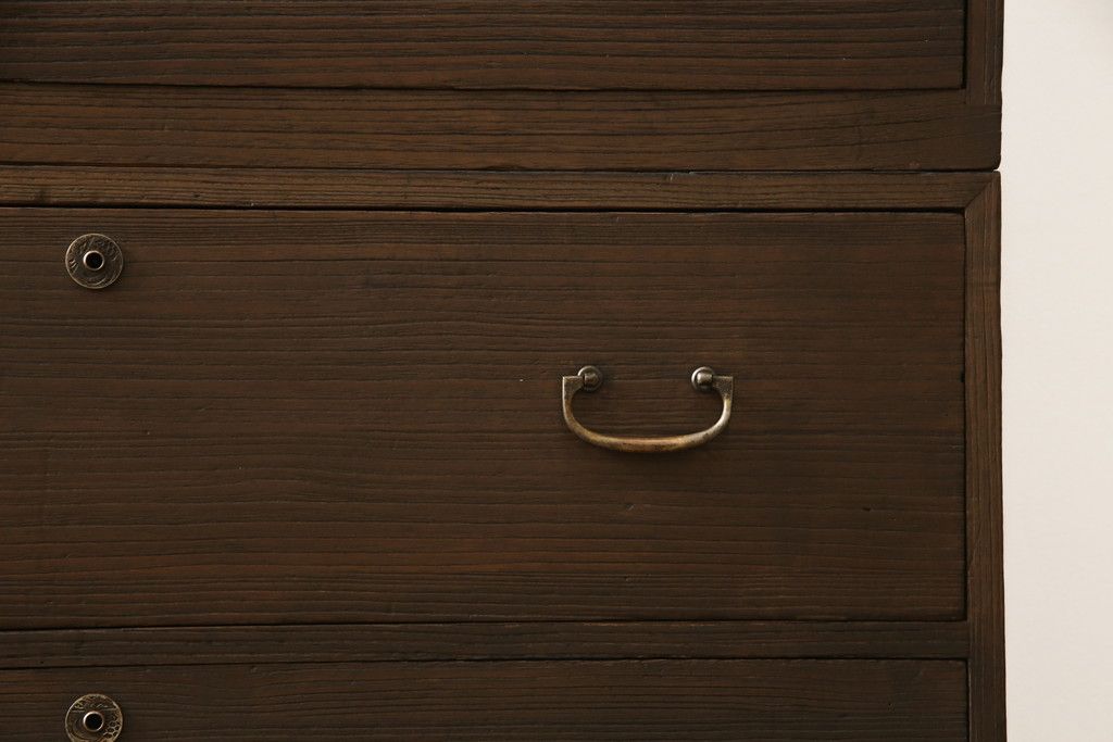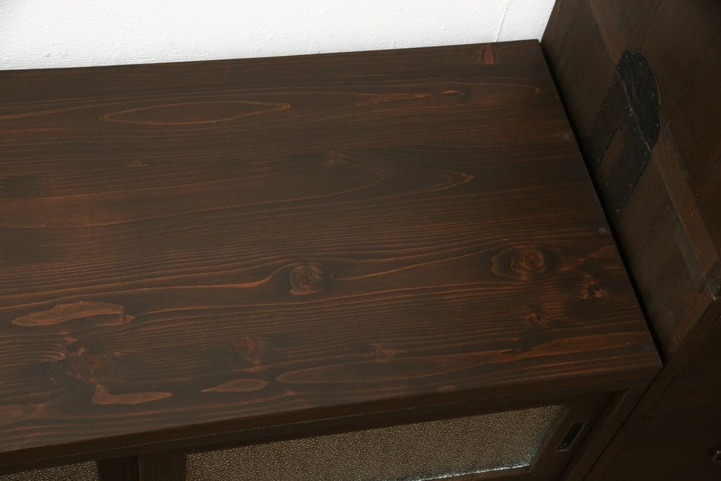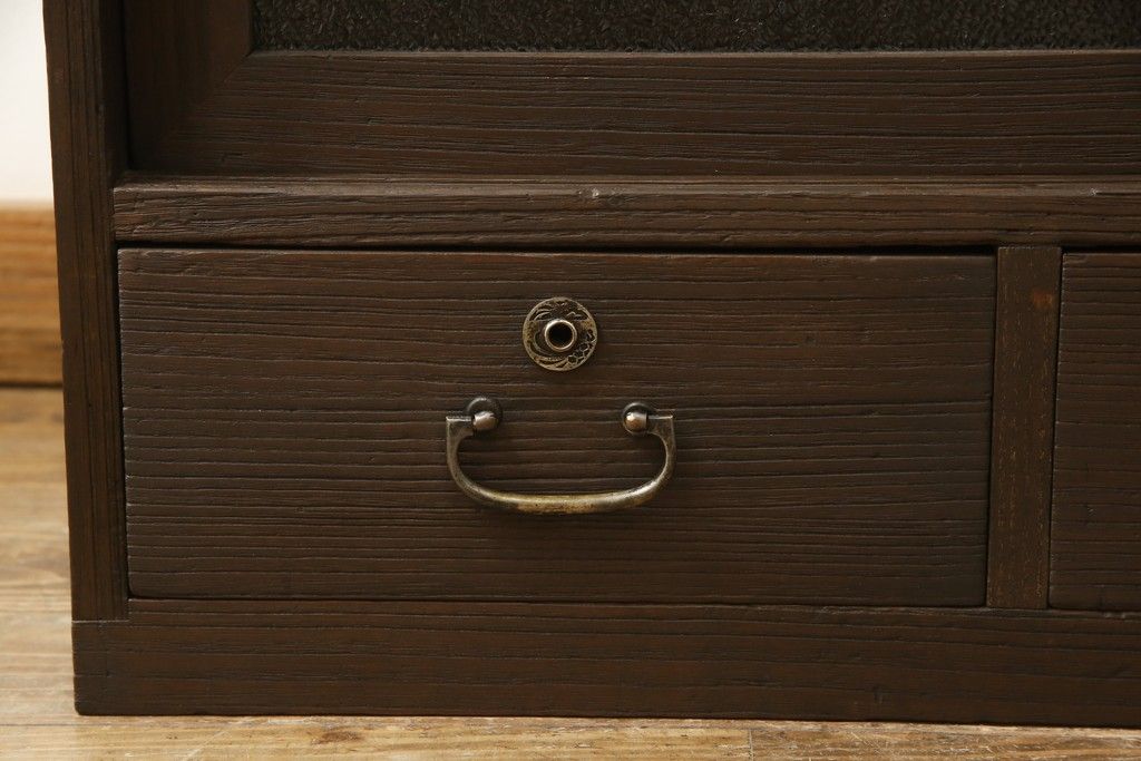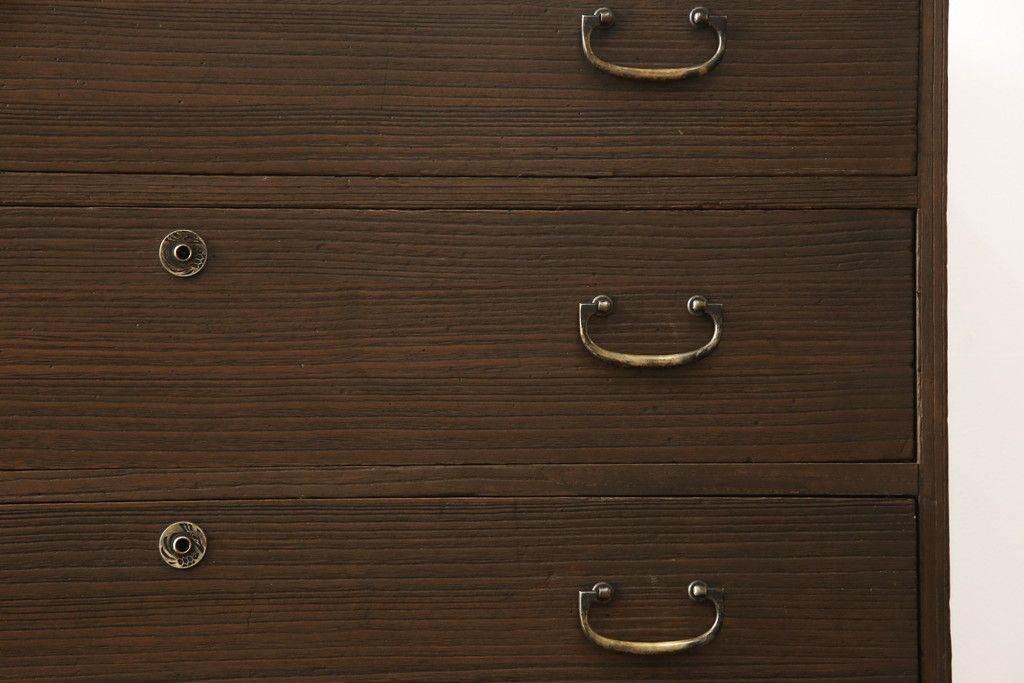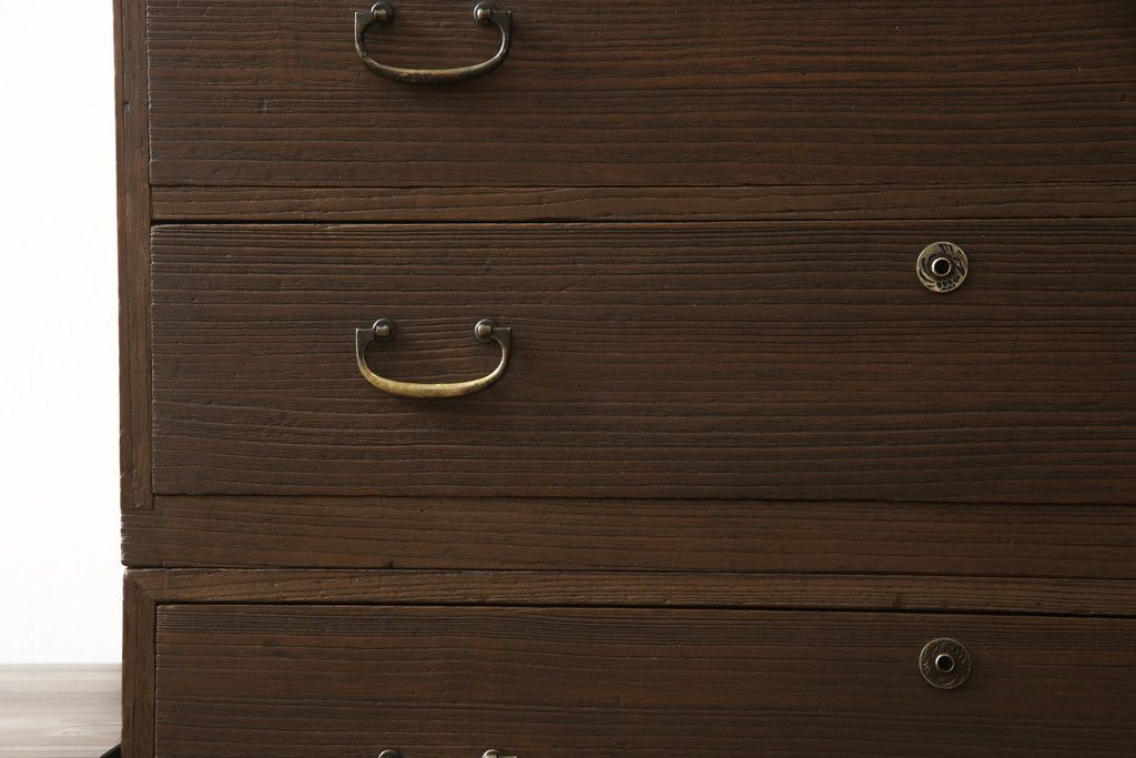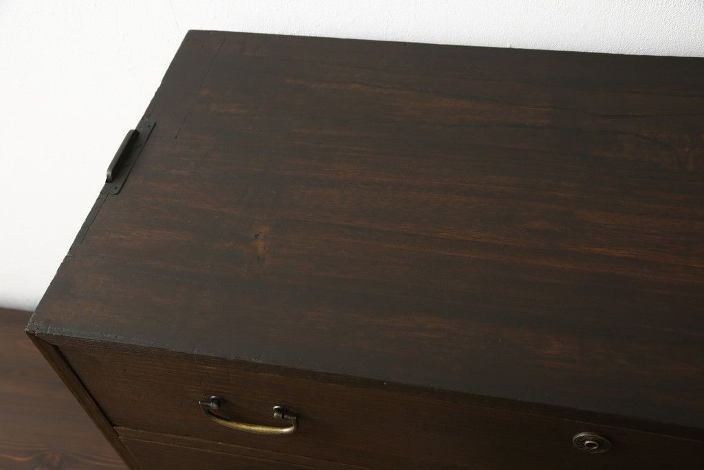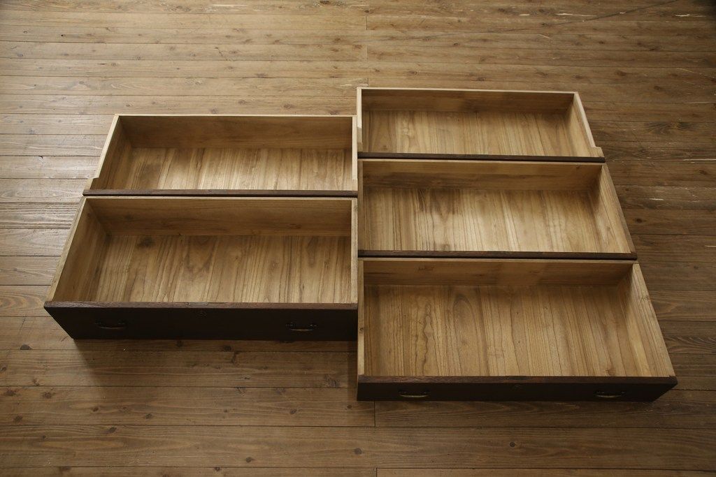 桐箪笥をテレビボードとチェストにリメイク!上段は天板を取り付け、ダイヤガラスをはめ込み、ガラス戸に変更。中段・下段は内側から天板補強。どちらも現状をベースに1トーン程落ち着いた色味に着色仕上げ。