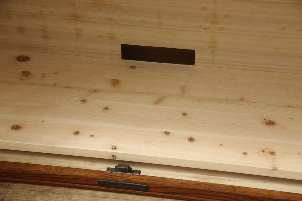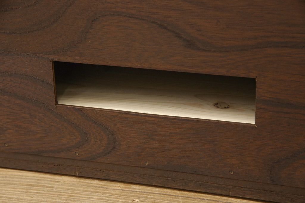 民芸家具 > サイドボードをリペア&カスタム!配線用穴あけ加工を施し、お盆2杯・棚板1枚製作。色味は現状のお品物に合わせて着色。(ローボード、サイドキャビネット、収納棚、戸棚、テレビ台、着物箪笥)