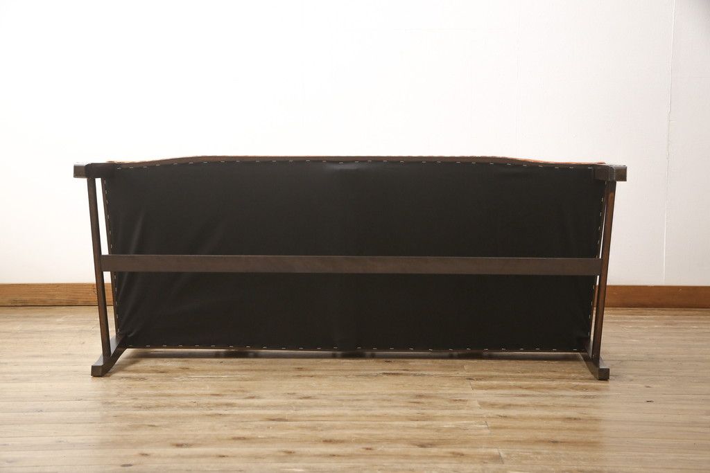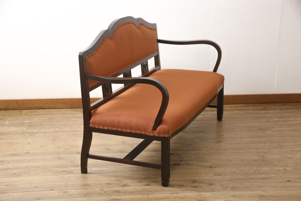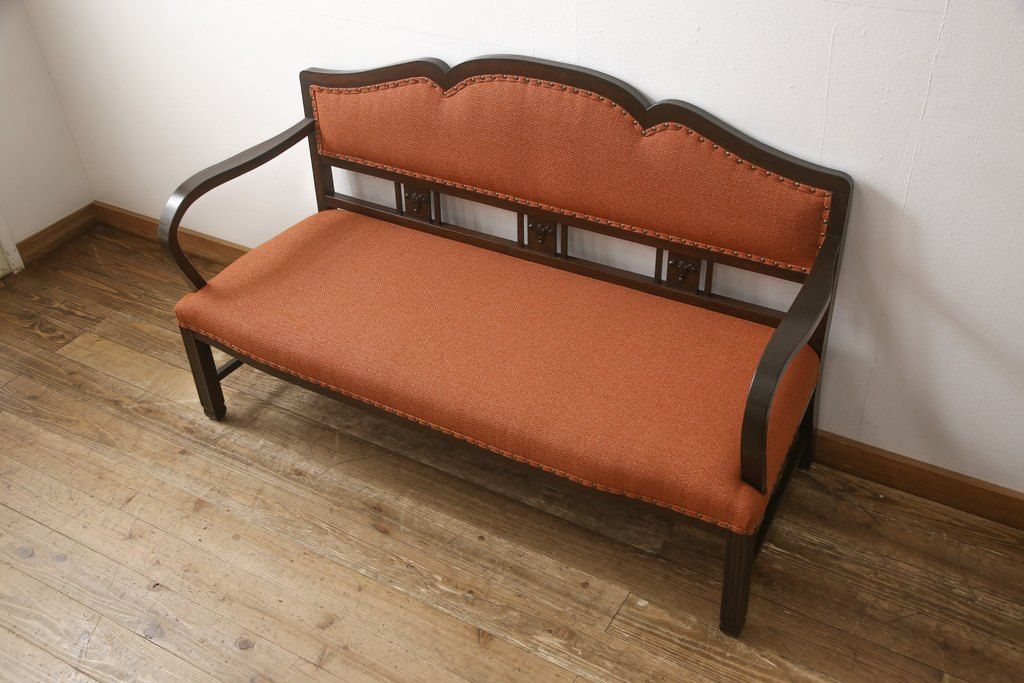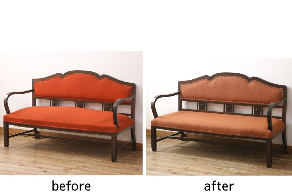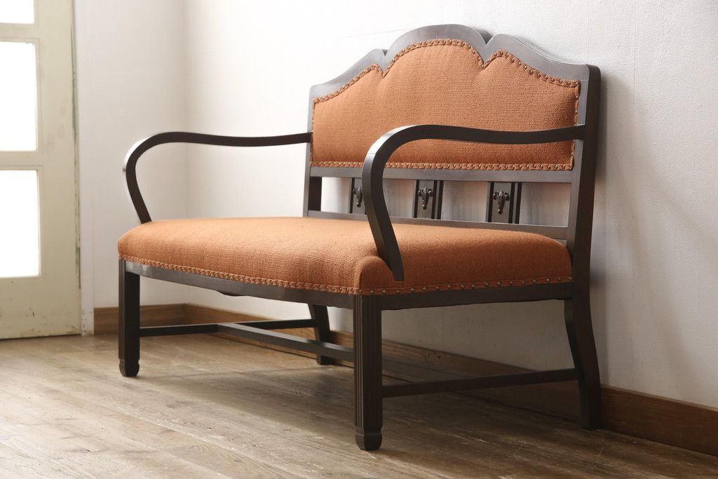 2人掛けアームソファをリペア&カスタム!ご希望の生地で座面を張り替え、クッションを硬めに仕上げ、鋲を交換。木製部分の色味は現状をベースにして1トーン程落ち着いた色味に着色。(二人掛け、ベンチ)