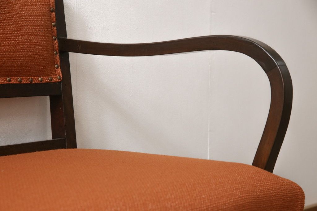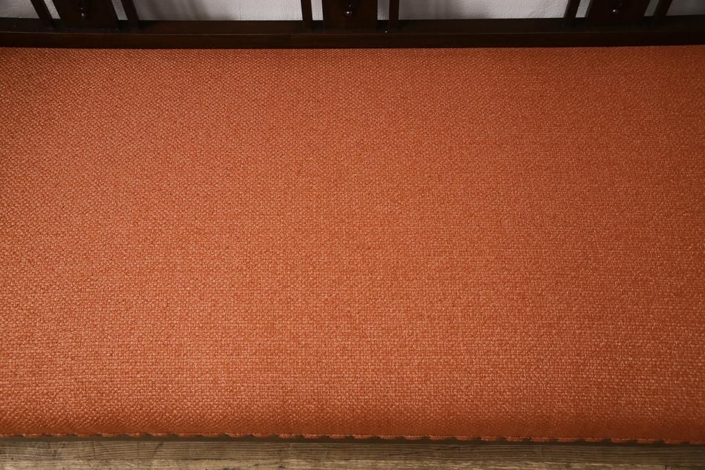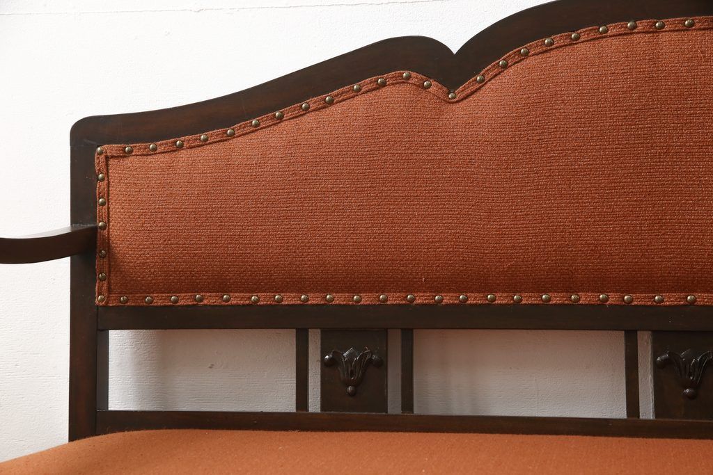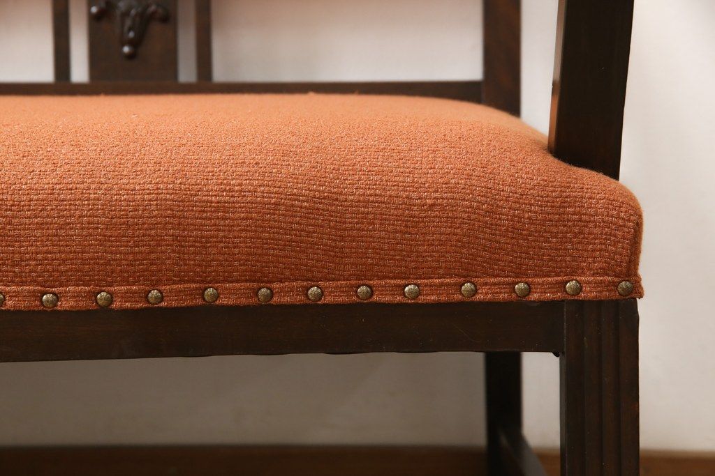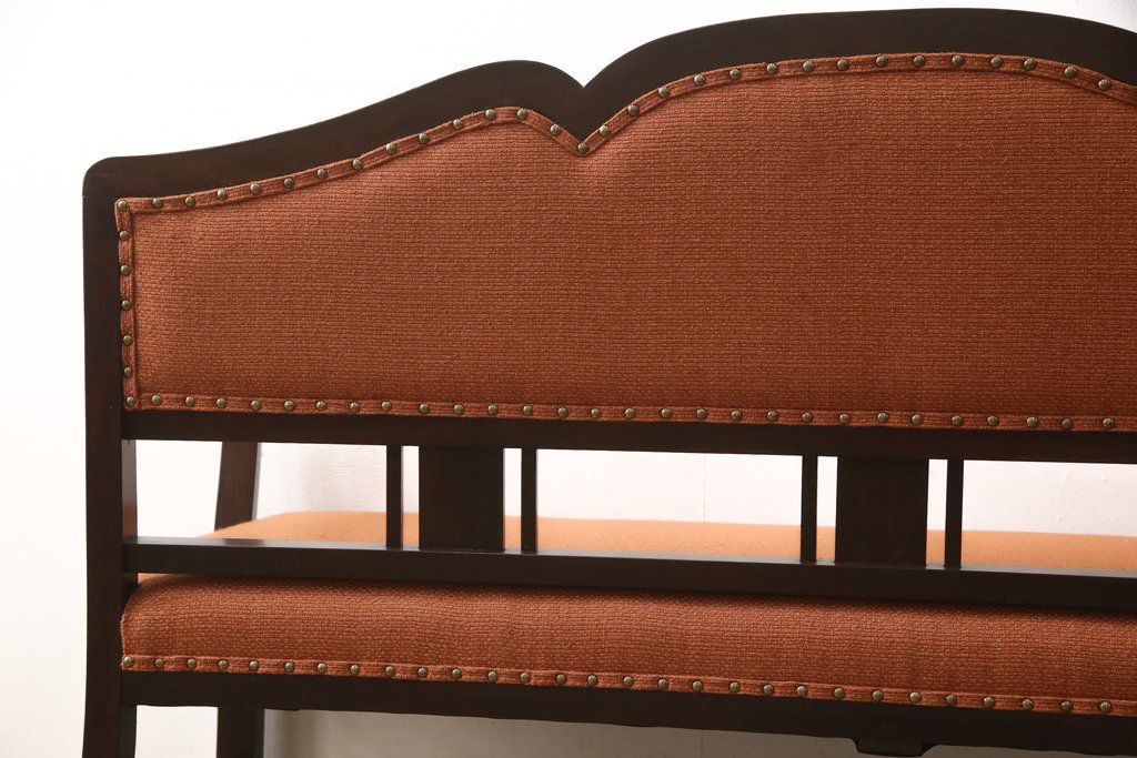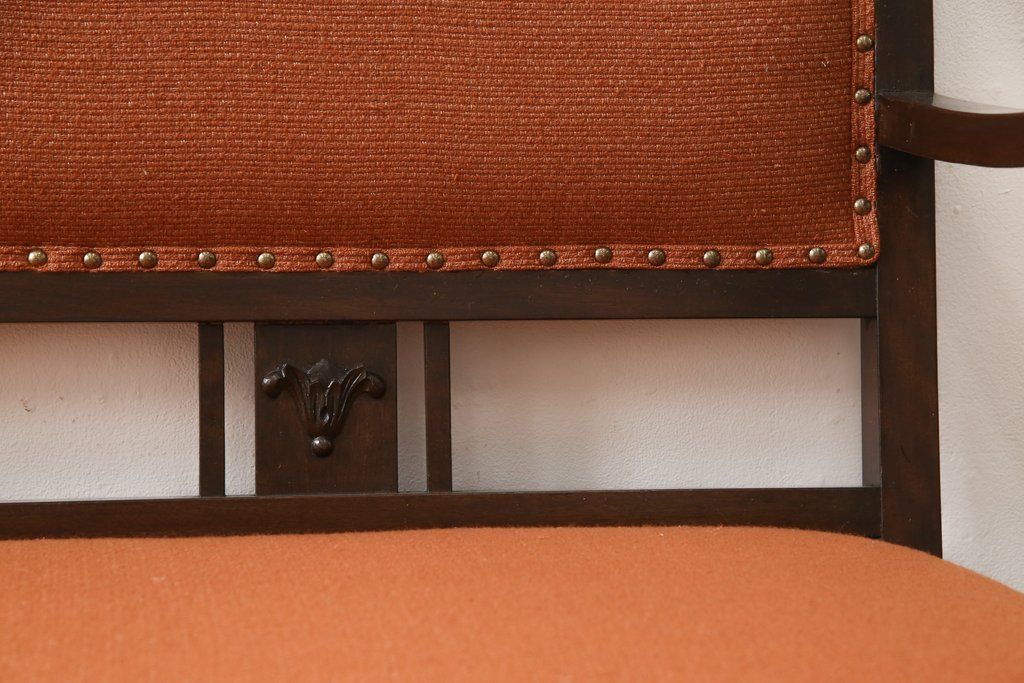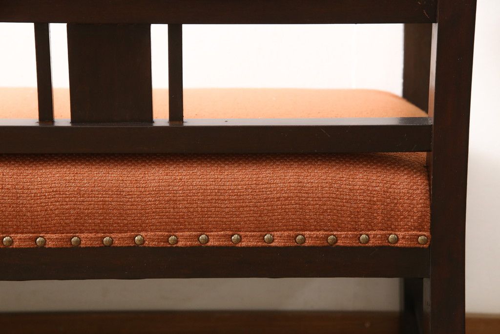 椅子・ベンチ> ベンチ > 2人掛けアームソファをリペア&カスタム!ご希望の生地で座面を張り替え、クッションを硬めに仕上げ、鋲を交換。木製部分の色味は現状をベースにして1トーン程落ち着いた色味に着色。(二人掛け、ベンチ)