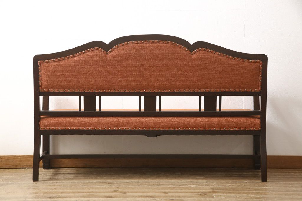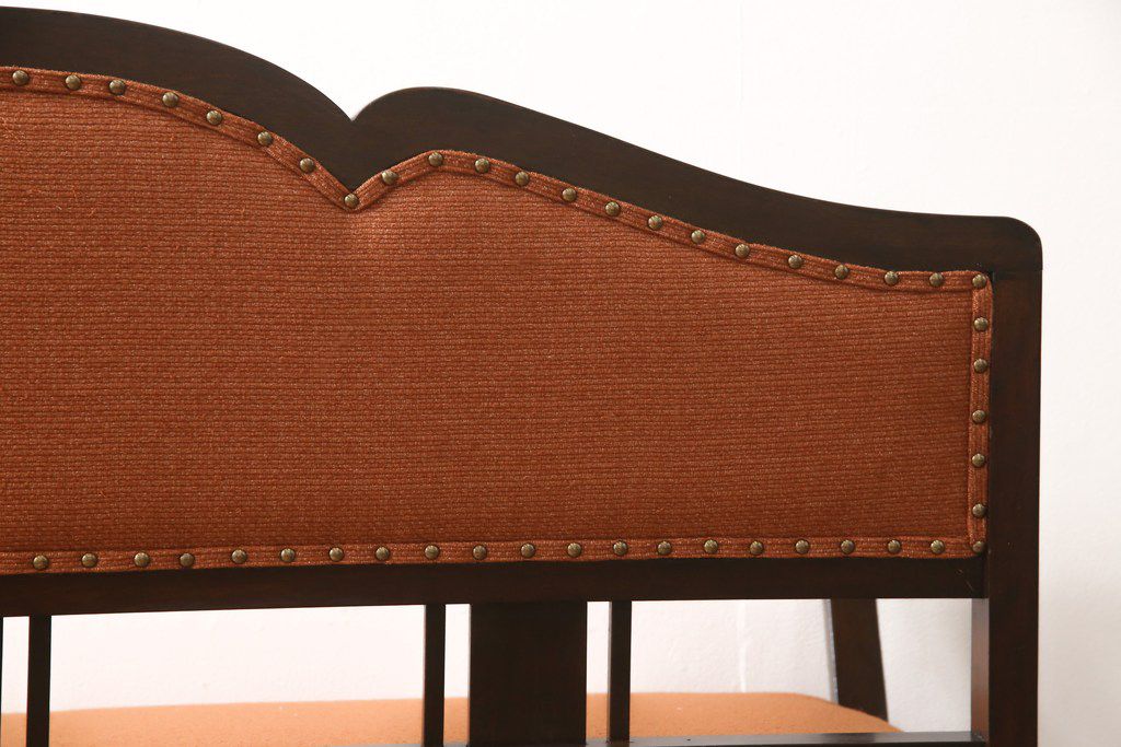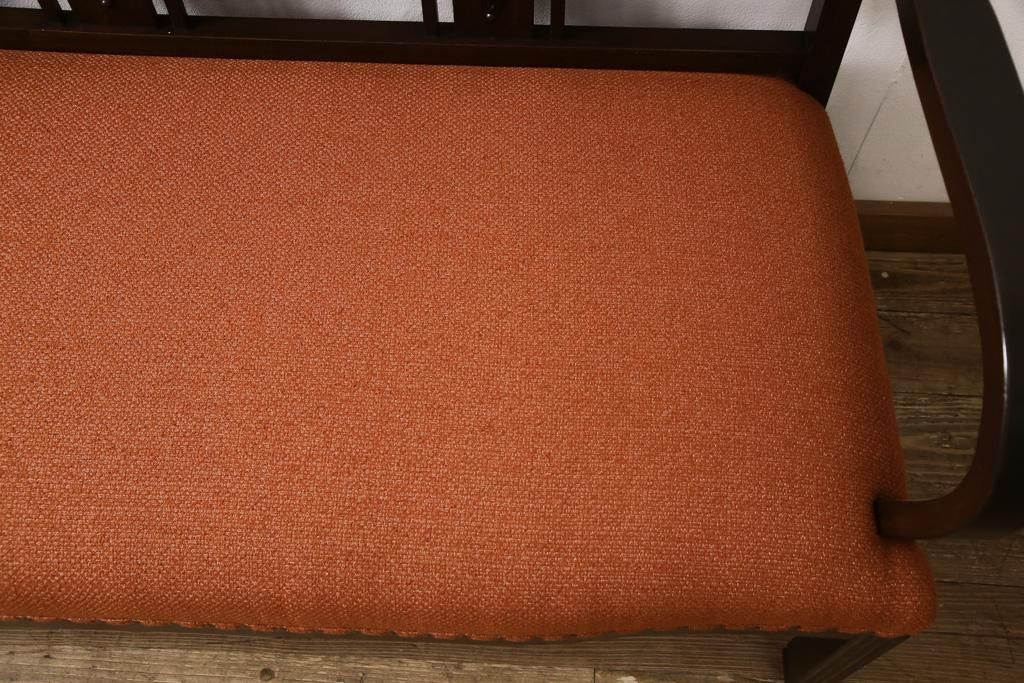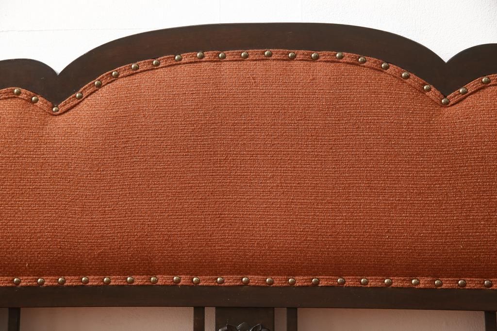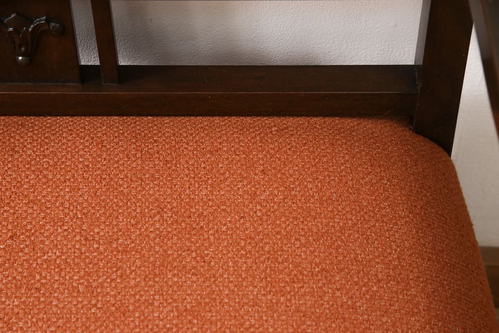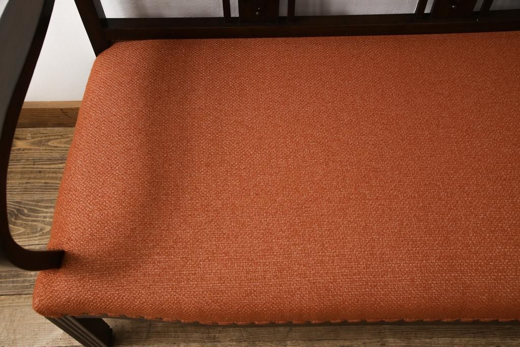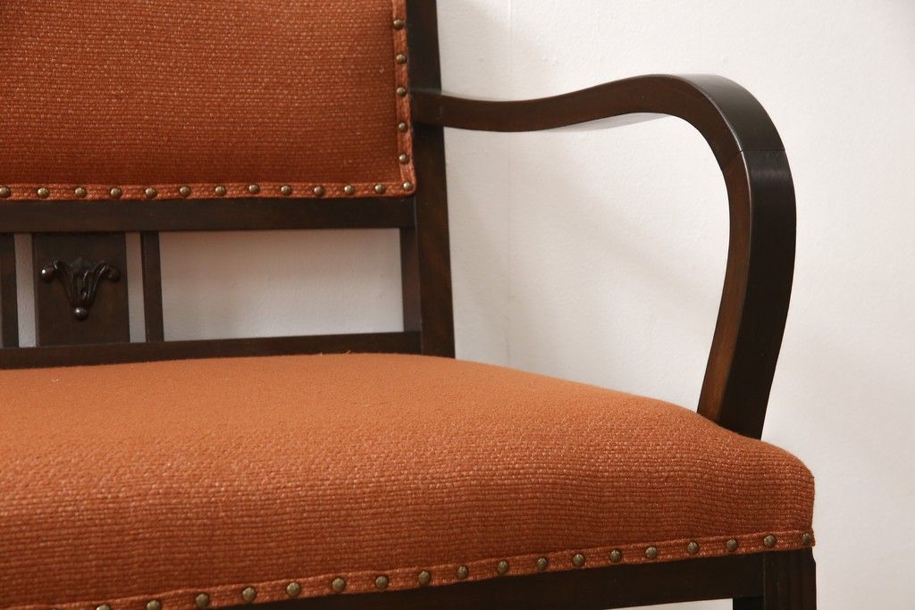 椅子・ベンチ> ベンチ > 2人掛けアームソファをリペア&カスタム!ご希望の生地で座面を張り替え、クッションを硬めに仕上げ、鋲を交換。木製部分の色味は現状をベースにして1トーン程落ち着いた色味に着色。(二人掛け、ベンチ)