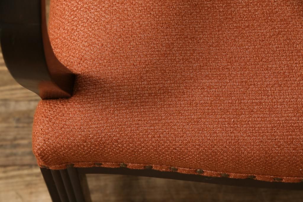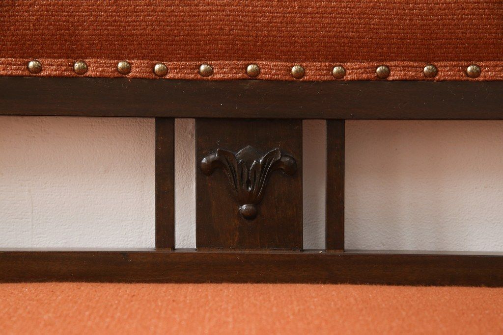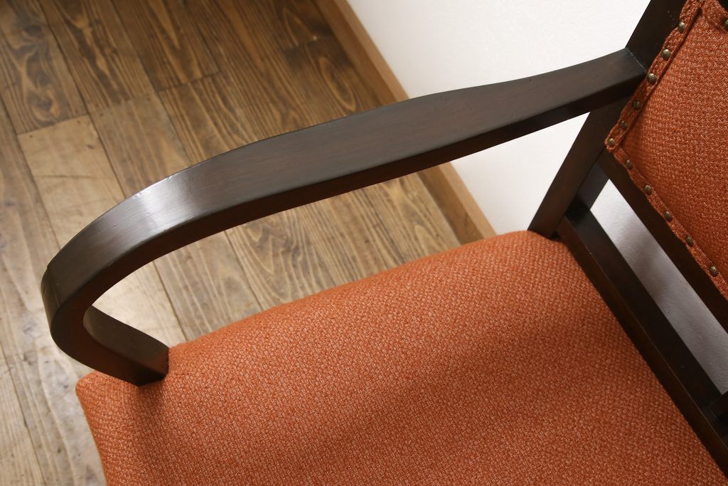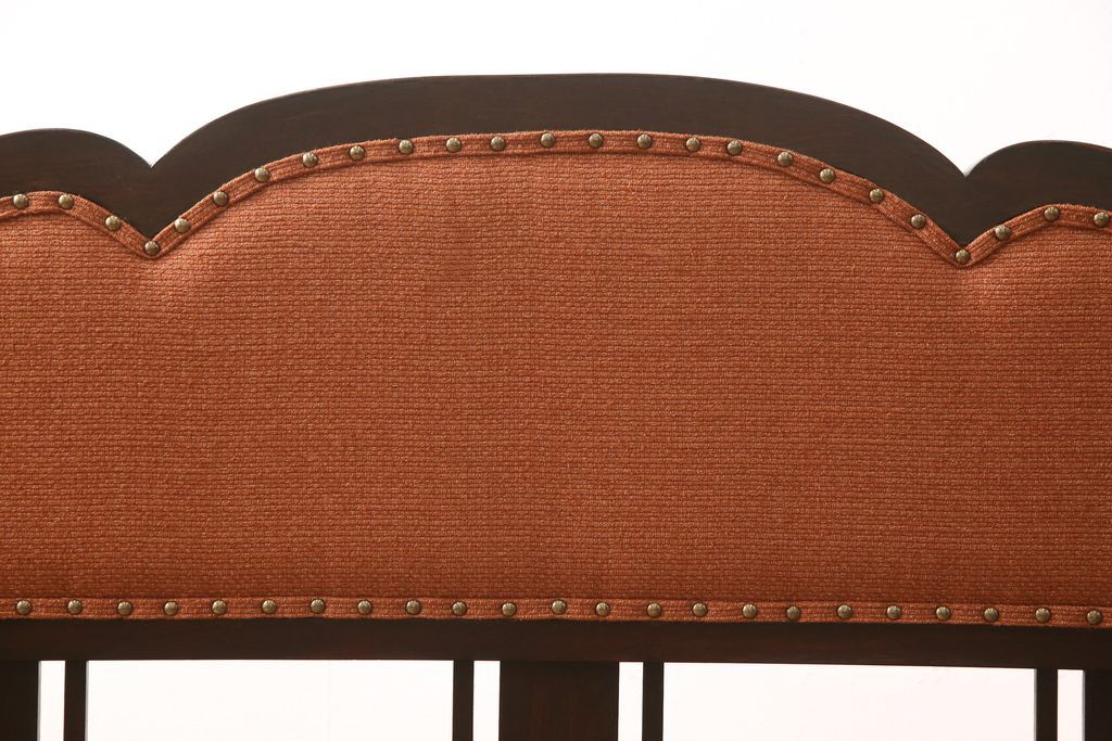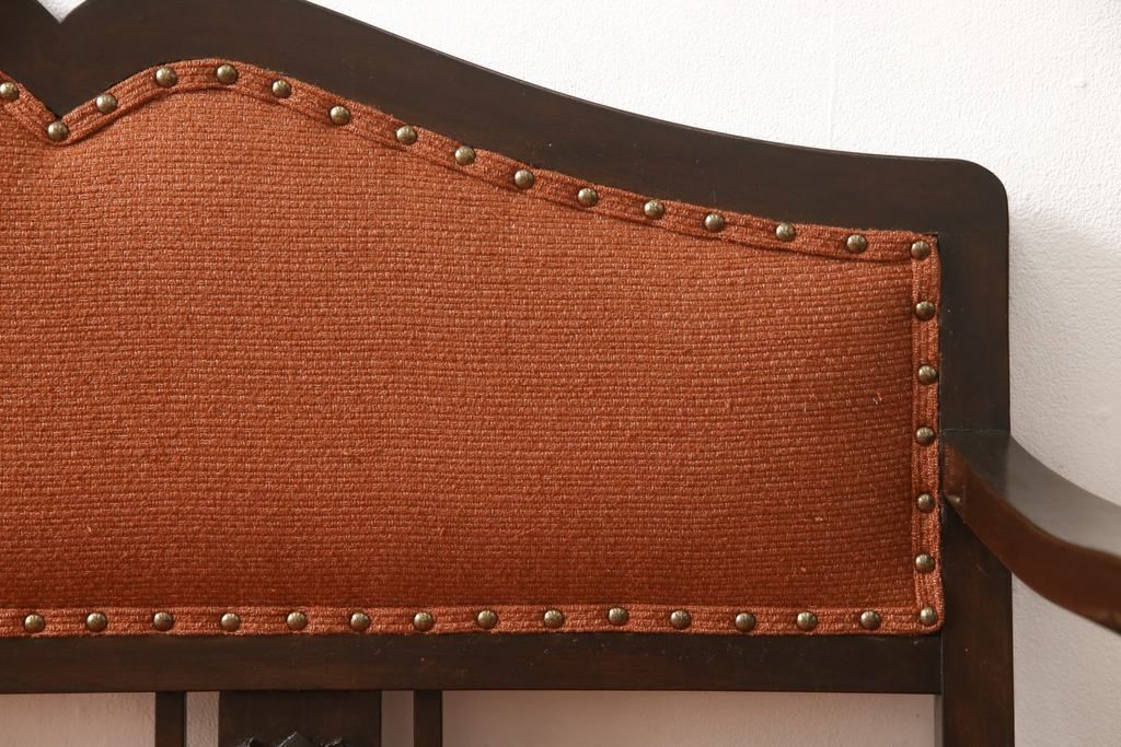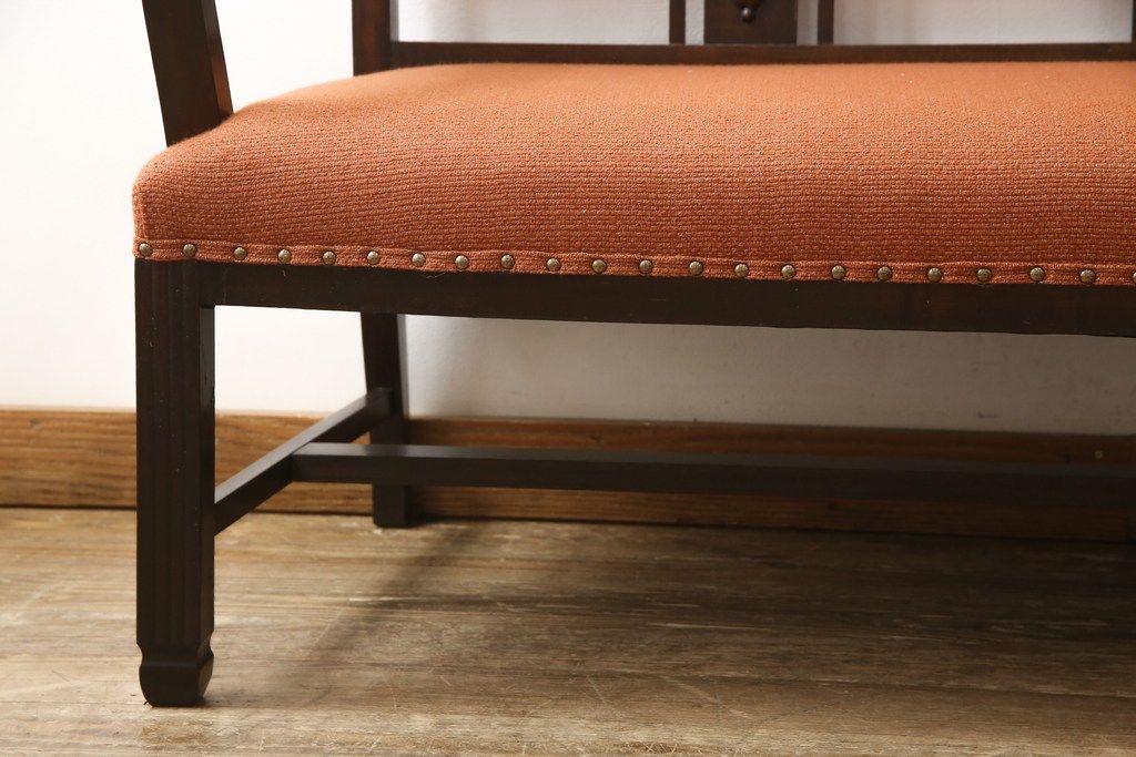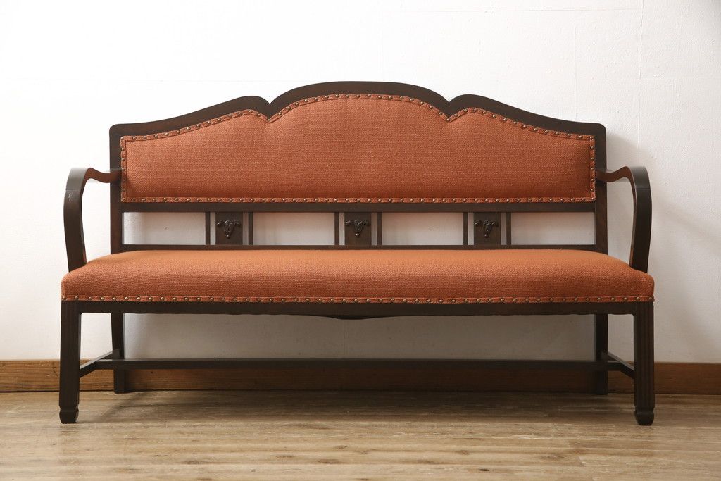 椅子・ベンチ> ベンチ > 2人掛けアームソファをリペア&カスタム!ご希望の生地で座面を張り替え、クッションを硬めに仕上げ、鋲を交換。木製部分の色味は現状をベースにして1トーン程落ち着いた色味に着色。(二人掛け、ベンチ)