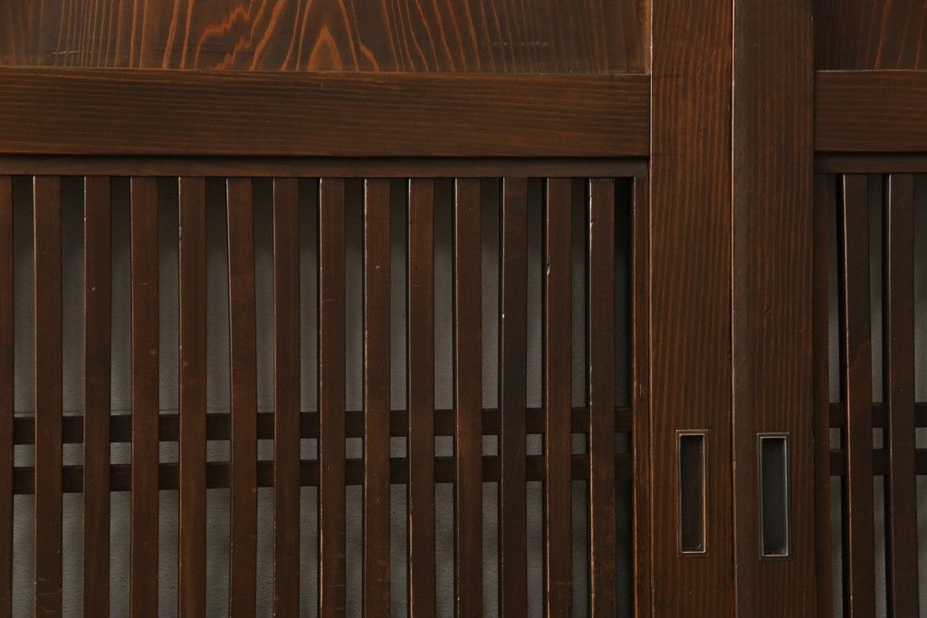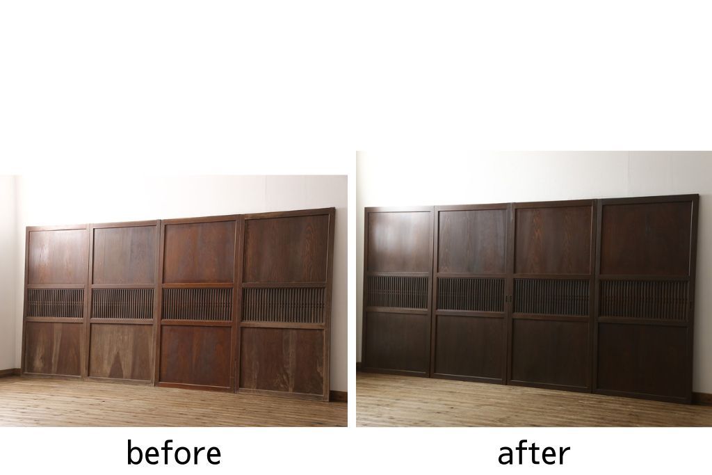 ラフジュ工房> セミオーダー家具実績 > 格子帯戸4枚をリペア&カスタム!葵戸引手を取り付け、色味は当店商品を参考に着色。(板戸、引き戸、建具)