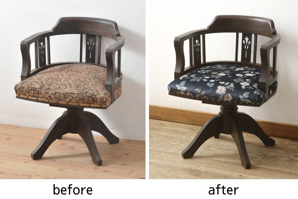 ドクターチェアをリペア&カスタム!お好みの生地と座面に張り替え、鋲を交換。本体は現状のお品物に合わせて1トーン程落ち着いた色に着色。(回転椅子、イス)