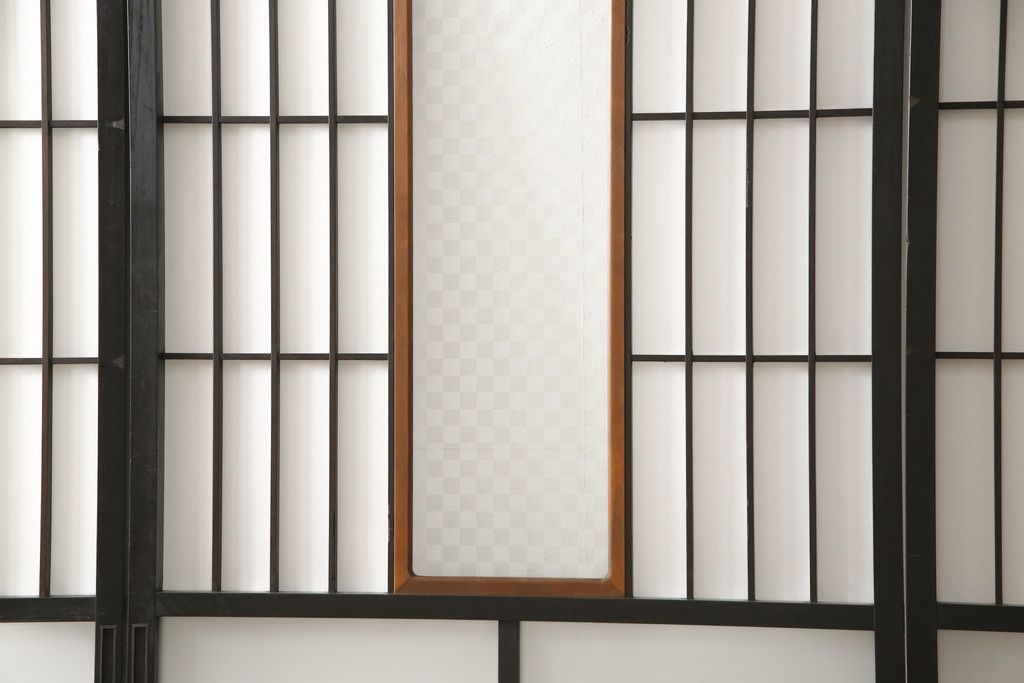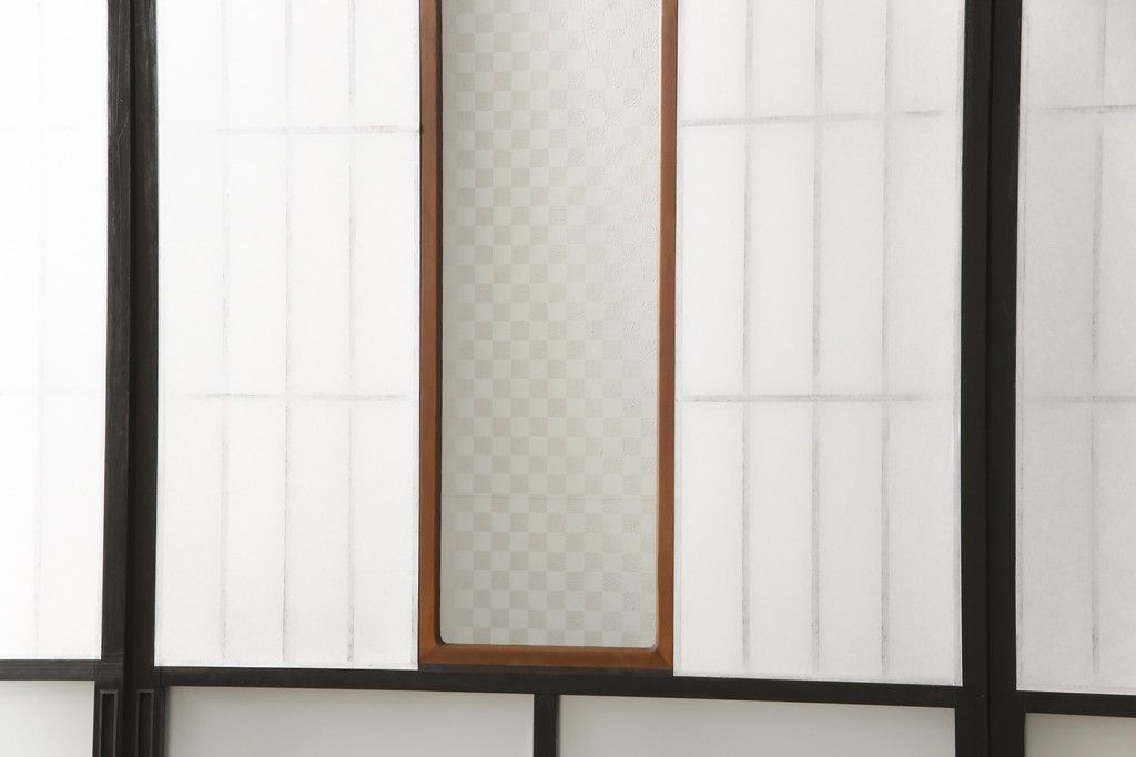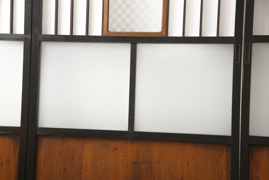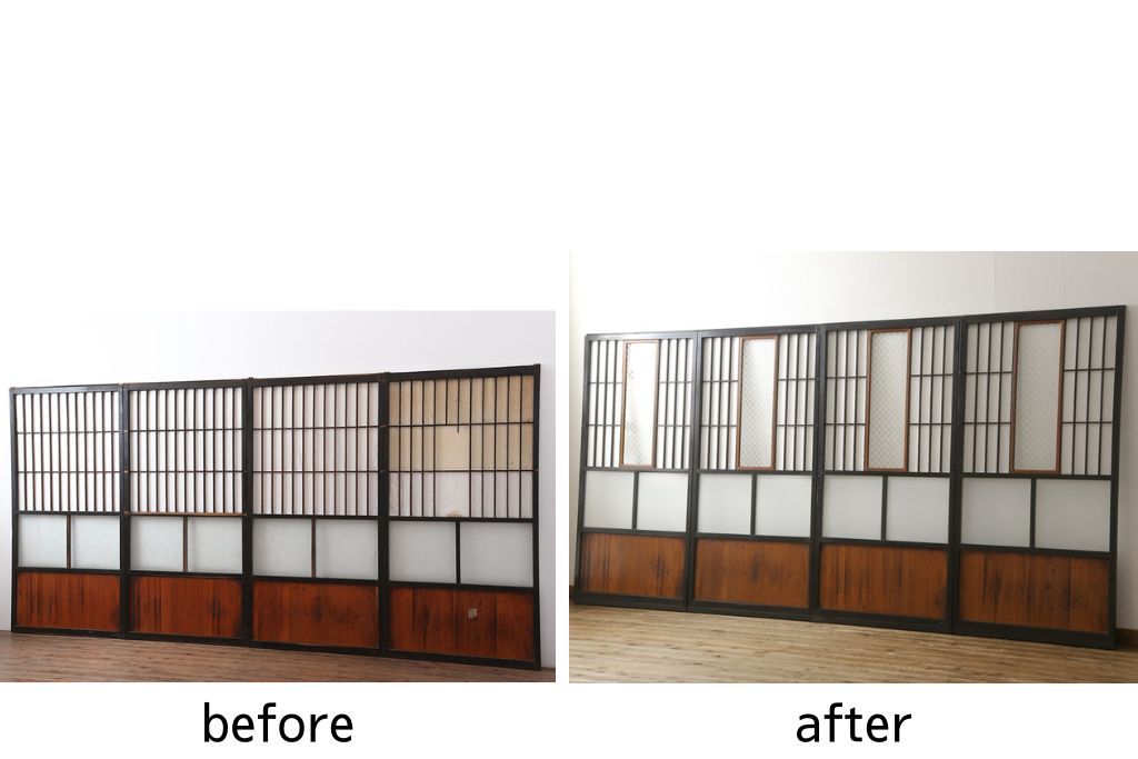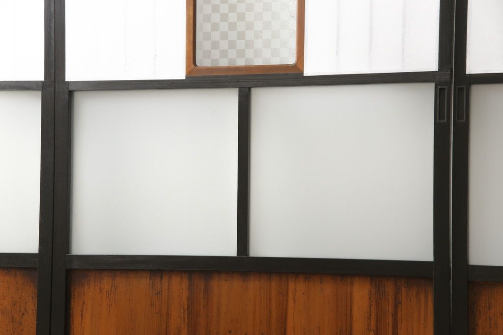 障子戸4枚をリペア&カスタム!格子部の中央を市松紋様ガラスに変更し、下段の2マスはすりガラスへ差し替え。既存の障子をプラスチック障子紙に張り替え、葵戸引手、戸車を取り付け。現状に合わせて1トーン程落ち着いた色に着色。(引き戸、建具)