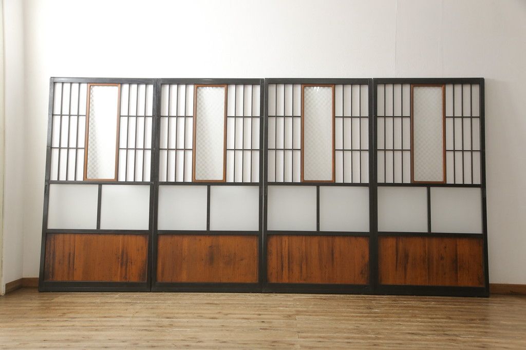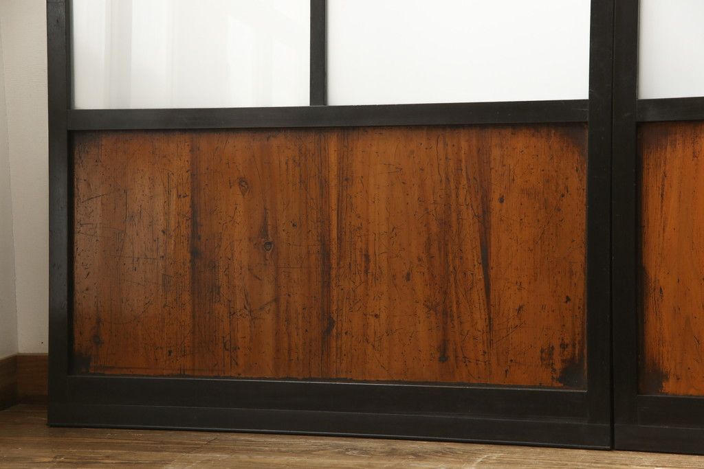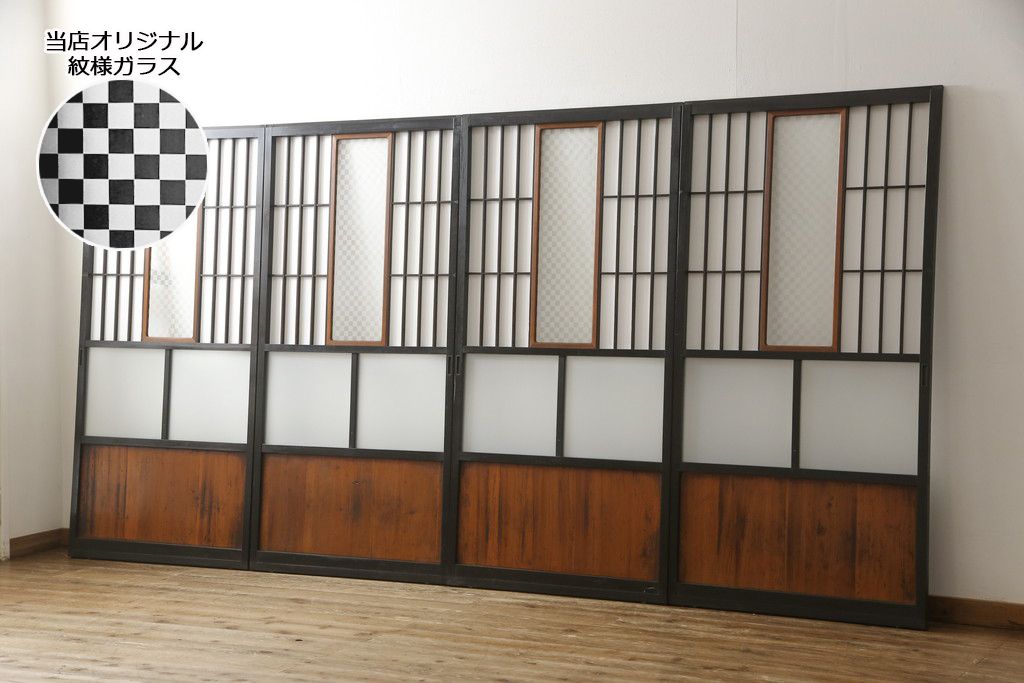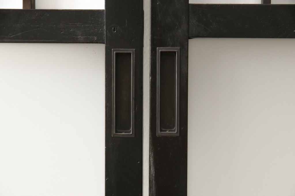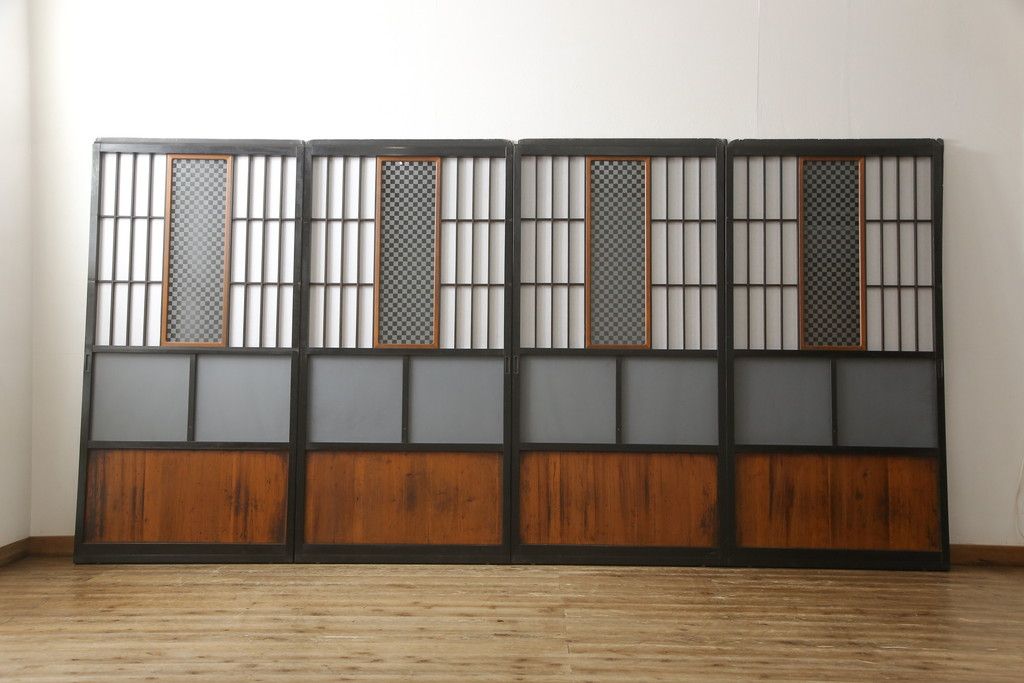 ドア・建具> 板戸・帯戸 > 障子戸4枚をリペア&カスタム!格子部の中央を市松紋様ガラスに変更し、下段の2マスはすりガラスへ差し替え。既存の障子をプラスチック障子紙に張り替え、葵戸引手、戸車を取り付け。現状に合わせて1トーン程落ち着いた色に着色。(引き戸、建具)
