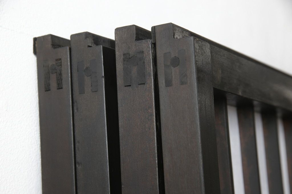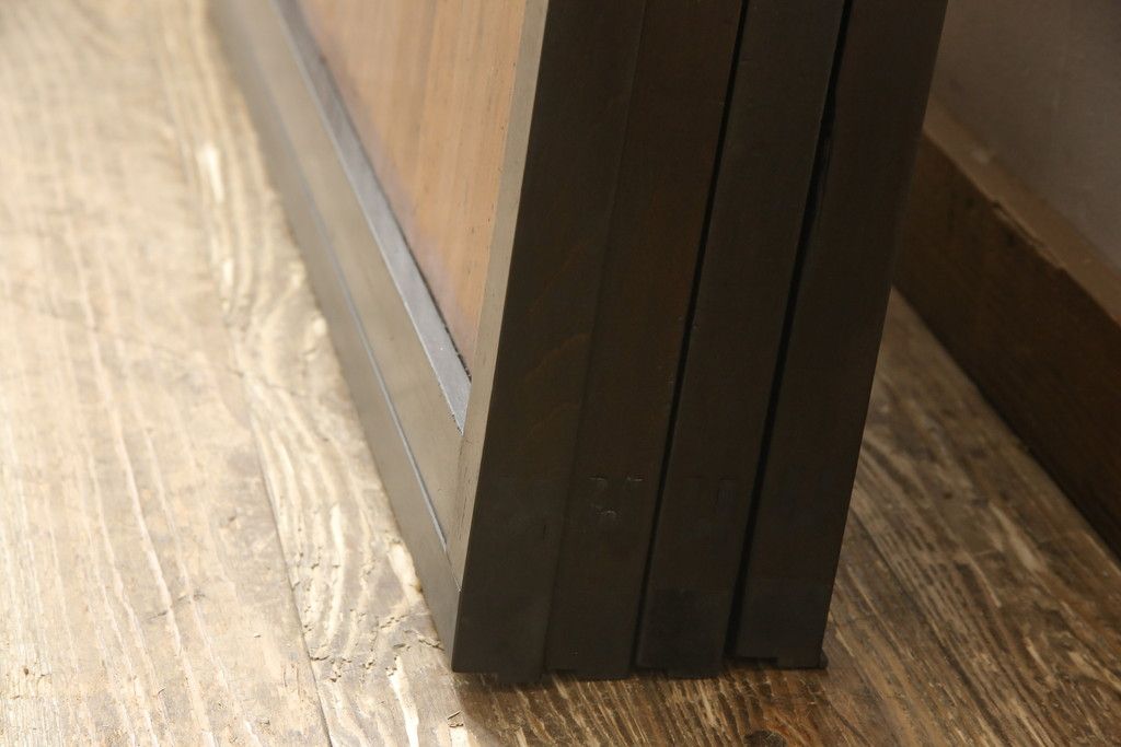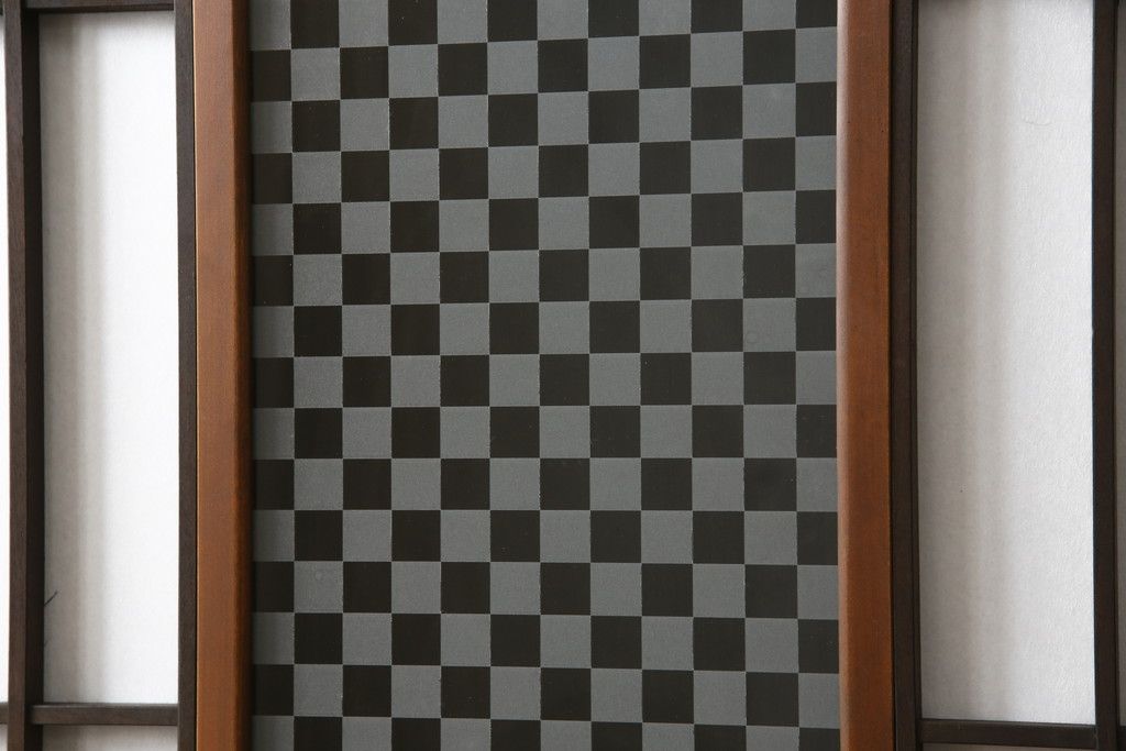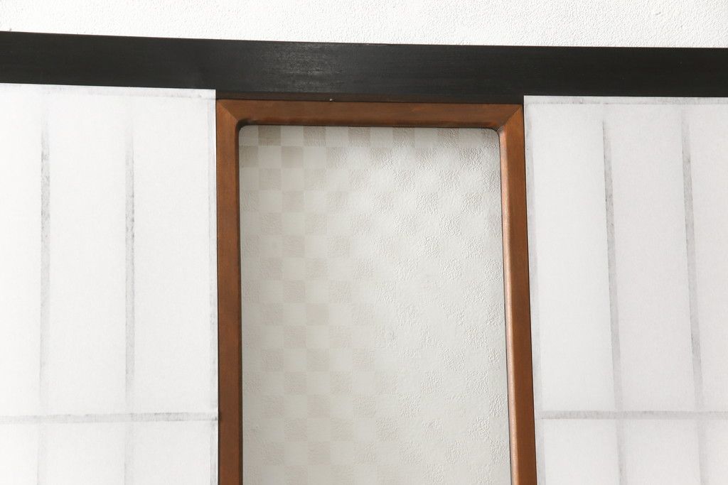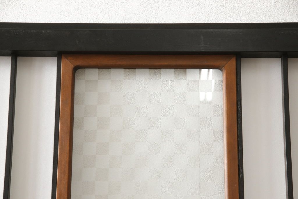 セミオーダー家具実績 > 障子戸4枚をリペア&カスタム!格子部の中央を市松紋様ガラスに変更し、下段の2マスはすりガラスへ差し替え。既存の障子をプラスチック障子紙に張り替え、葵戸引手、戸車を取り付け。現状に合わせて1トーン程落ち着いた色に着色。(引き戸、建具)