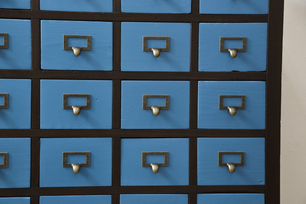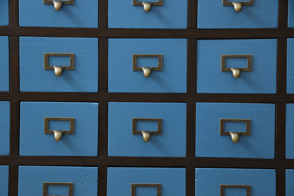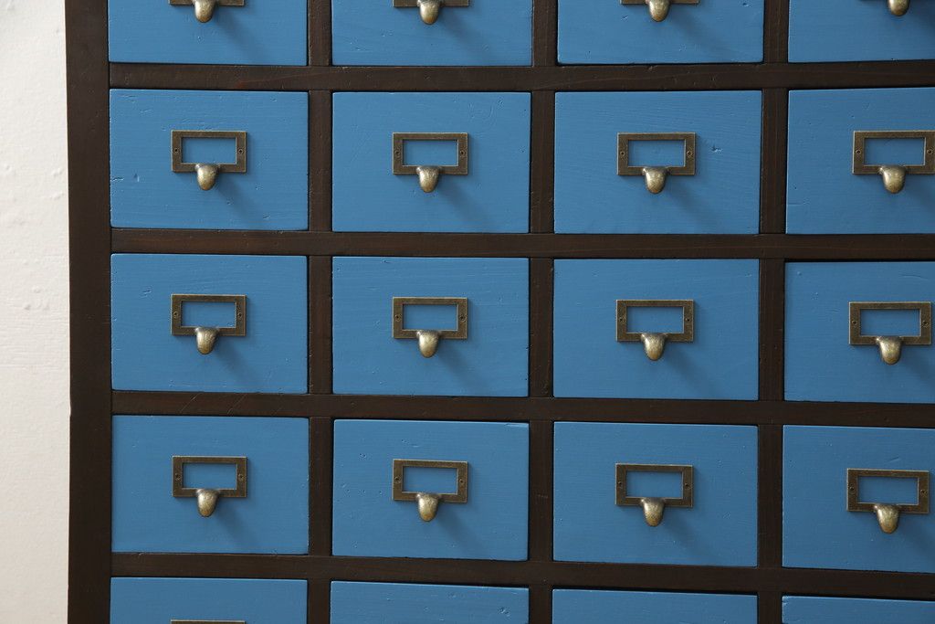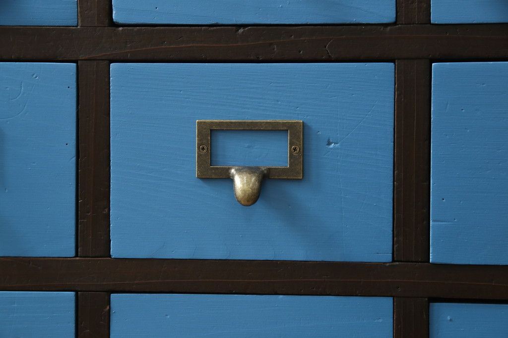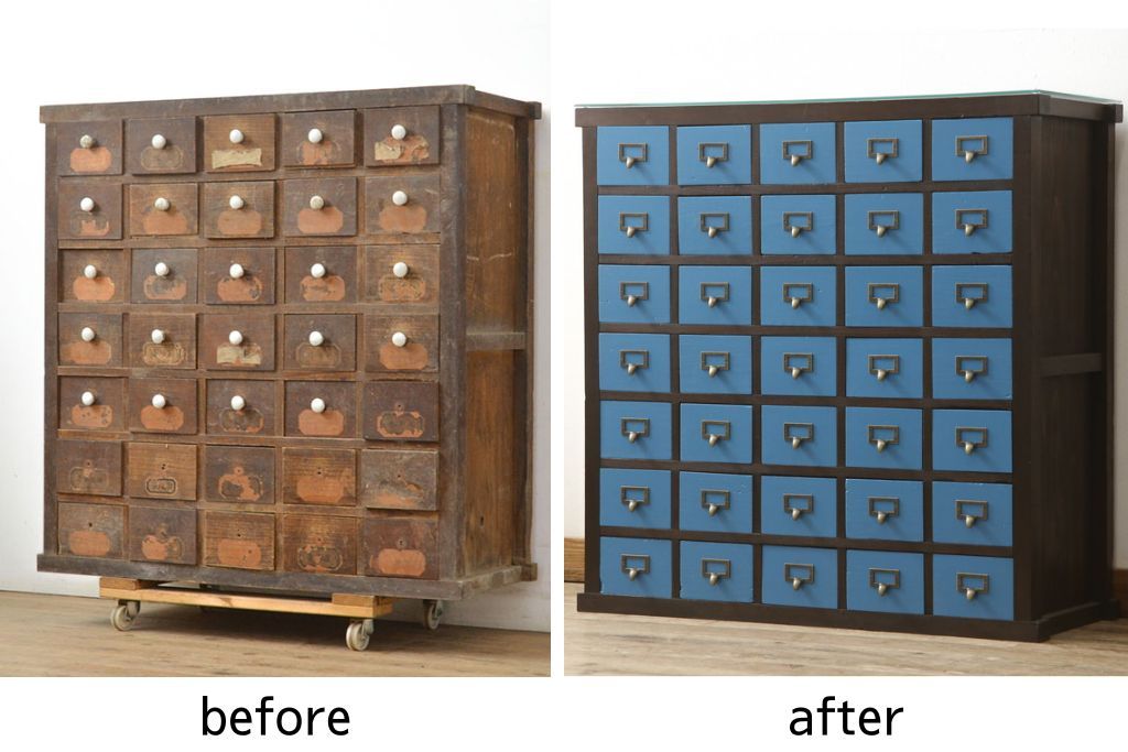 薬箪笥をリペア&カスタム!ネームプレート、強化ガラスの天板取り付け。引き出し前板は青色に、本体は当店オーダー家具を参考に着色。(引き出し、チェスト、ドロワー、キャビネット)