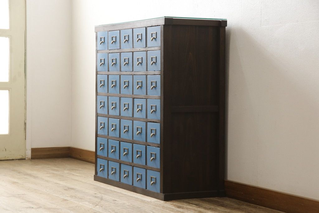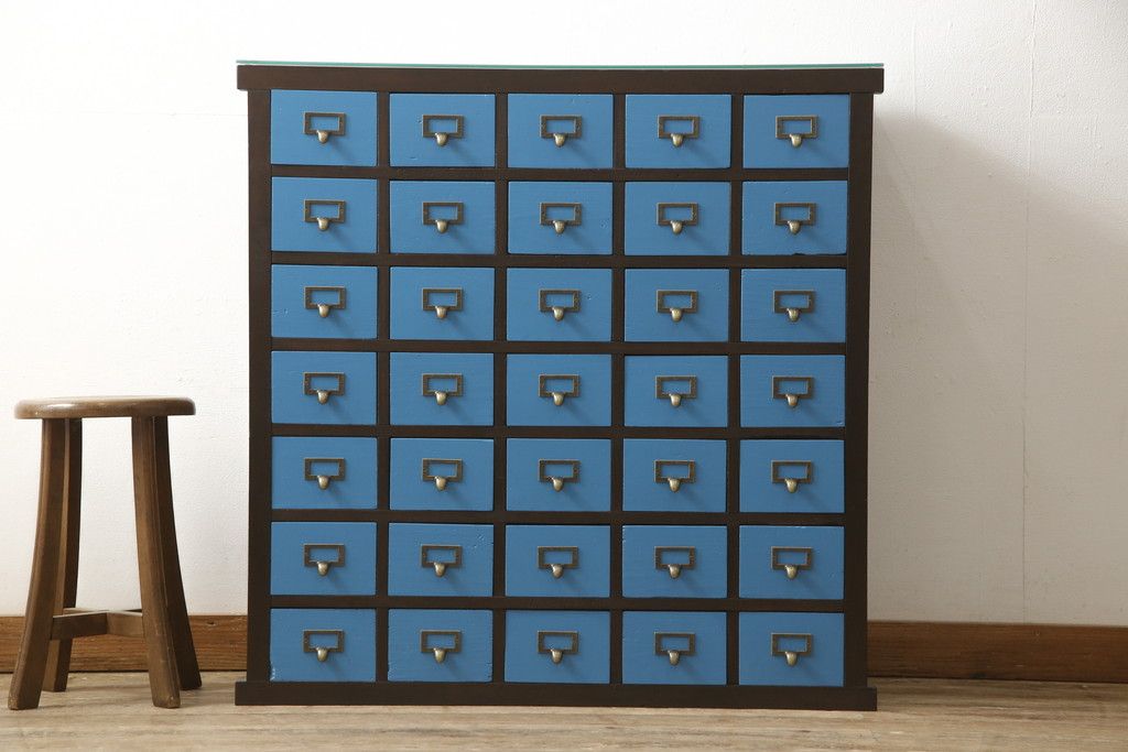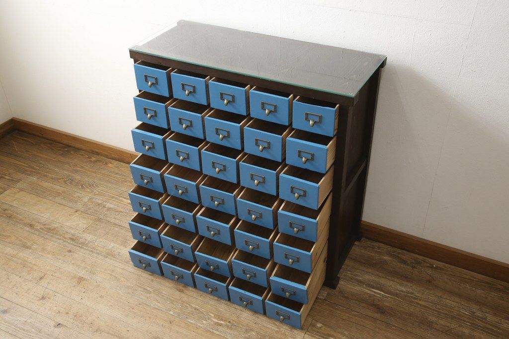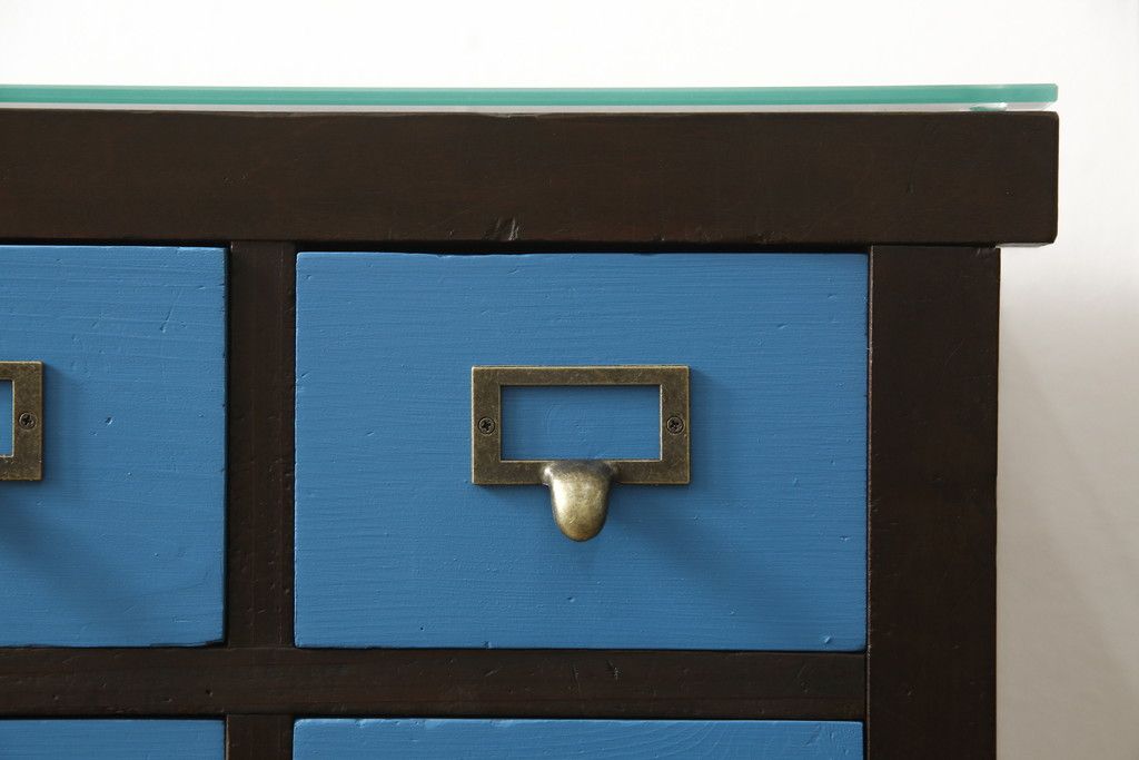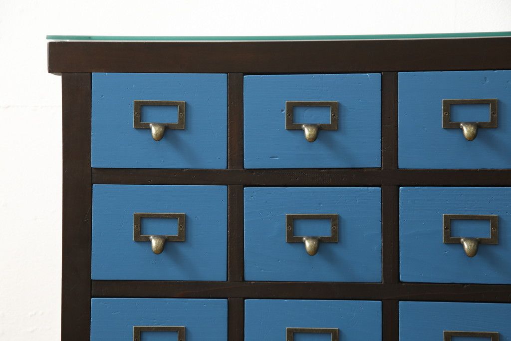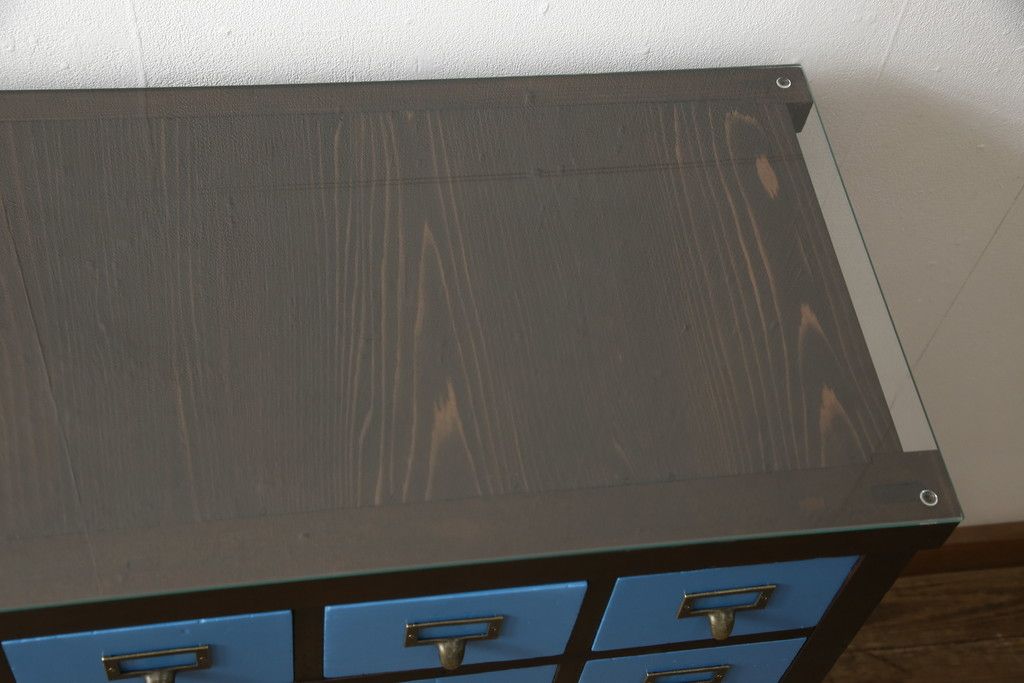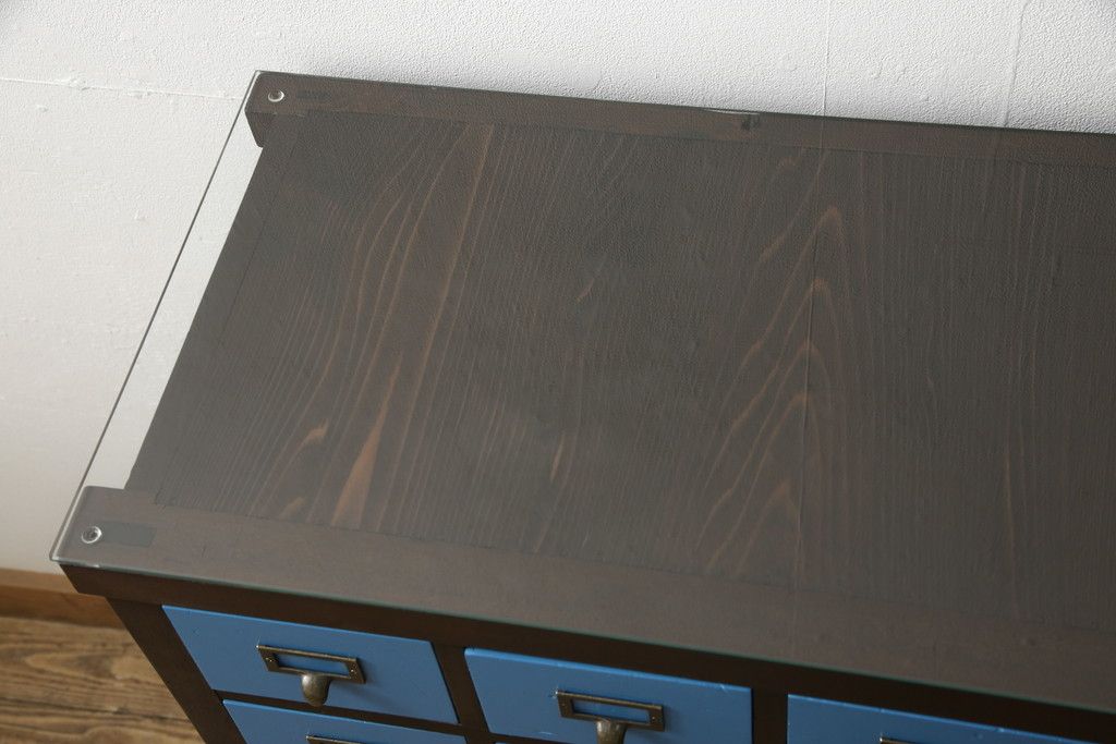 和箪笥> 薬箪笥 > 薬箪笥をリペア&カスタム!ネームプレート、強化ガラスの天板取り付け。引き出し前板は青色に、本体は当店オーダー家具を参考に着色。(引き出し、チェスト、ドロワー、キャビネット)