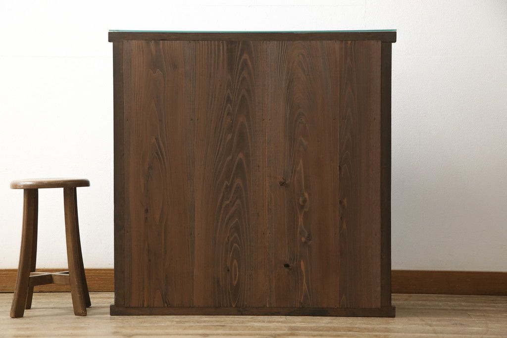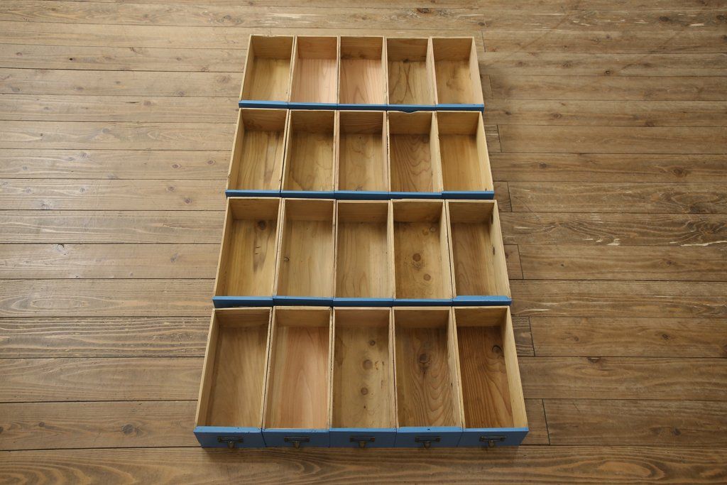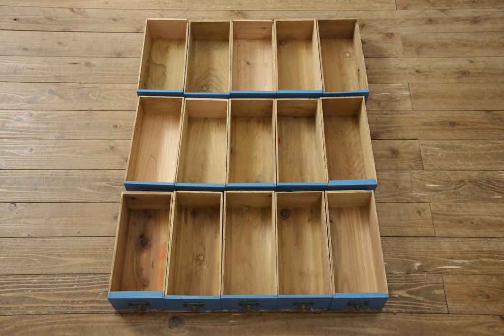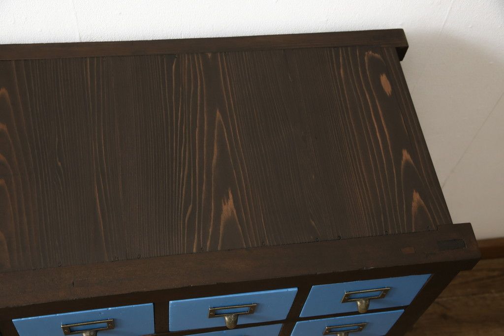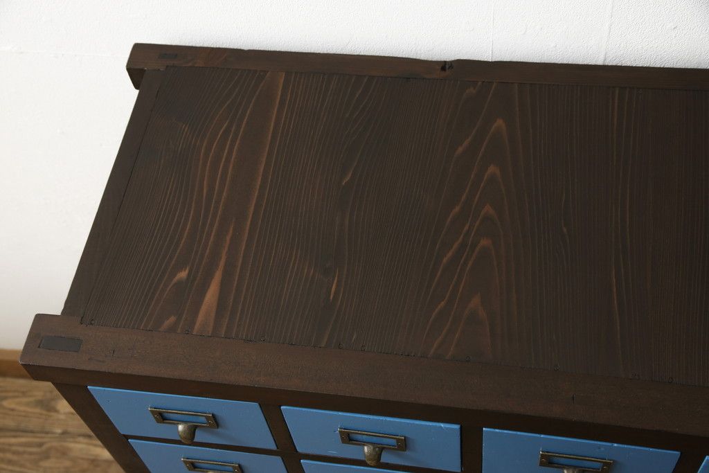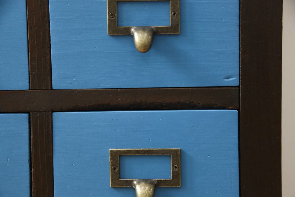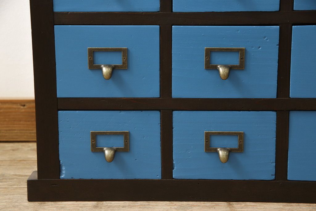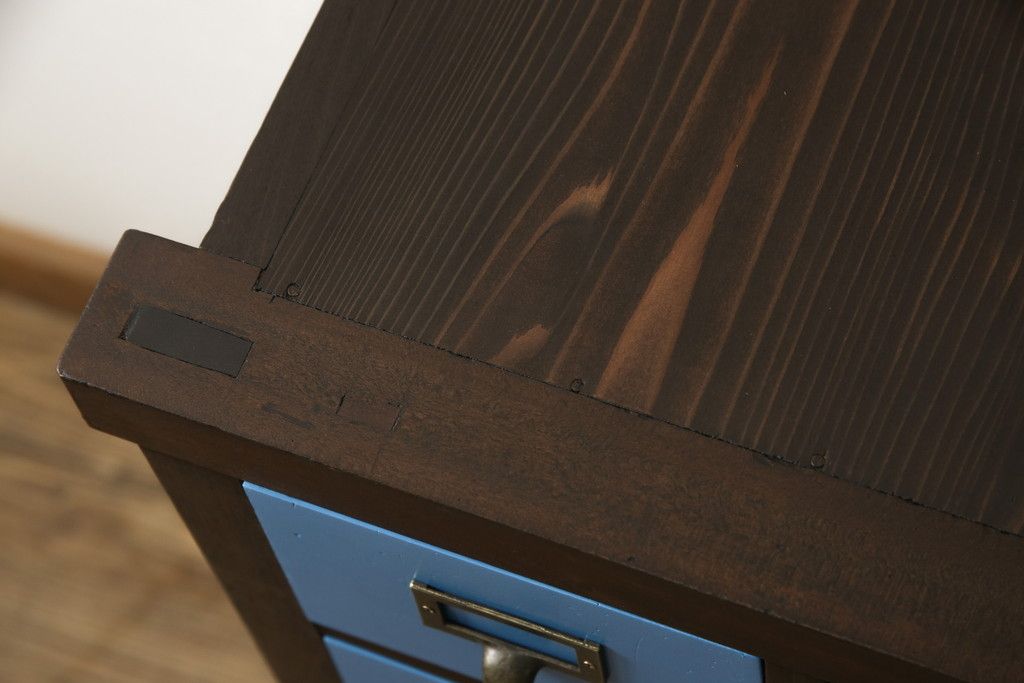 和箪笥> 薬箪笥 > 薬箪笥をリペア&カスタム!ネームプレート、強化ガラスの天板取り付け。引き出し前板は青色に、本体は当店オーダー家具を参考に着色。(引き出し、チェスト、ドロワー、キャビネット)