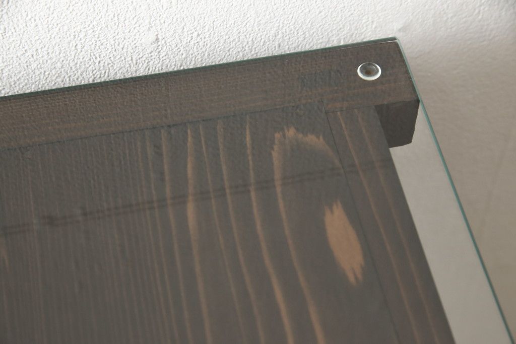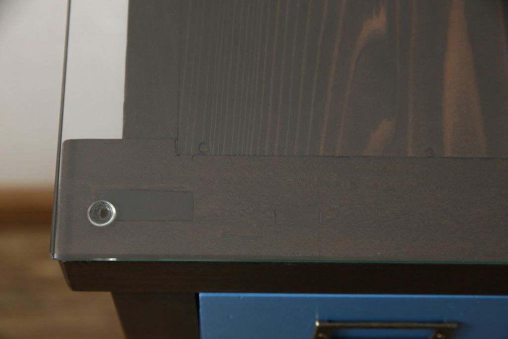 セミオーダー家具実績 > 薬箪笥をリペア&カスタム!ネームプレート、強化ガラスの天板取り付け。引き出し前板は青色に、本体は当店オーダー家具を参考に着色。(引き出し、チェスト、ドロワー、キャビネット)