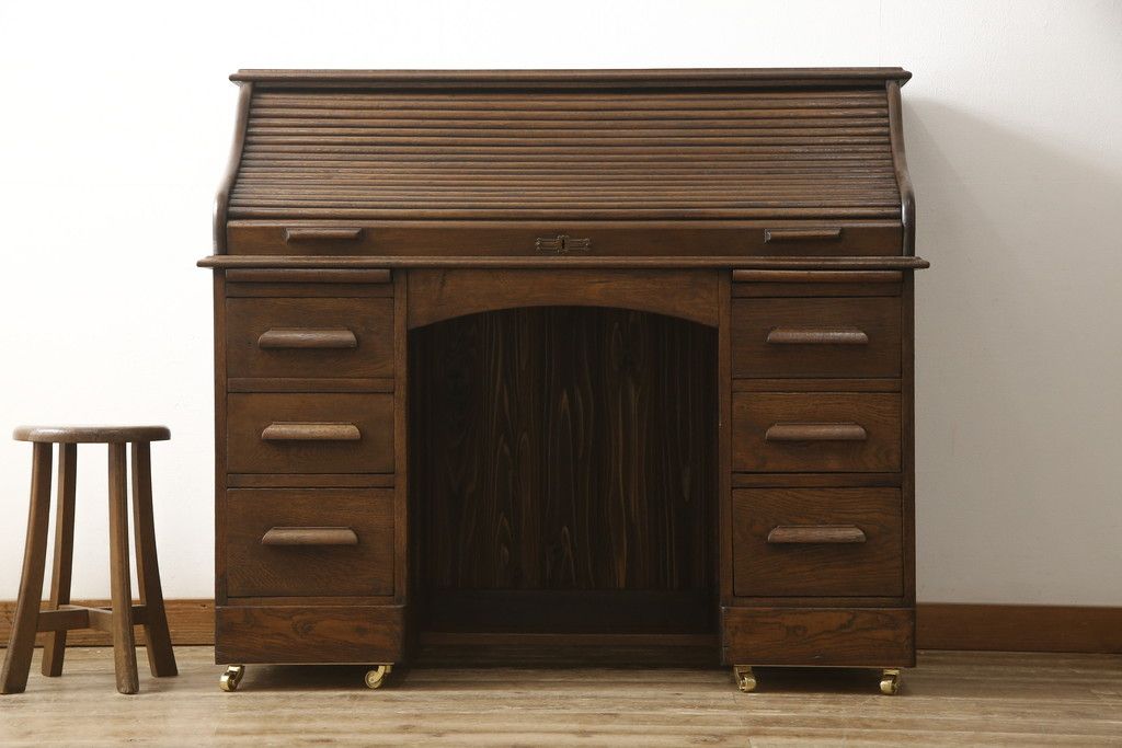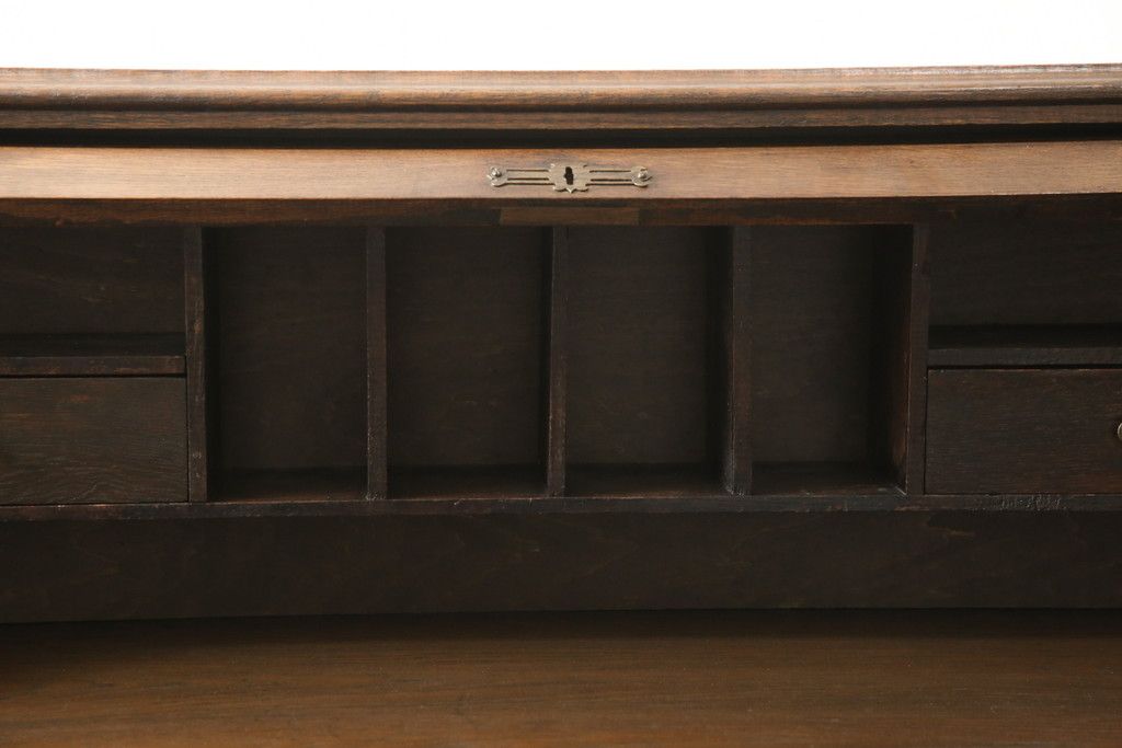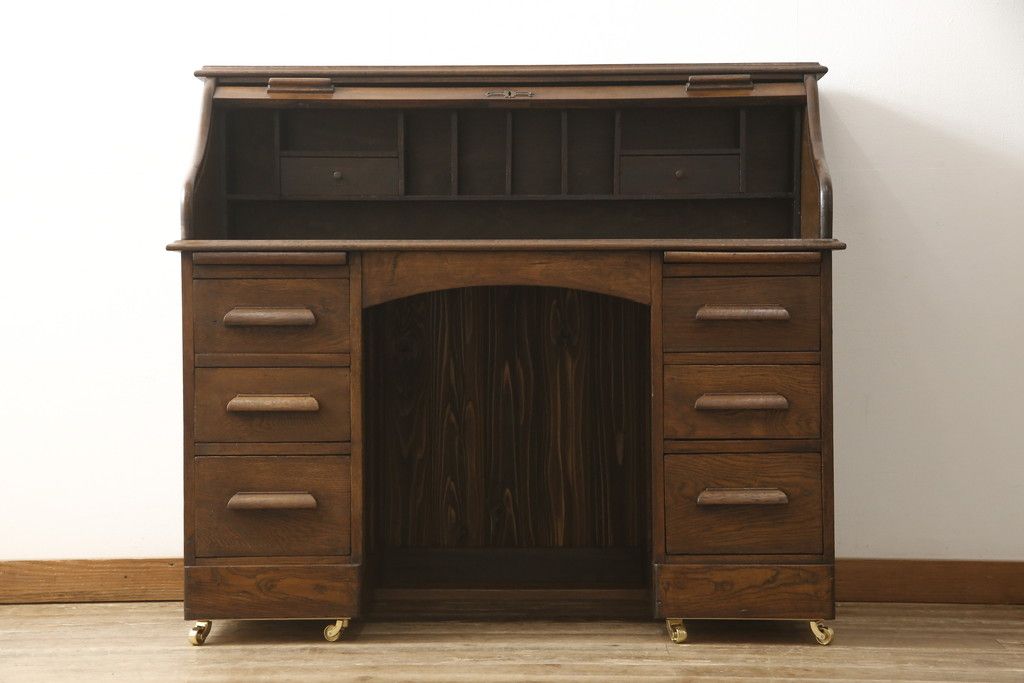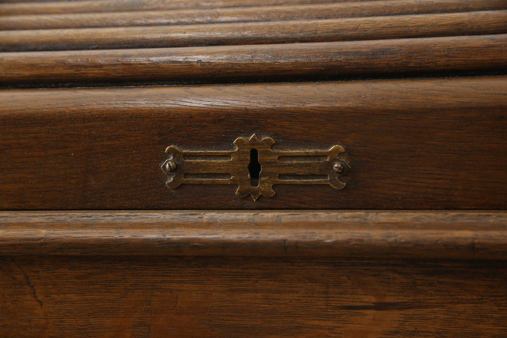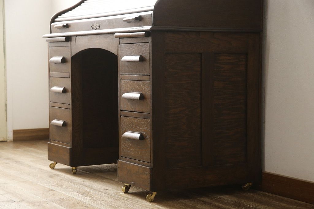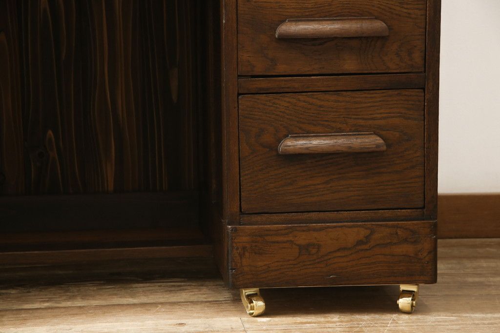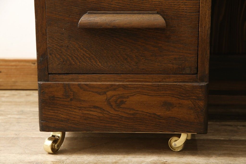 デスク> ワークデスク > ロールトップデスクをリペア&カスタム!鍵穴に埋木処置をし、背板の加工、真鍮のキャスターを取り付け。現状の雰囲気を残した色味に着色。(机、在宅ワーク、在宅用両袖机、在宅ワーク、在宅用ワークデスク)