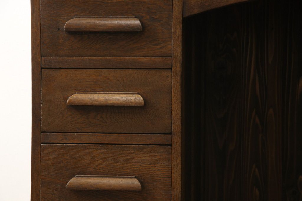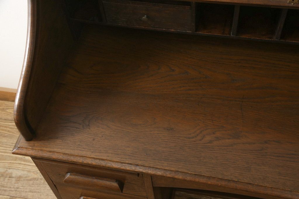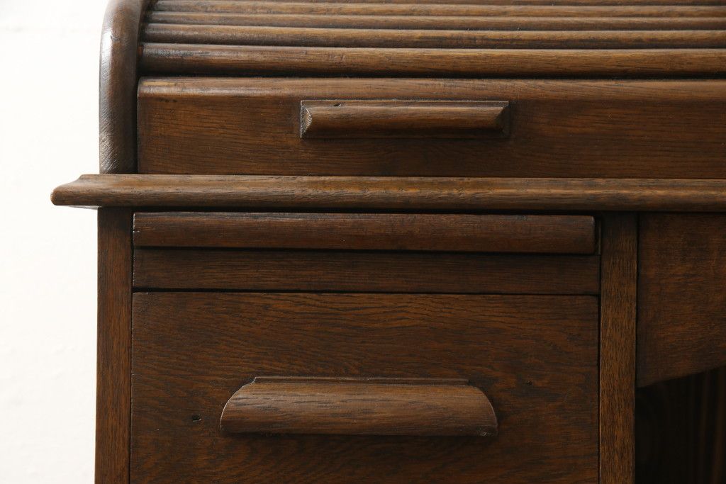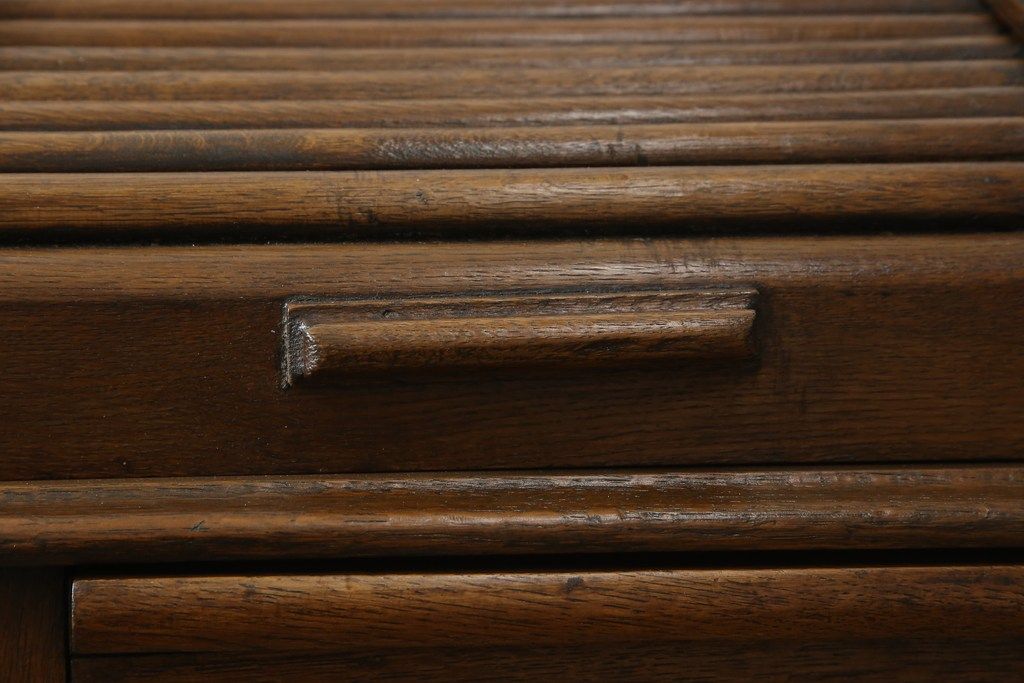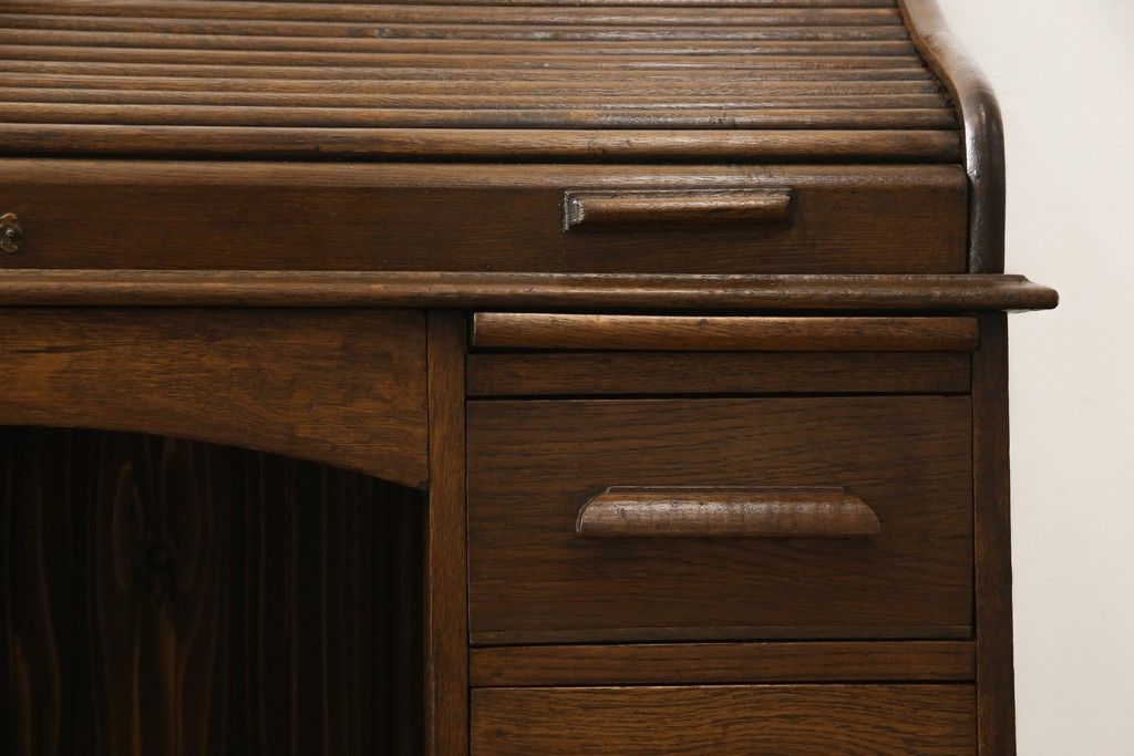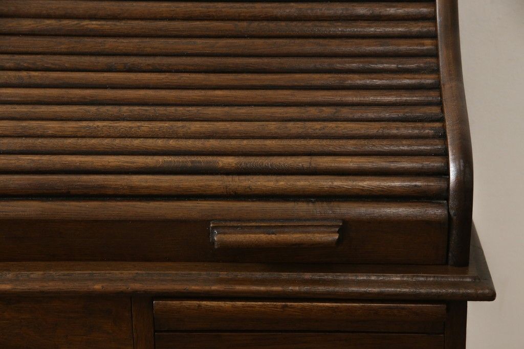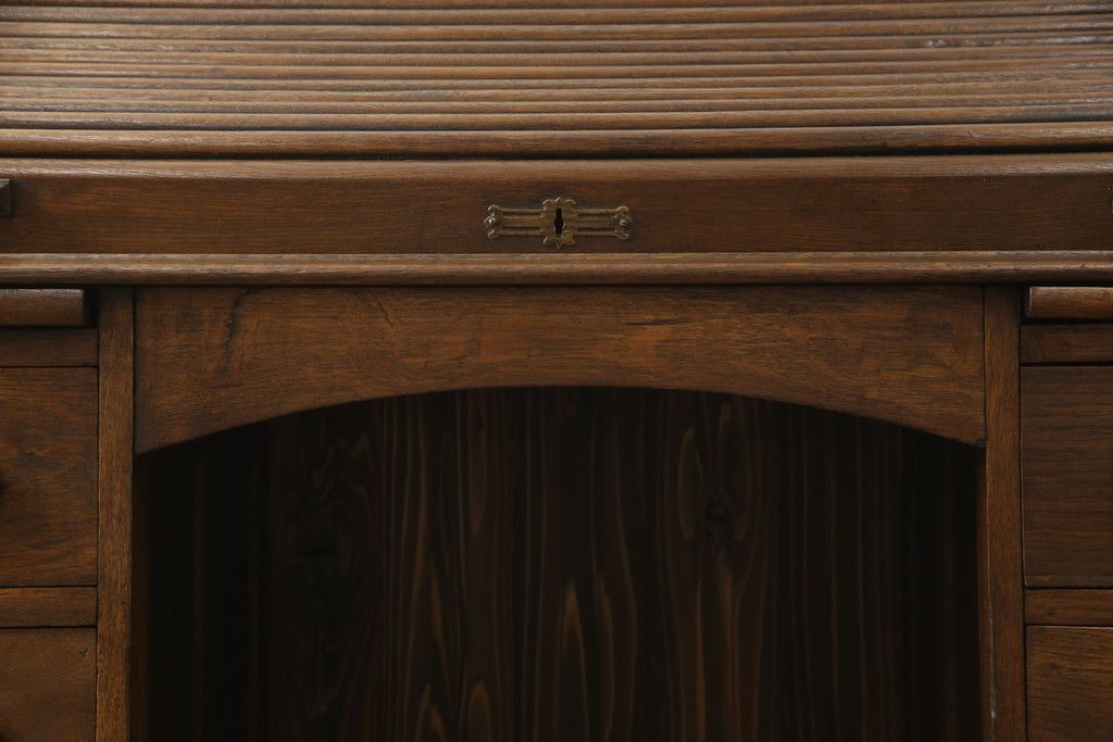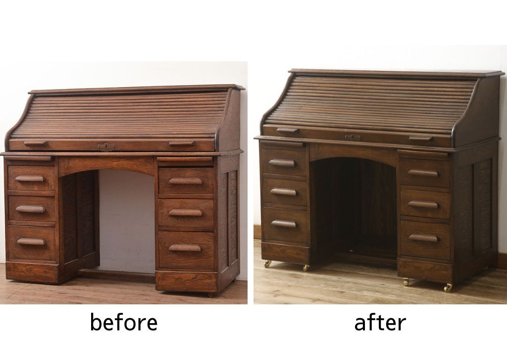 デスク> ワークデスク > ロールトップデスクをリペア&カスタム!鍵穴に埋木処置をし、背板の加工、真鍮のキャスターを取り付け。現状の雰囲気を残した色味に着色。(机、在宅ワーク、在宅用両袖机、在宅ワーク、在宅用ワークデスク)