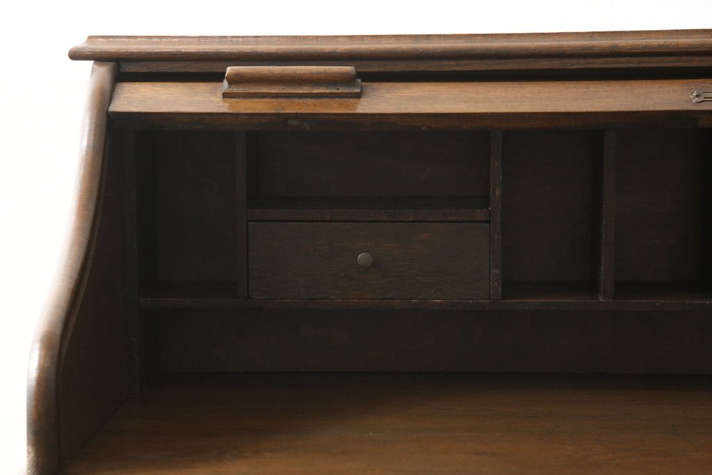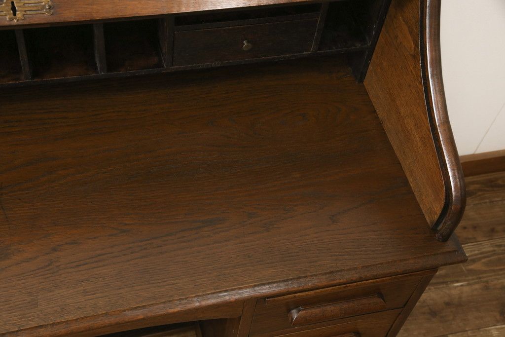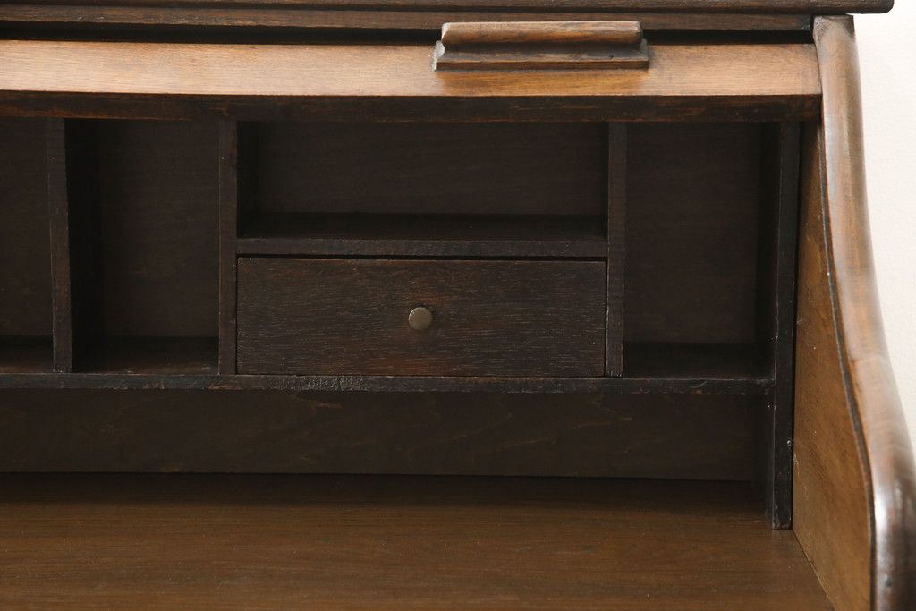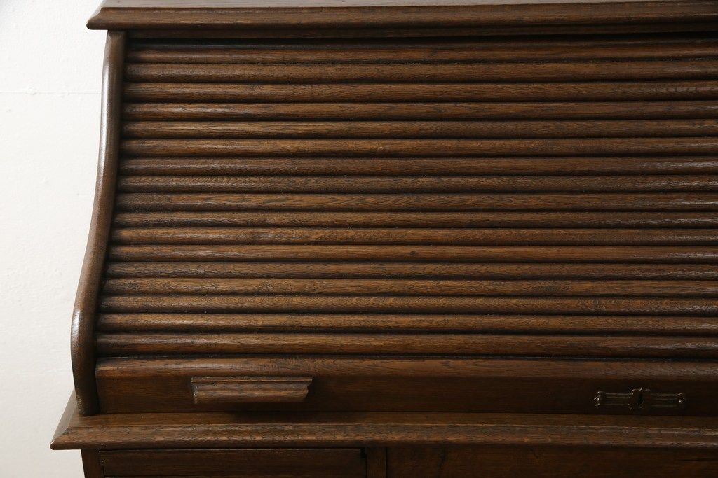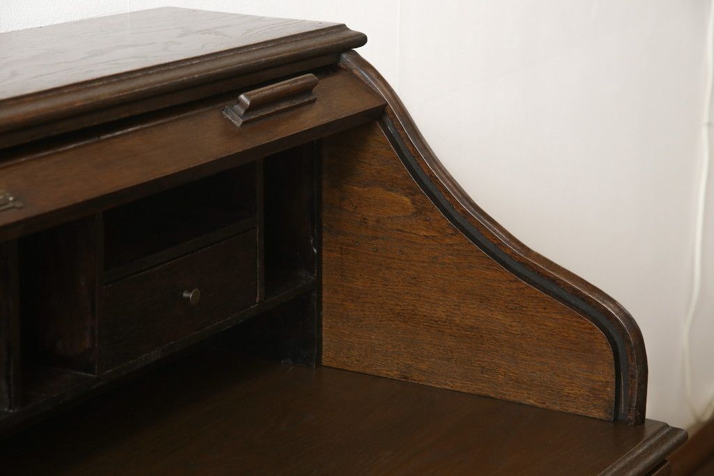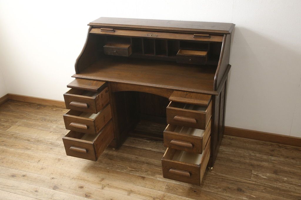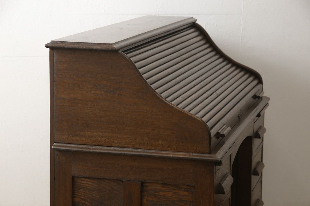 デスク> ワークデスク > ロールトップデスクをリペア&カスタム!鍵穴に埋木処置をし、背板の加工、真鍮のキャスターを取り付け。現状の雰囲気を残した色味に着色。(机、在宅ワーク、在宅用両袖机、在宅ワーク、在宅用ワークデスク)