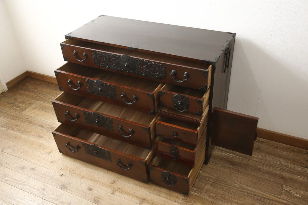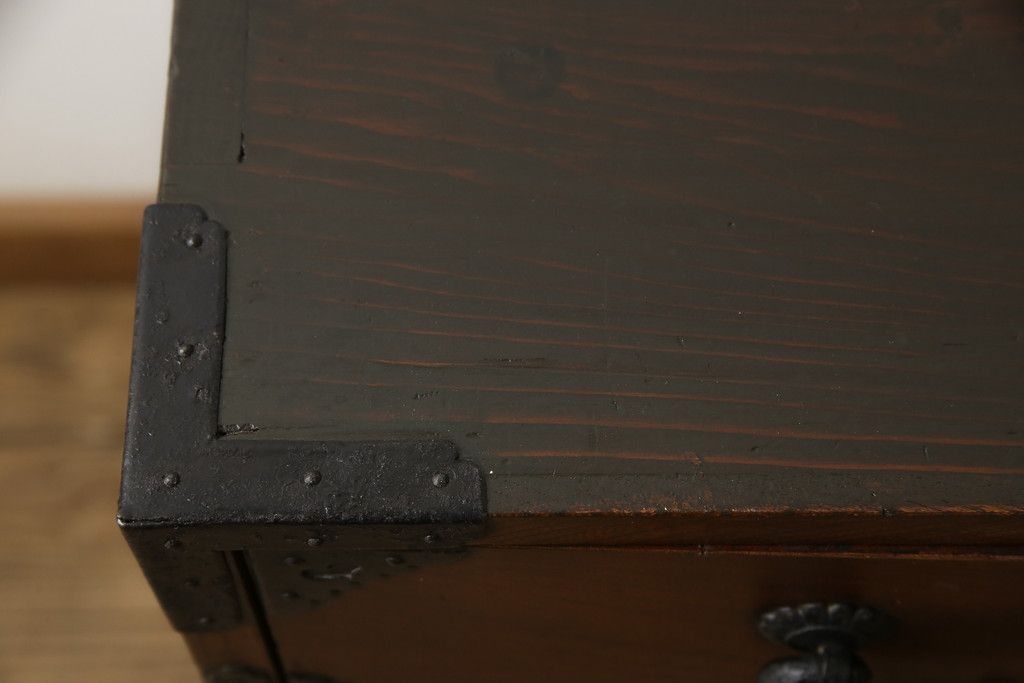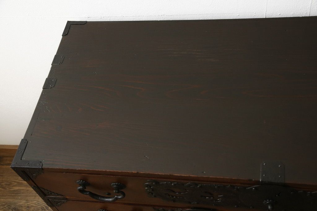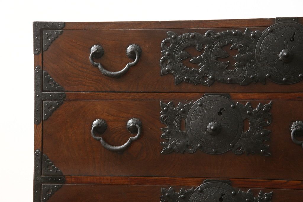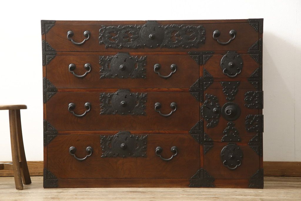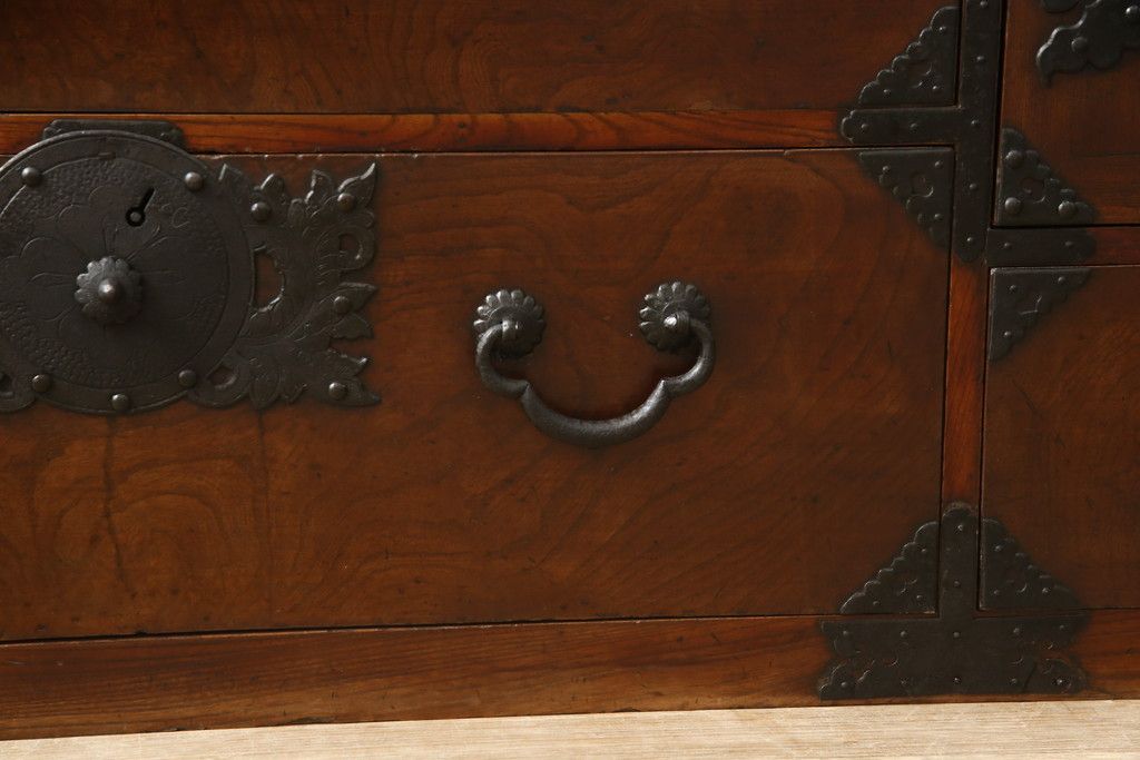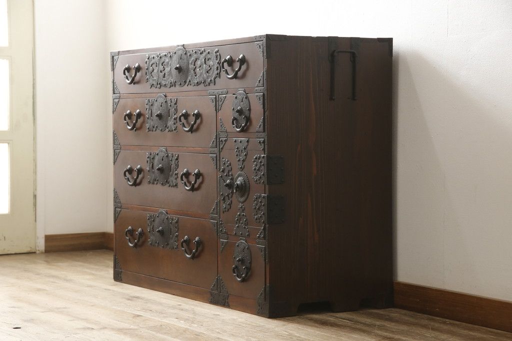 和箪笥> 衣装箪笥 > 仙台箪笥をリペア&カスタム!奥行をリサイズし、金具を交換。本体は現状のお品物に合わせて1トーン程落ち着いた色に着色し、修繕箇所を本体と馴染ませ仕上げ。(野郎箪笥、時代箪笥、衣装箪笥、和タンス)
