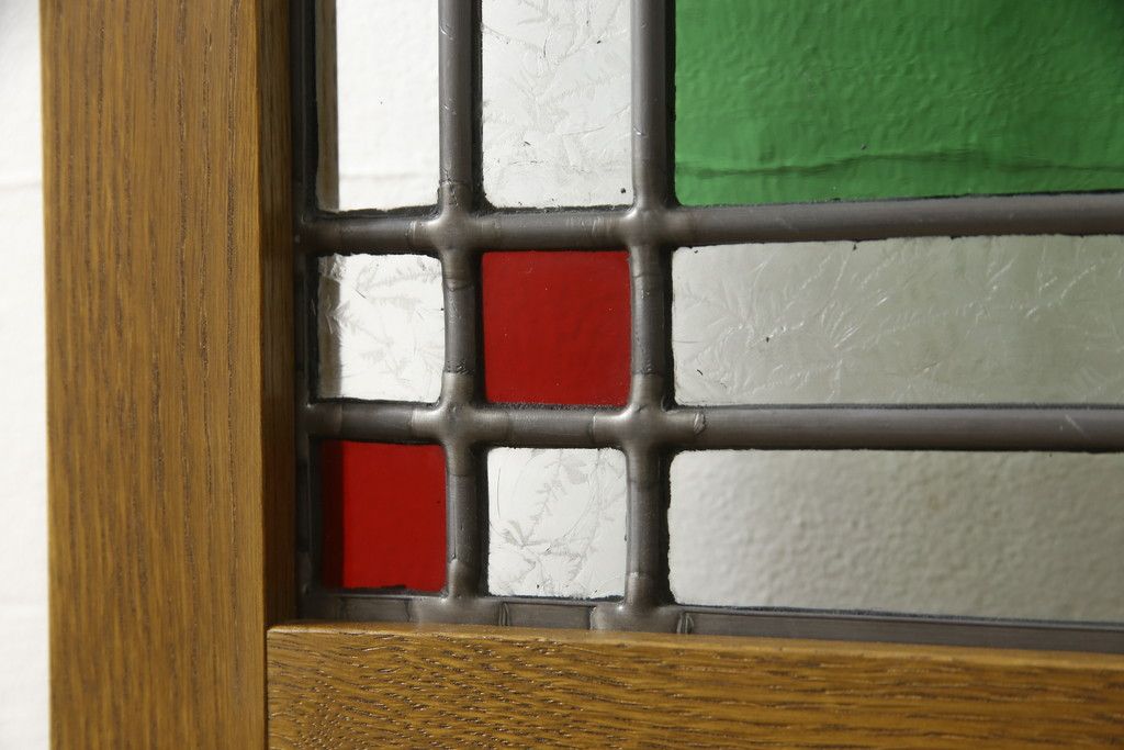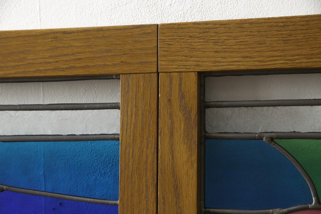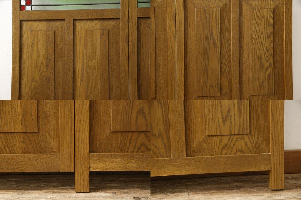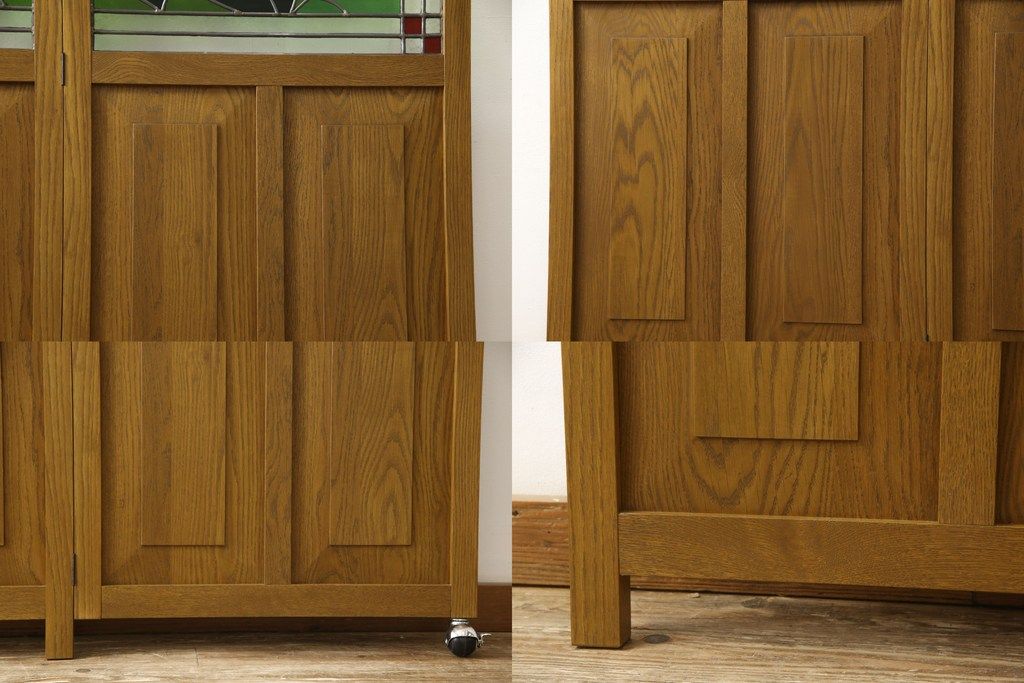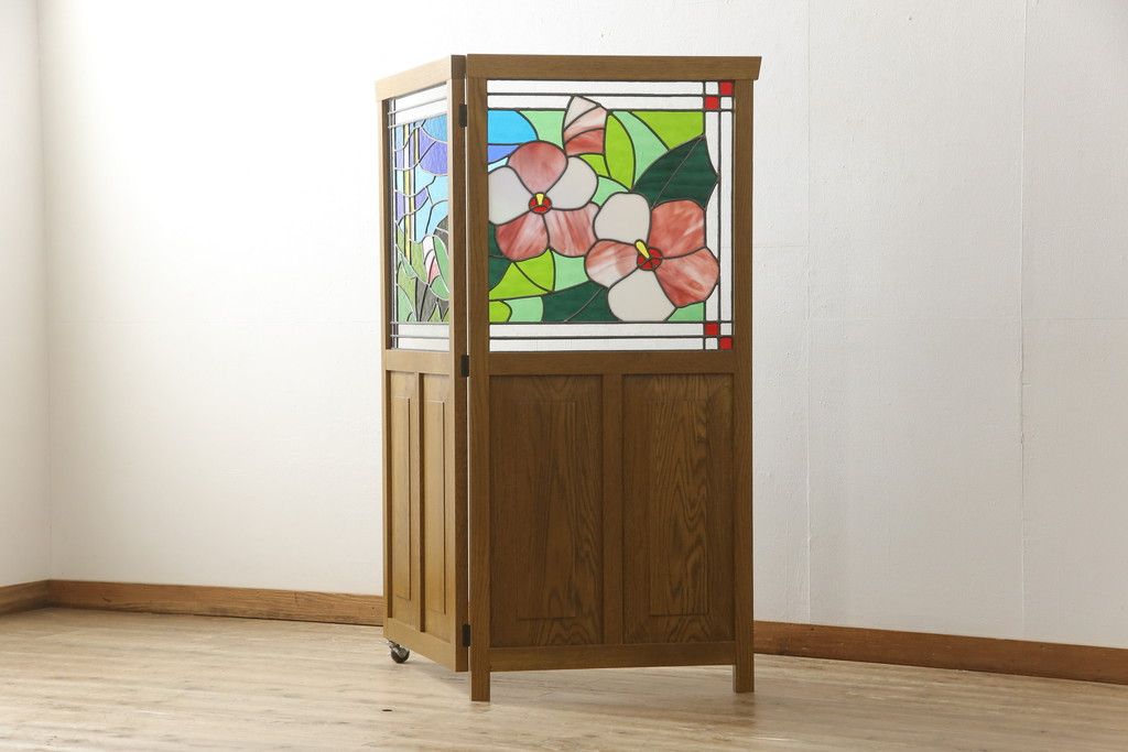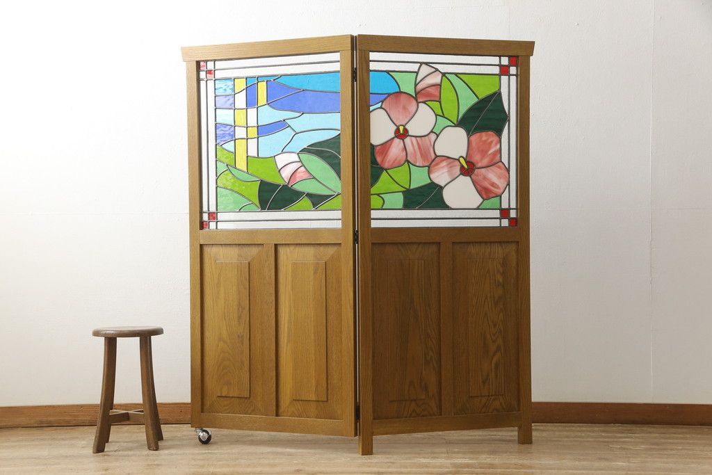 衝立・パーテーション> 折りたたみパーテーション > つい立てを新規製作!ご希望のサイズでオーク材を使用。片面は可動式仕様で、「芙蓉の花」「夏空」「日光」をモチーフにしたオリジナルのステンドグラスを取り付け。(ステンドグラス、つい立て、パーテーション、間仕切り)