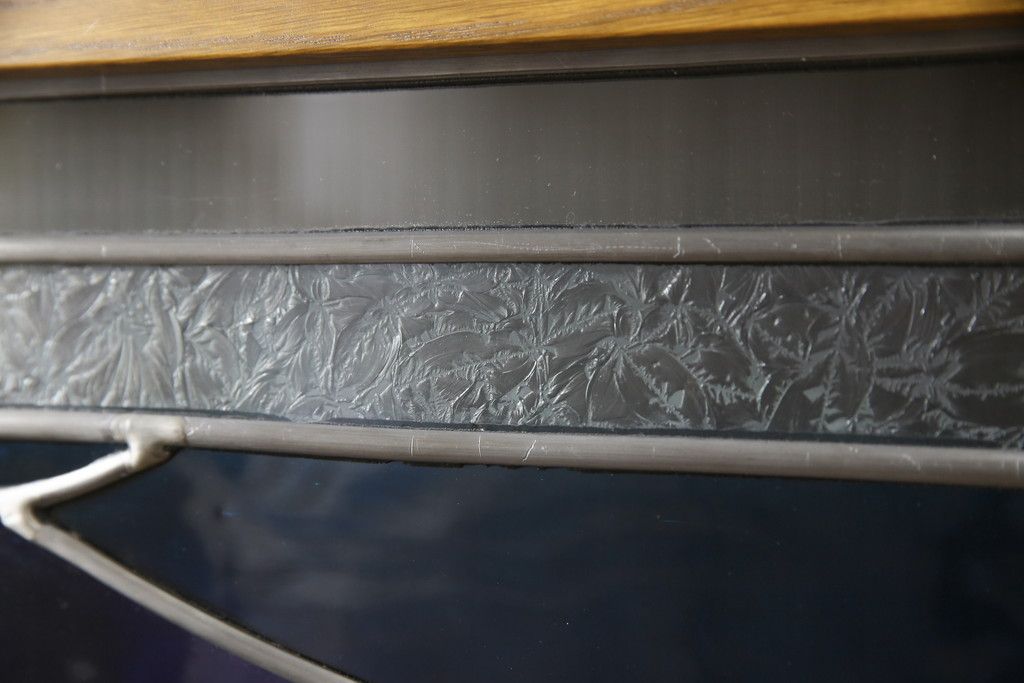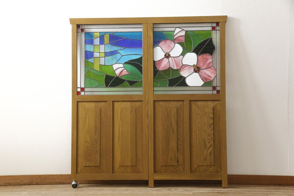つい立てを新規製作!ご希望のサイズでオーク材を使用。片面は可動式仕様で、「芙蓉の花」「夏空」「日光」をモチーフにしたオリジナルのステンドグラスを取り付け。(ステンドグラス、つい立て、パーテーション、間仕切り)
