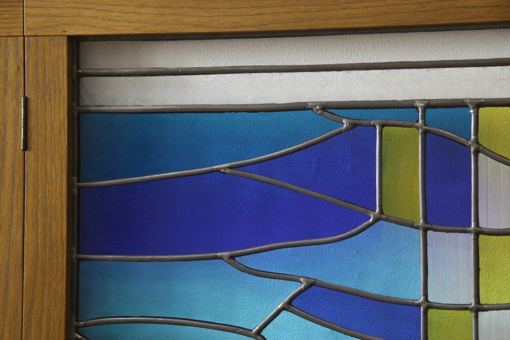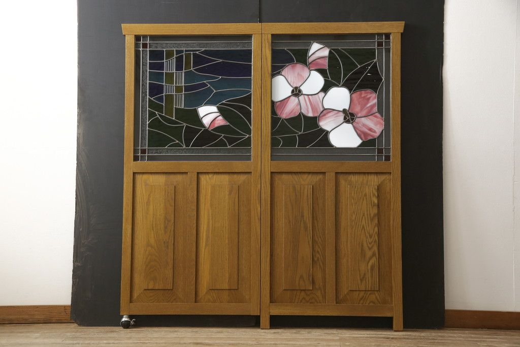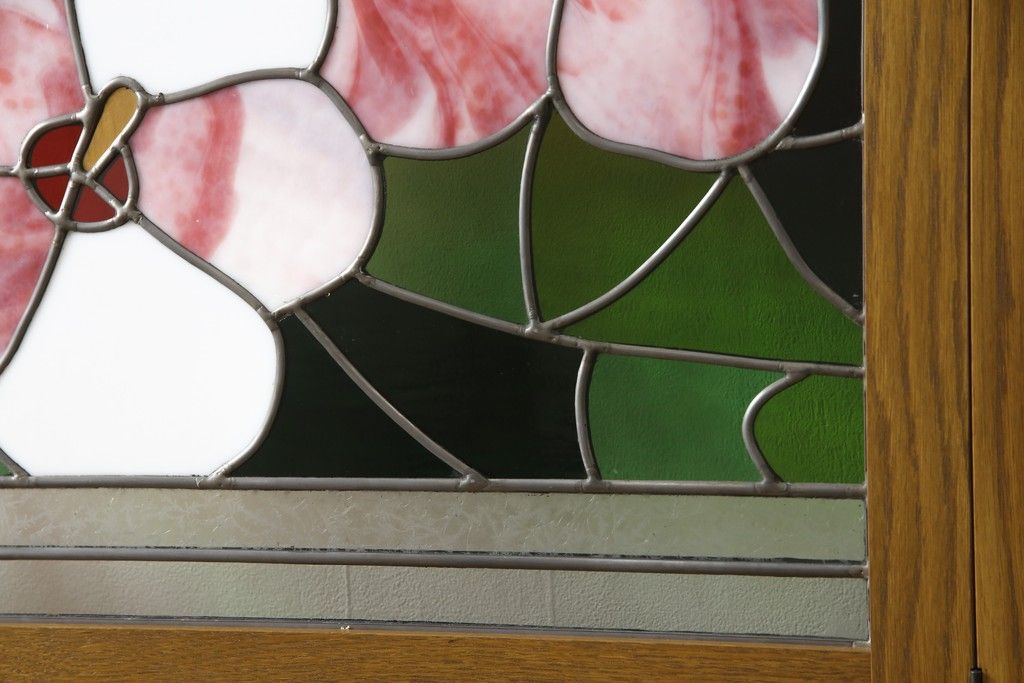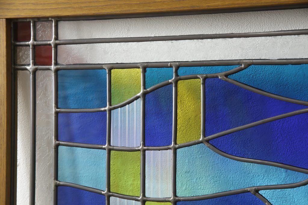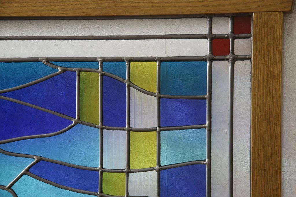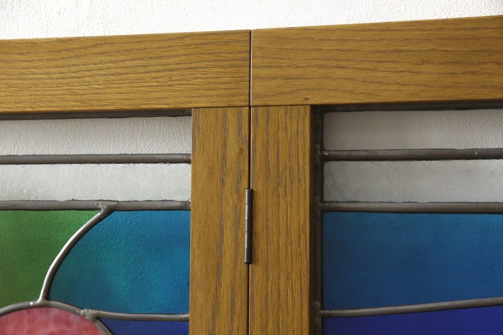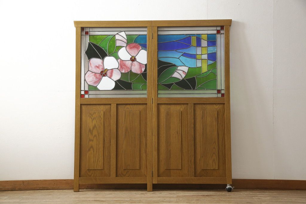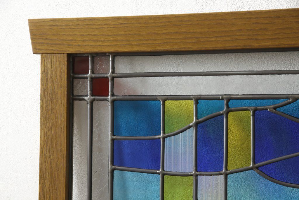 フルオーダー家具実績 > つい立てを新規製作!ご希望のサイズでオーク材を使用。片面は可動式仕様で、「芙蓉の花」「夏空」「日光」をモチーフにしたオリジナルのステンドグラスを取り付け。(ステンドグラス、つい立て、パーテーション、間仕切り)