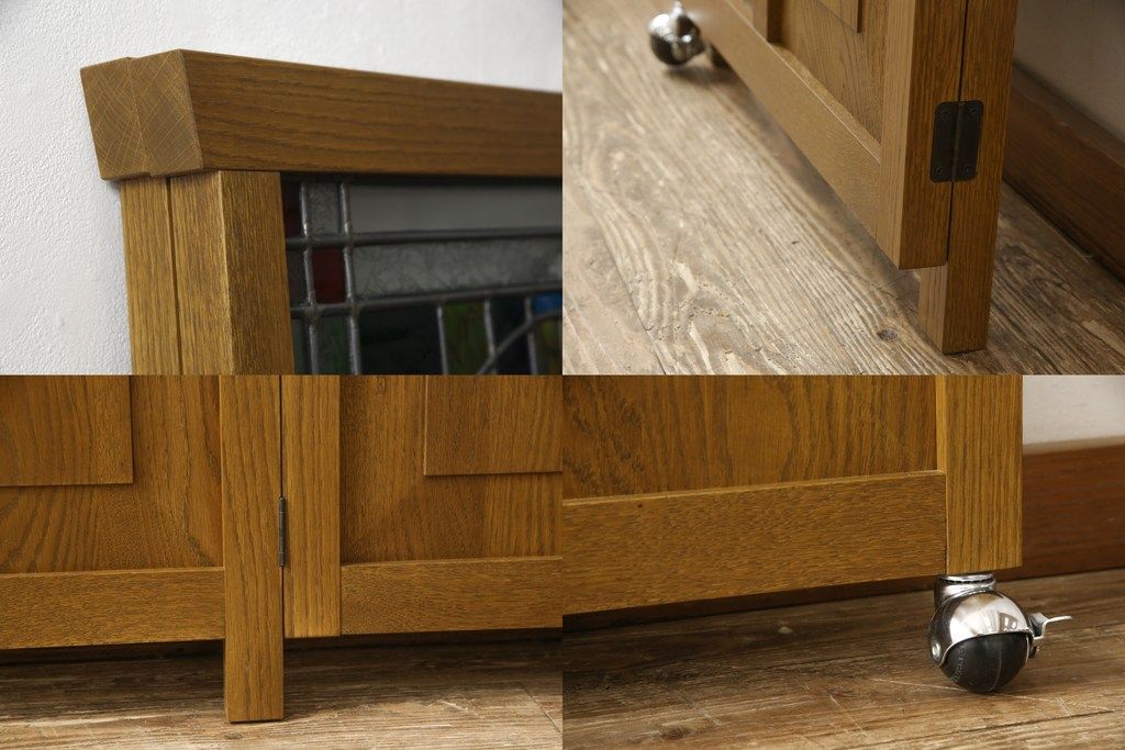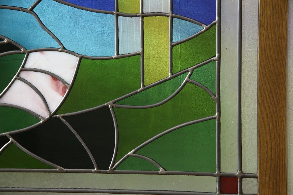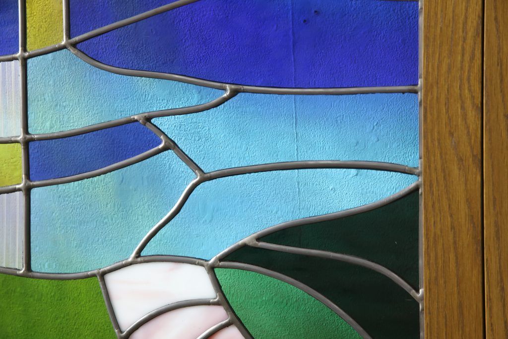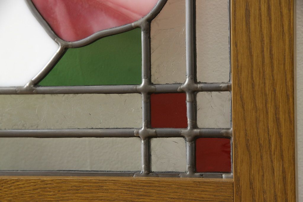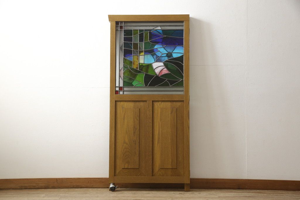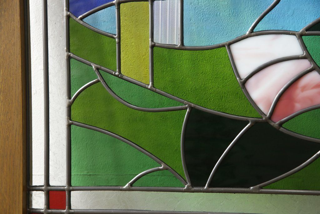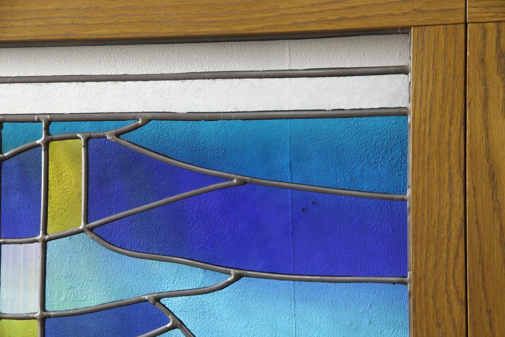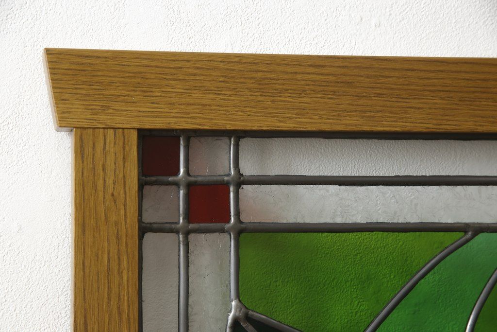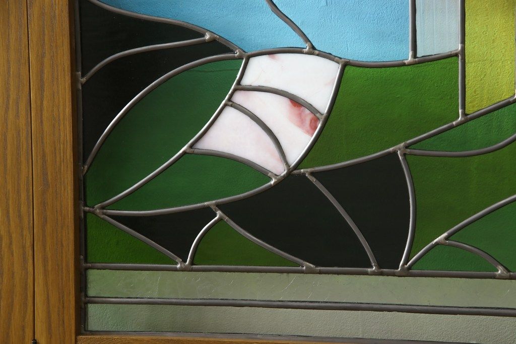 フルオーダー家具実績 > つい立てを新規製作!ご希望のサイズでオーク材を使用。片面は可動式仕様で、「芙蓉の花」「夏空」「日光」をモチーフにしたオリジナルのステンドグラスを取り付け。(ステンドグラス、つい立て、パーテーション、間仕切り)