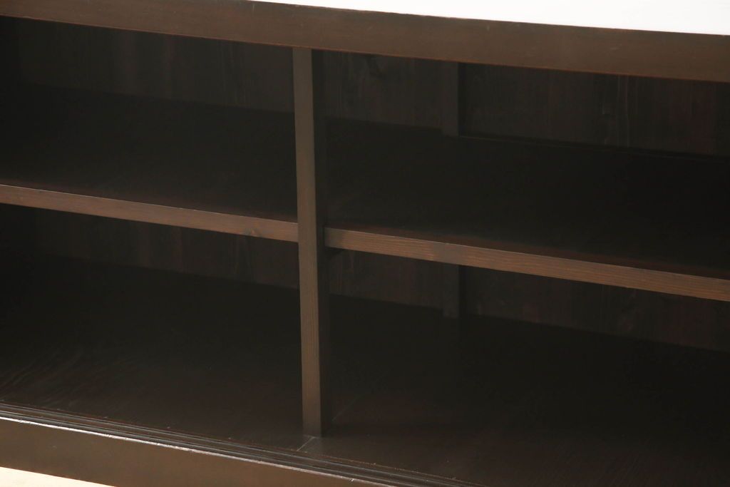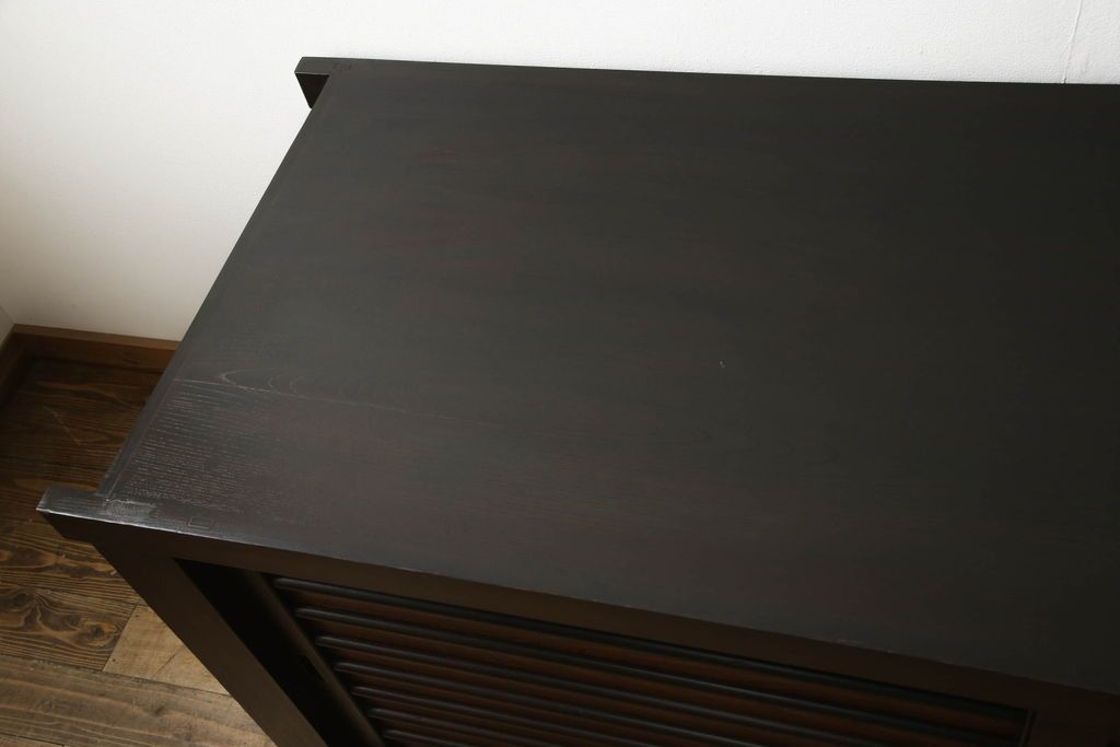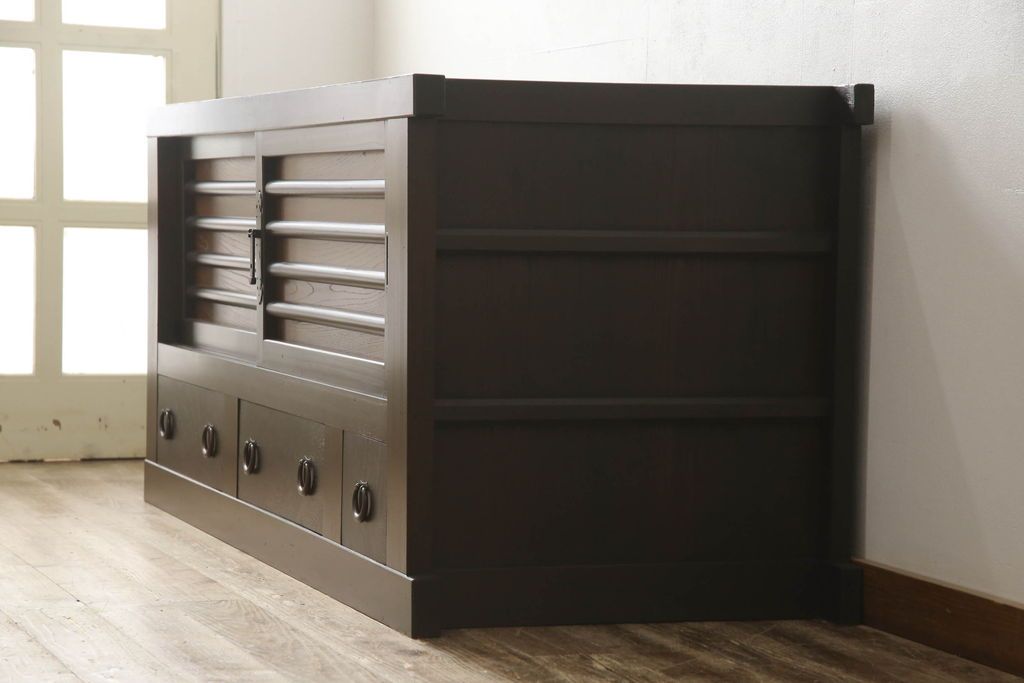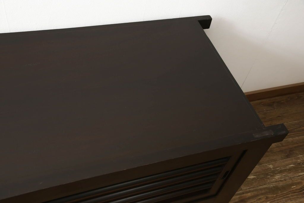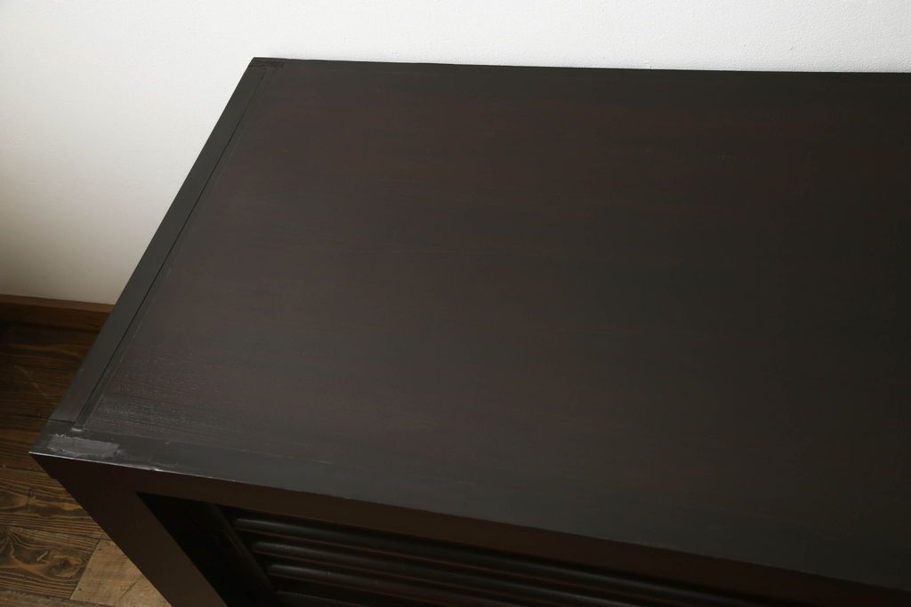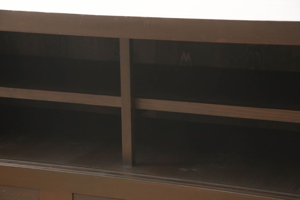 キャビネット・戸棚> テレビ台・ローボード > 水屋箪笥サイドボードをリペア&カスタム!上下框をそれぞれカットしリサイズ。框の耳をフラットになるようカットし、カットした面は色合わせ。底の四つ角にフェルトを貼り付け。(キャビネット、収納棚、戸棚)