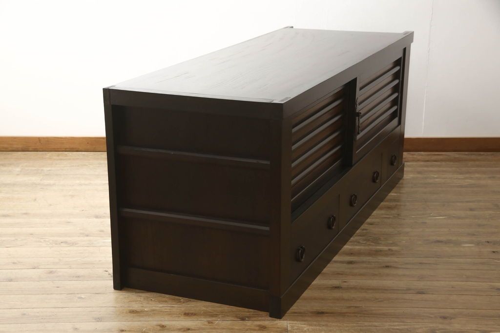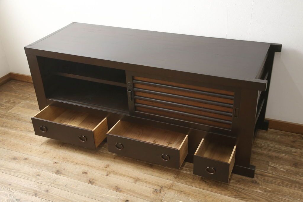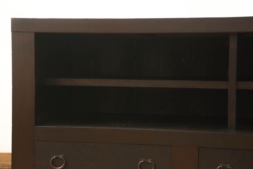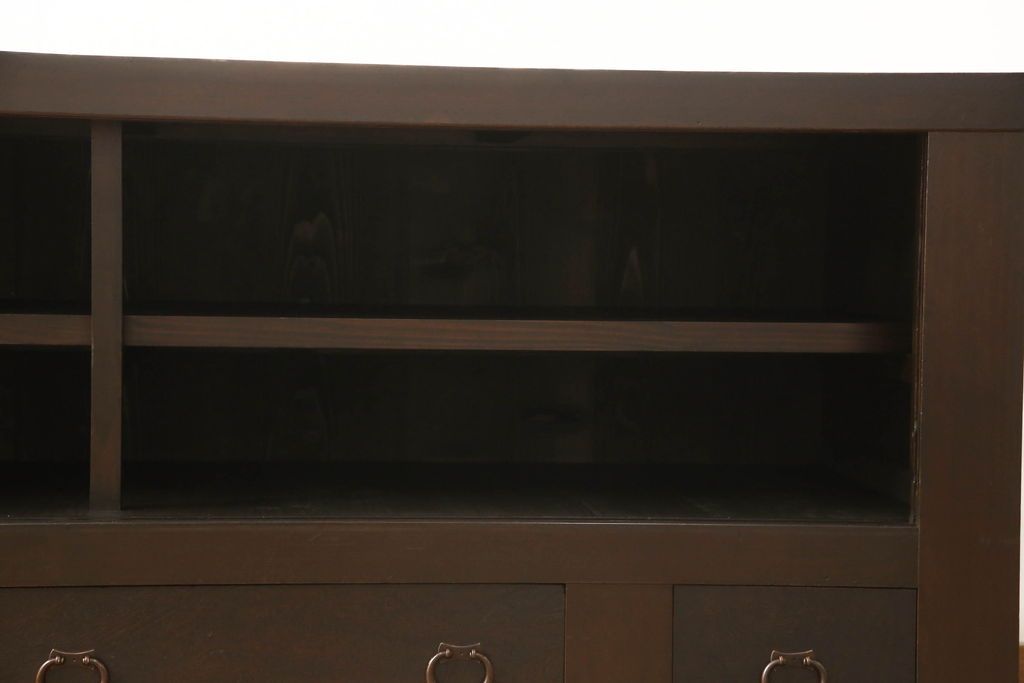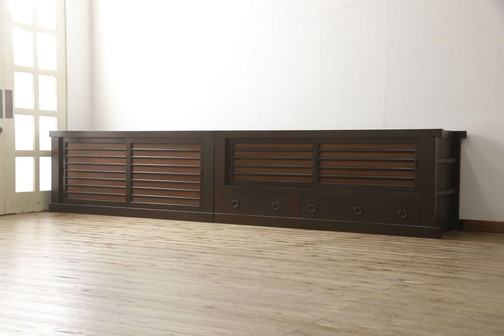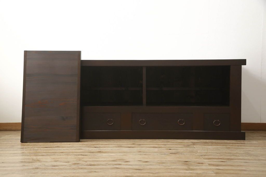 キャビネット・戸棚> テレビ台・ローボード > 水屋箪笥サイドボードをリペア&カスタム!上下框をそれぞれカットしリサイズ。框の耳をフラットになるようカットし、カットした面は色合わせ。底の四つ角にフェルトを貼り付け。(キャビネット、収納棚、戸棚)