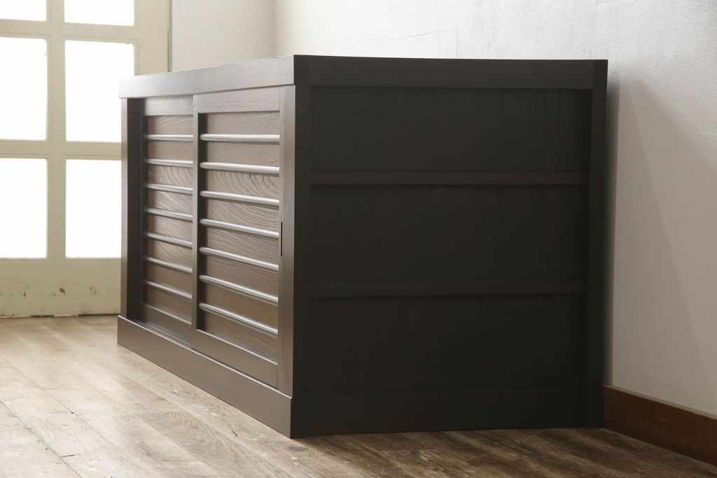 キャビネット・戸棚> サイドキャビネット > 水屋箪笥サイドボードをリペア&カスタム!上下框をそれぞれカットしリサイズ。框の耳をフラットになるようカットし、カットした面は色合わせ。底の四つ角にフェルトを貼り付け。(キャビネット、収納棚、戸棚)