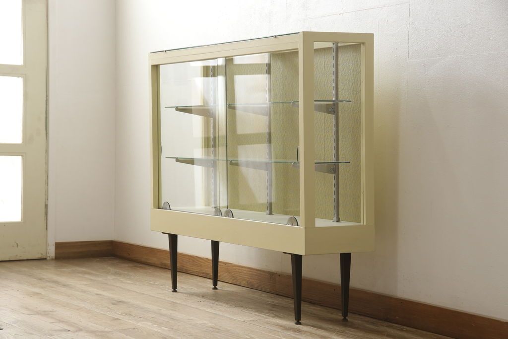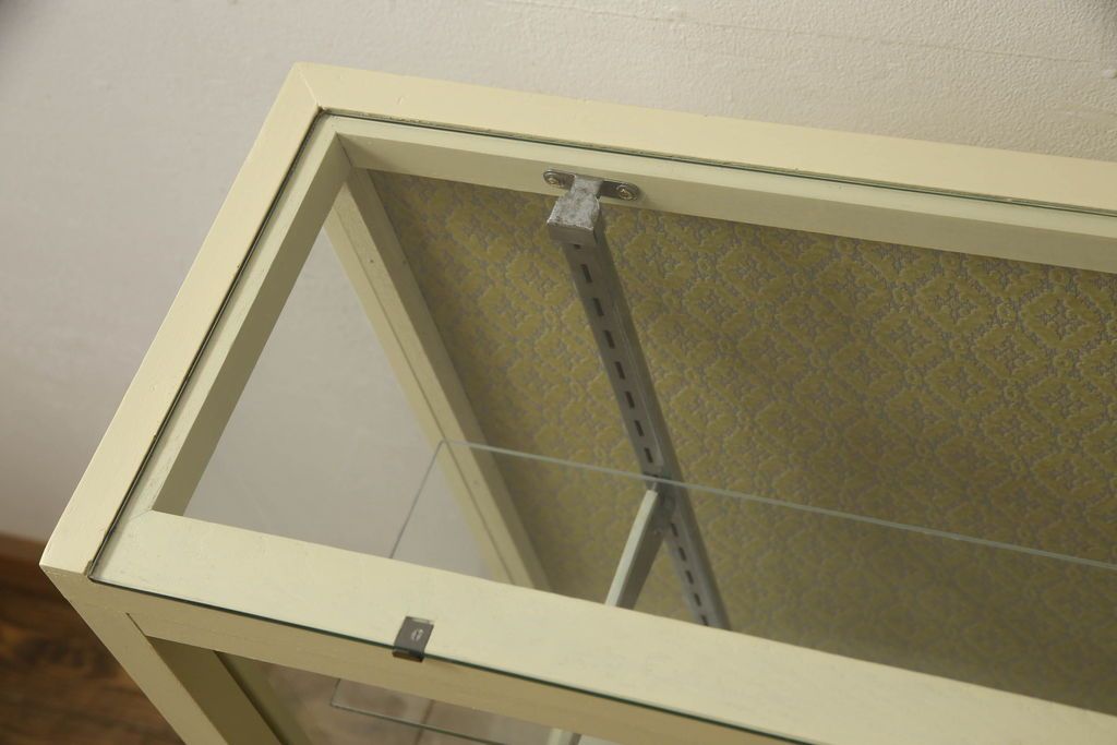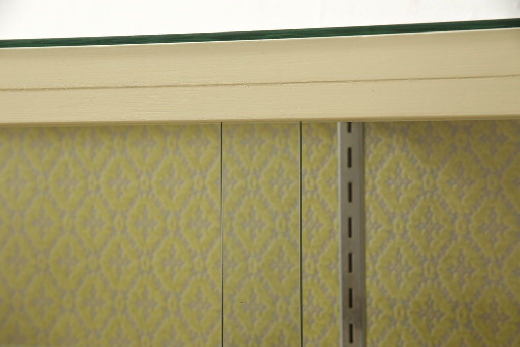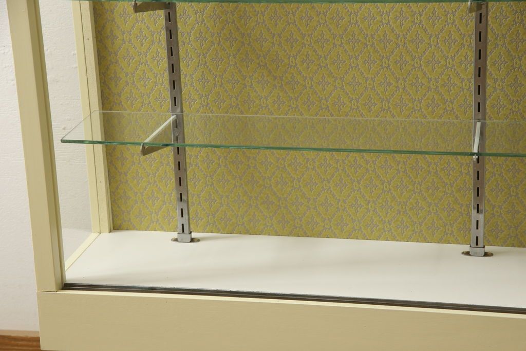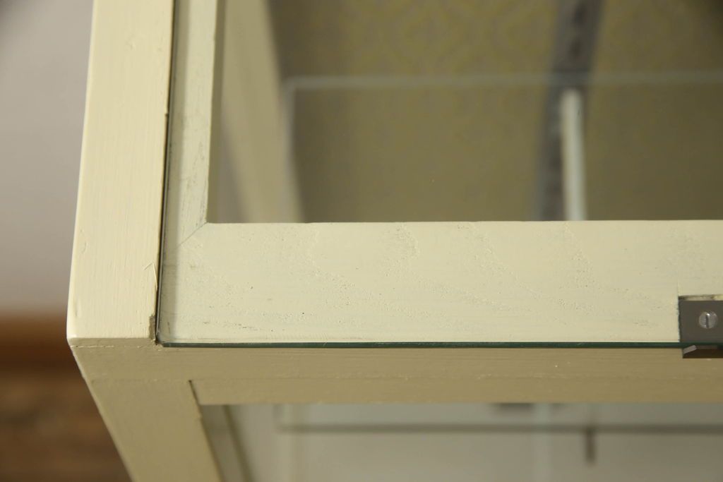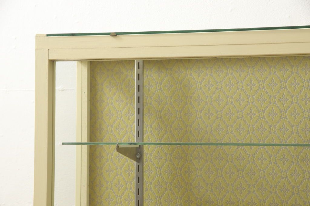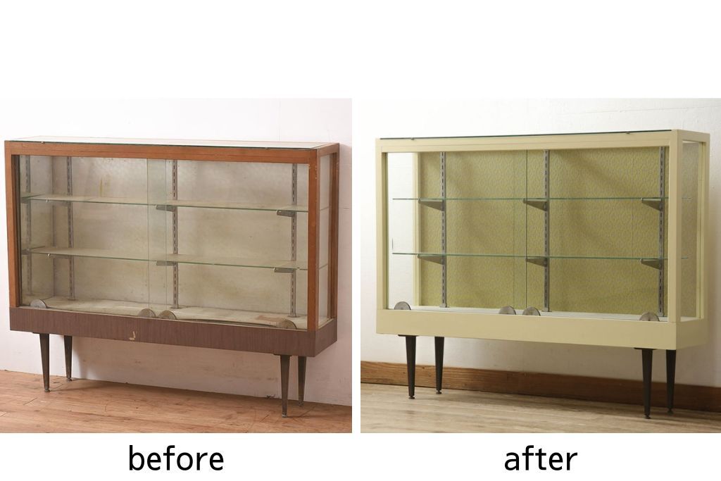 ガラスケース・ショーケース> カウンターショーケース > ガラスケースをリペア&カスタム!背面の模様ガラスを板に変更し指定の紙を貼り付け、左側面の鏡はクリアガラスに入れ替え。本体、棚内部の底板はクリーム色にペイント。(ショーケース、飾り棚、陳列棚)