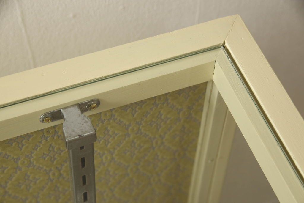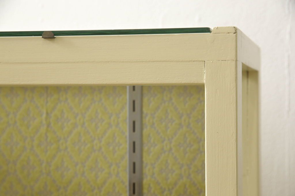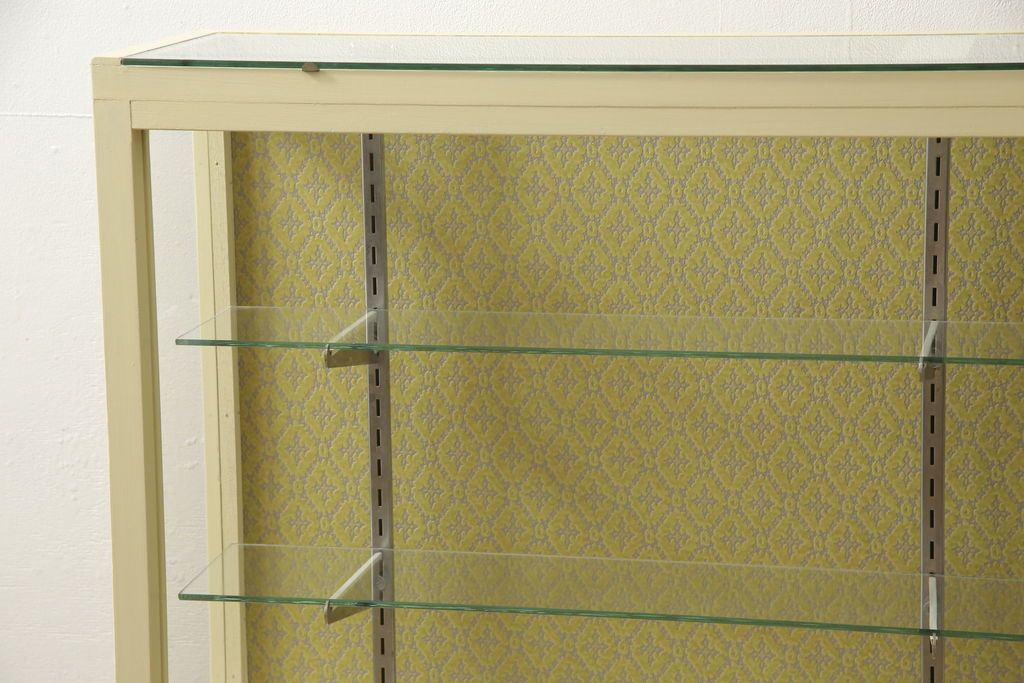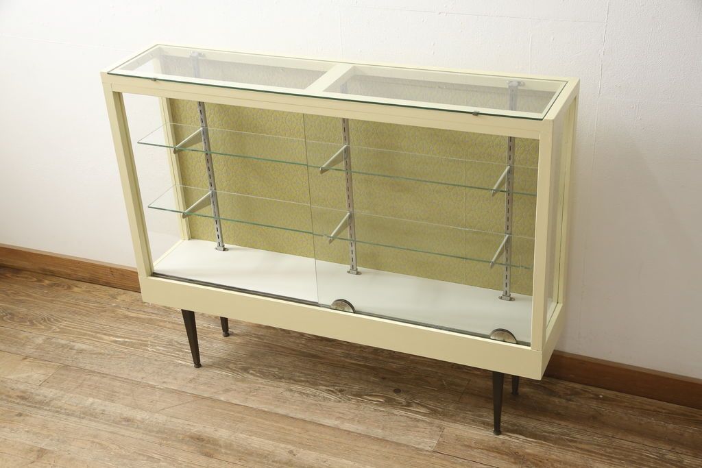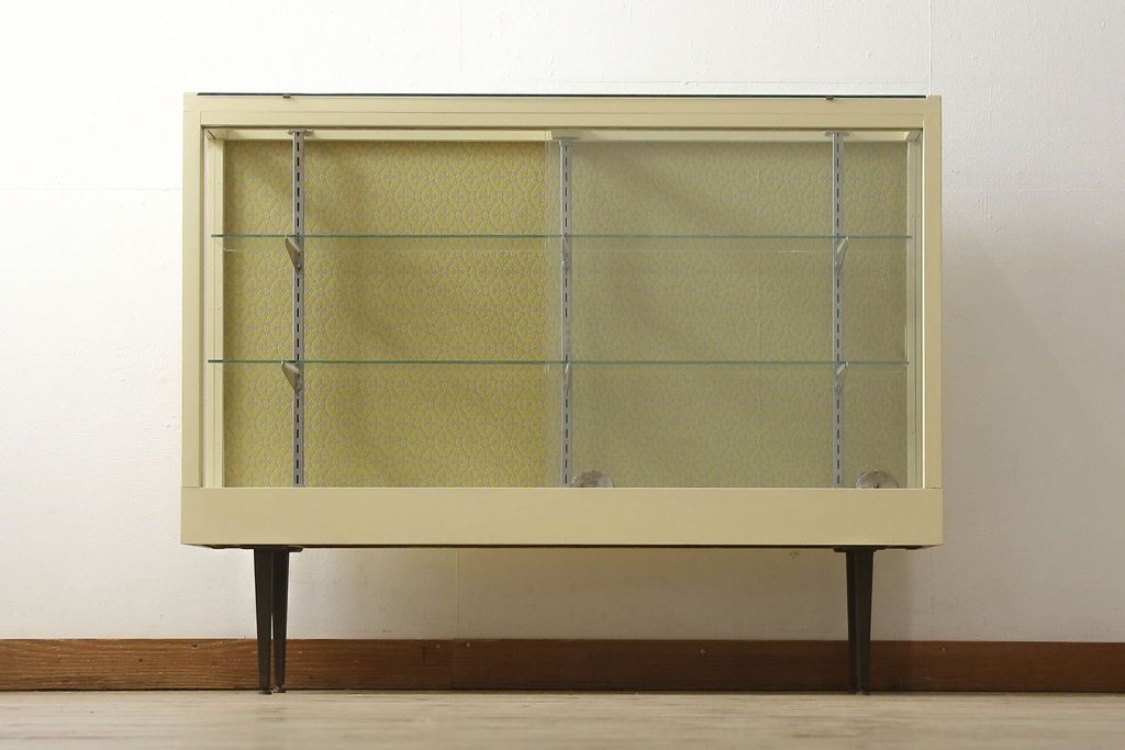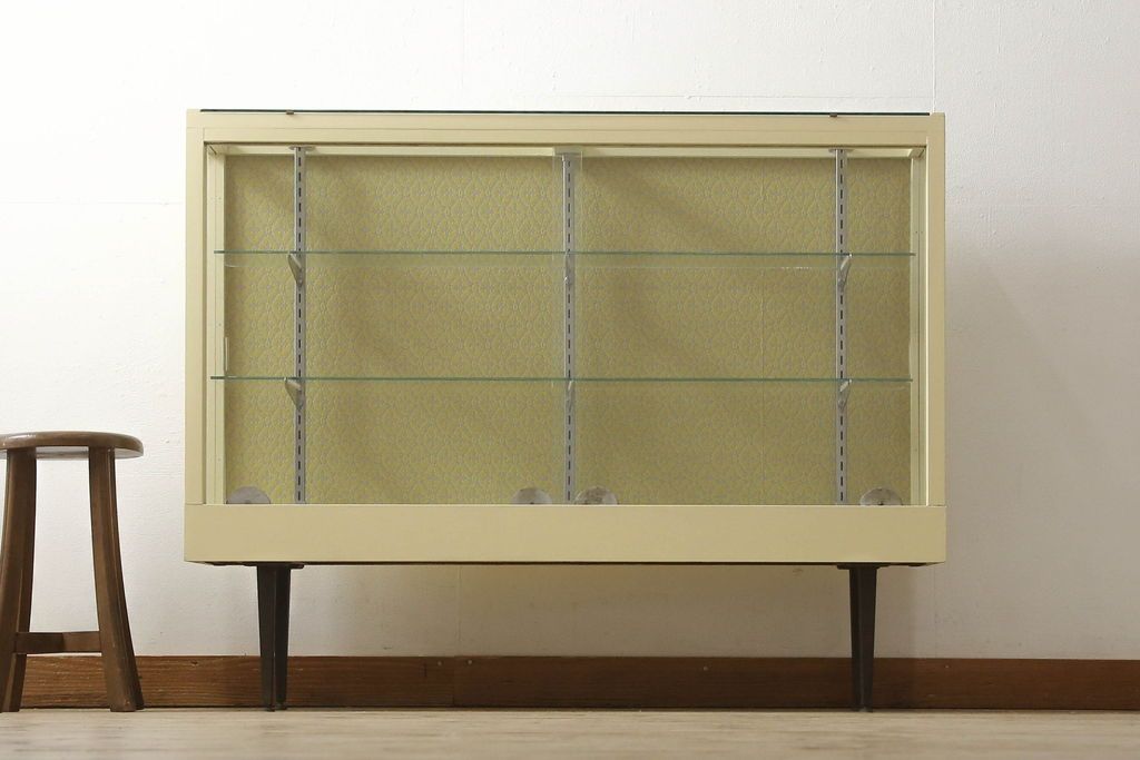ガラスケース・ショーケース> カウンターショーケース > ガラスケースをリペア&カスタム!背面の模様ガラスを板に変更し指定の紙を貼り付け、左側面の鏡はクリアガラスに入れ替え。本体、棚内部の底板はクリーム色にペイント。(ショーケース、飾り棚、陳列棚)