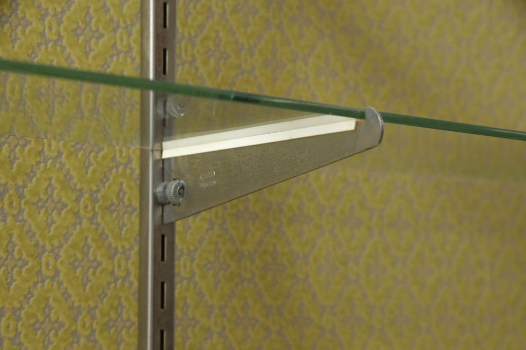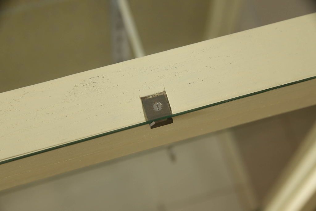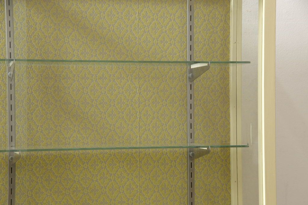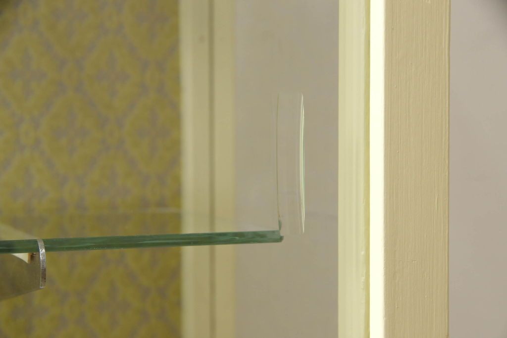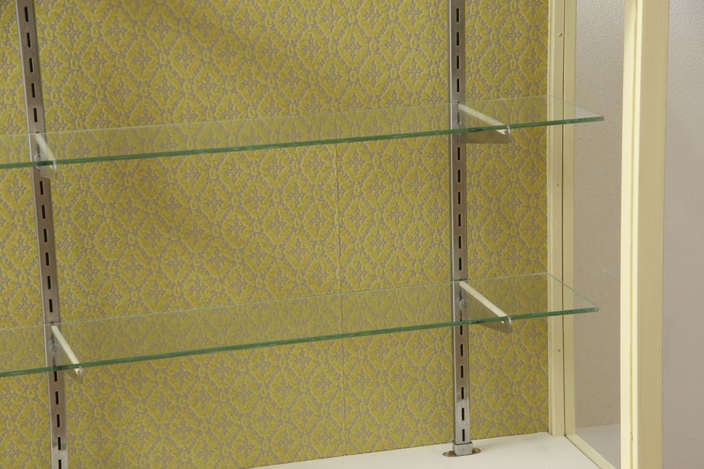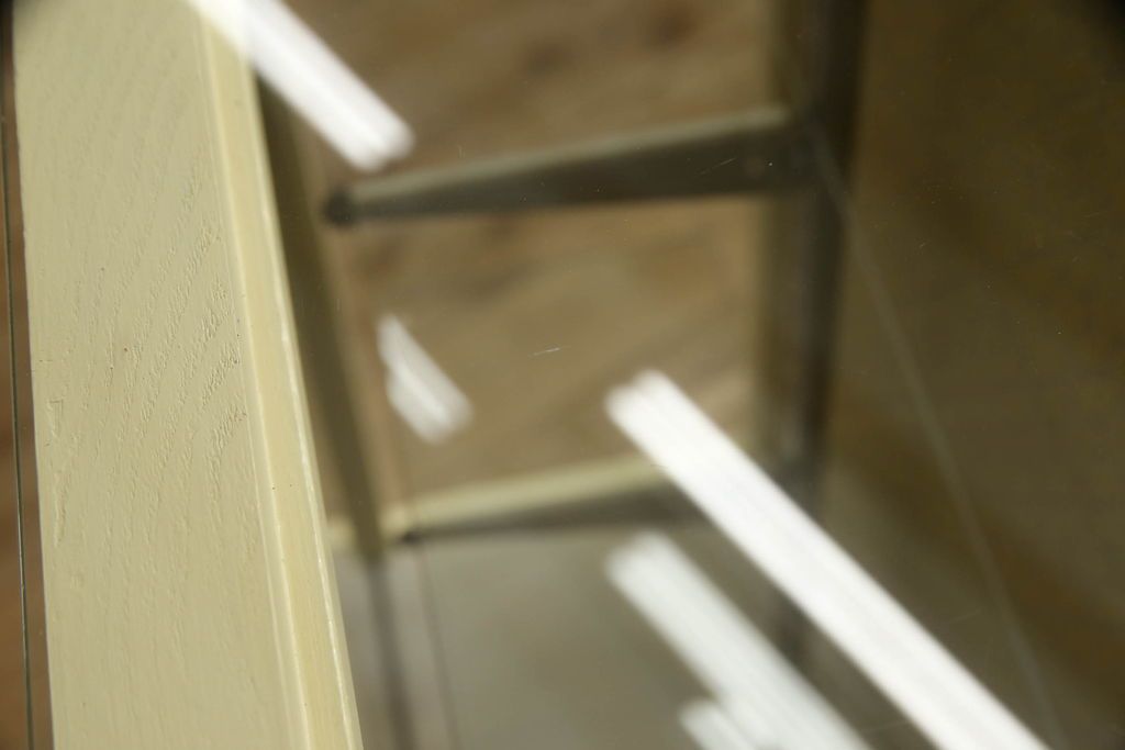 セミオーダー家具実績 > ガラスケースをリペア&カスタム!背面の模様ガラスを板に変更し指定の紙を貼り付け、左側面の鏡はクリアガラスに入れ替え。本体、棚内部の底板はクリーム色にペイント。(ショーケース、飾り棚、陳列棚)