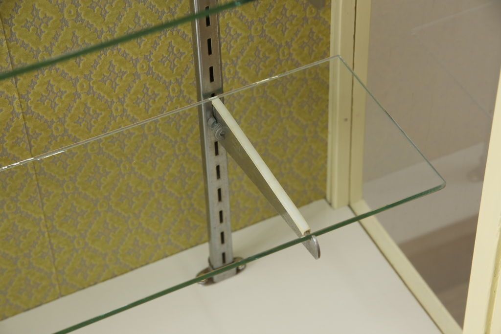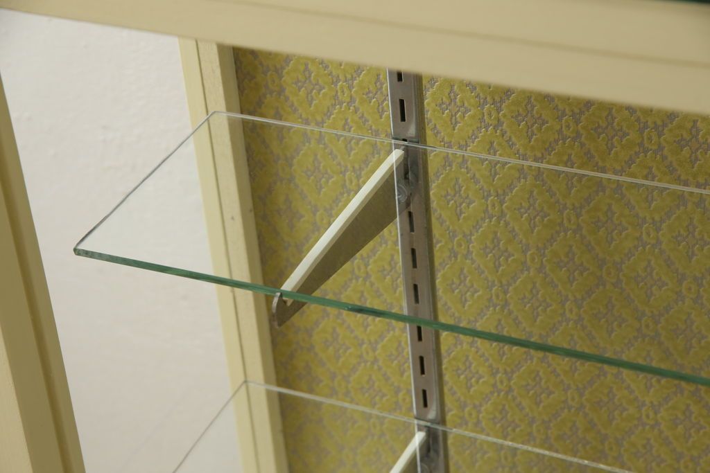 ガラスケース・ショーケース > ガラスケースをリペア&カスタム!背面の模様ガラスを板に変更し指定の紙を貼り付け、左側面の鏡はクリアガラスに入れ替え。本体、棚内部の底板はクリーム色にペイント。(ショーケース、飾り棚、陳列棚)