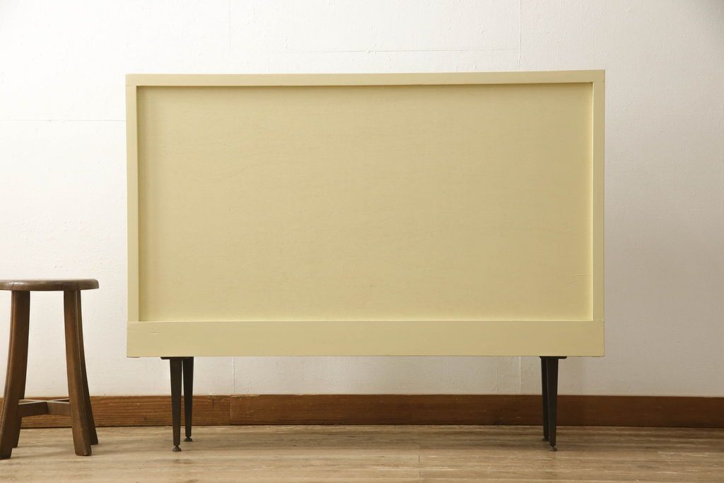ガラスケースをリペア&カスタム!背面の模様ガラスを板に変更し指定の紙を貼り付け、左側面の鏡はクリアガラスに入れ替え。本体、棚内部の底板はクリーム色にペイント。(ショーケース、飾り棚、陳列棚)