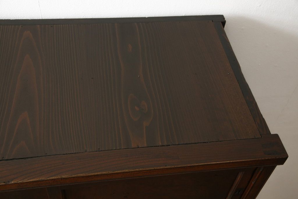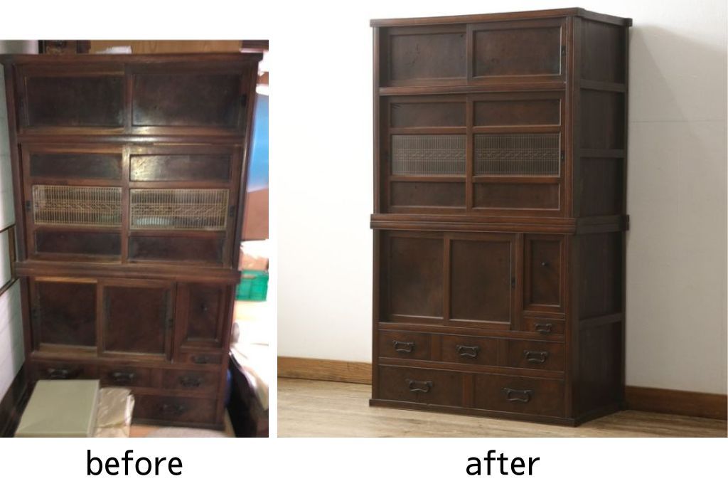 水屋箪笥を綺麗に再生!棚板を新材にて2枚製作。現状のお品物に合わせて1トーン程落ち着いた色に着色。