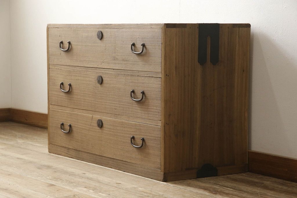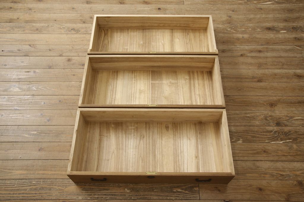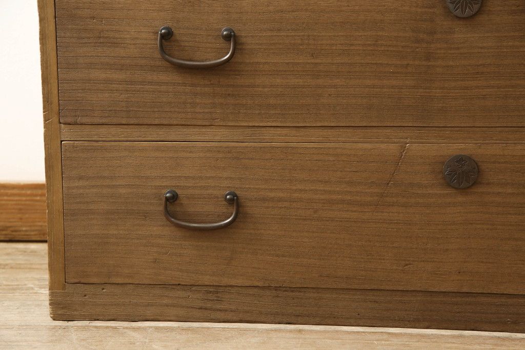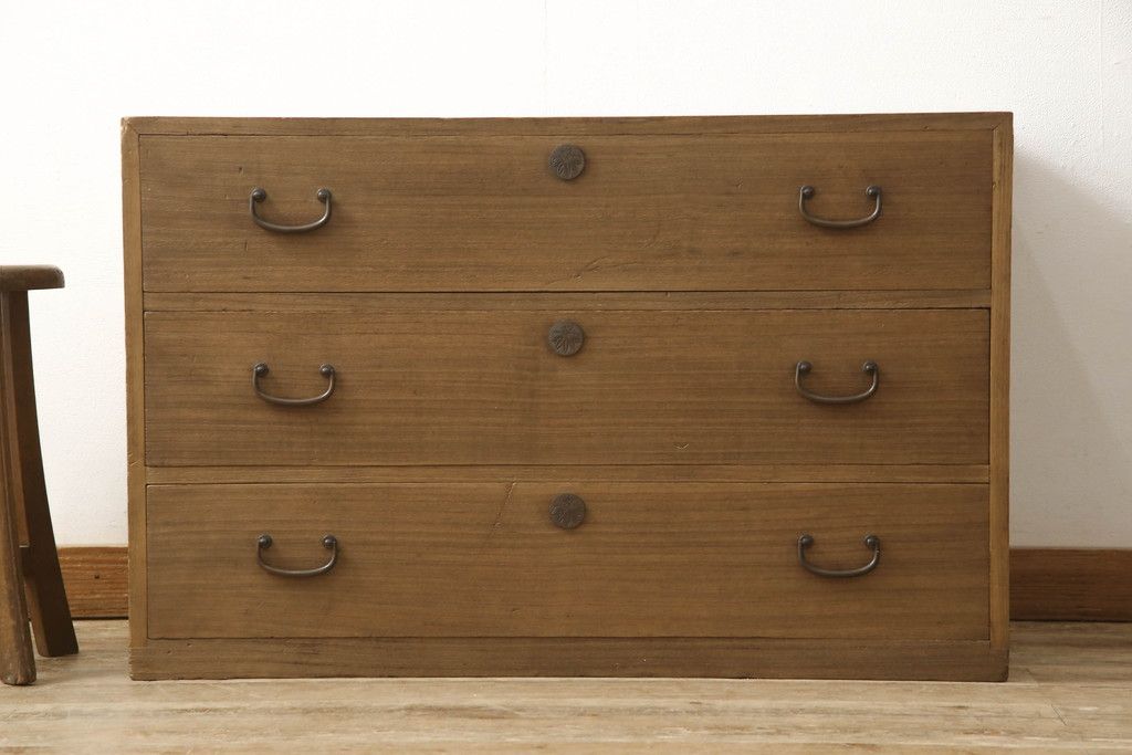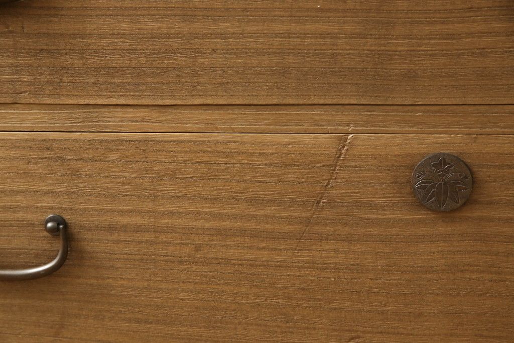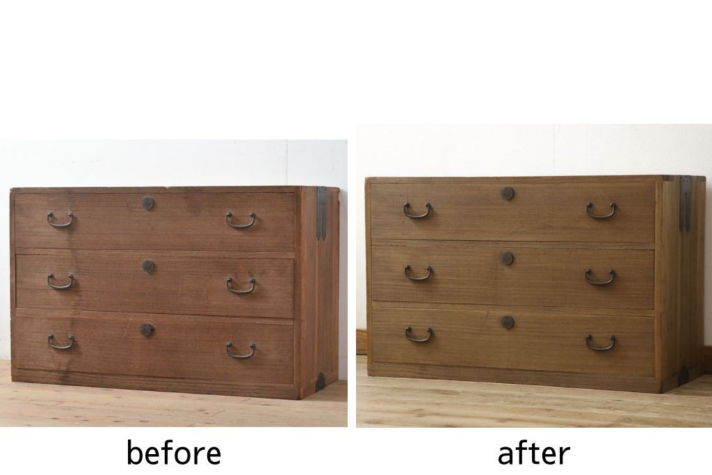 箪笥の見た目を変えずに綺麗にリペア!天板裏から天板を補強。本体は現状の品物に合わせて1トーン程落ち着いた色に着色。(ローボード、テレビ台、チェスト、引き出し、桐箪笥、桐たんす)