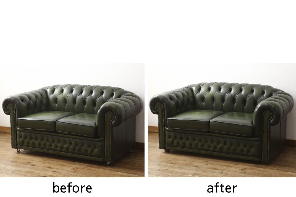 セミオーダー家具実績 > 2人掛けソファをリペア&カスタム!既存のキャスターを取り外し、希望の長さにカットした脚を取り付け。色味はオーク系に着色。(二人掛け、ラブソファ)
