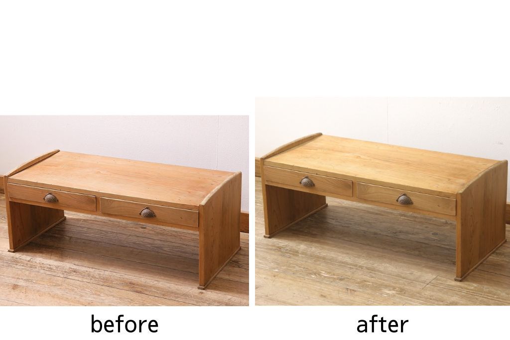 文机の見た目を変えずに綺麗にリペア!蜜蝋ワックスを施し、少し濡れたような色味に仕上げ。(ローテーブル、座机)