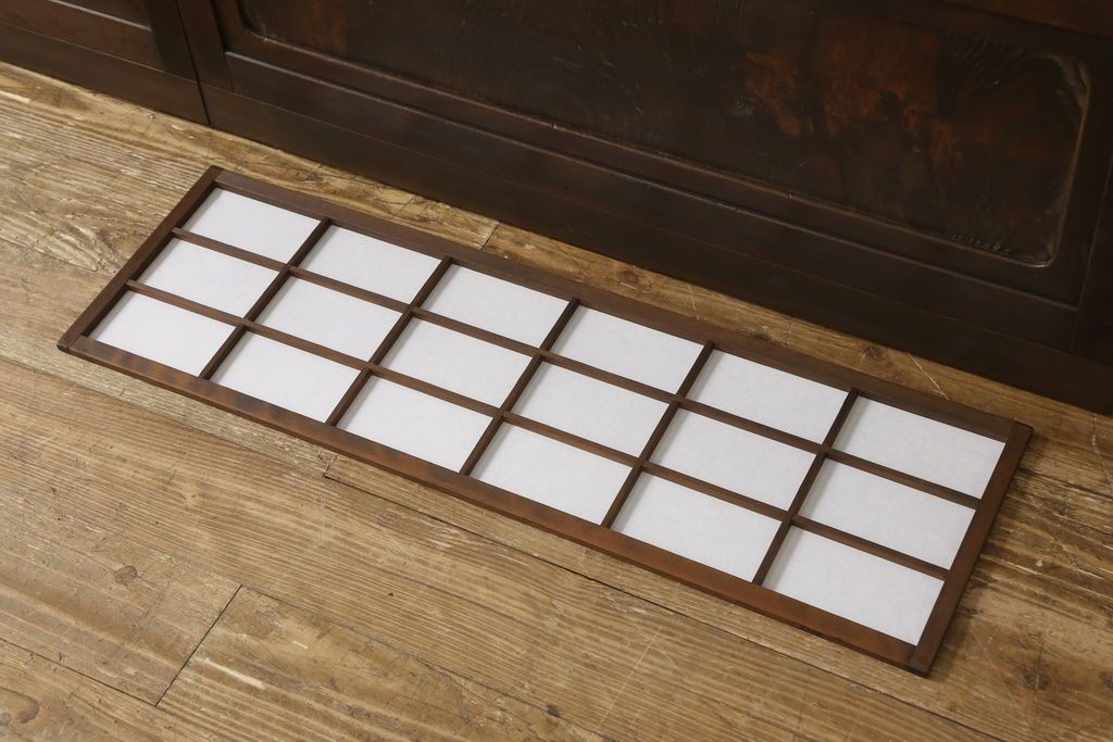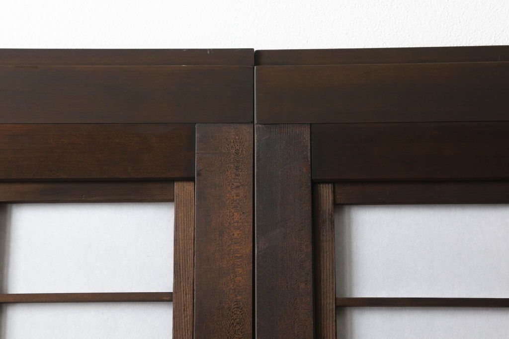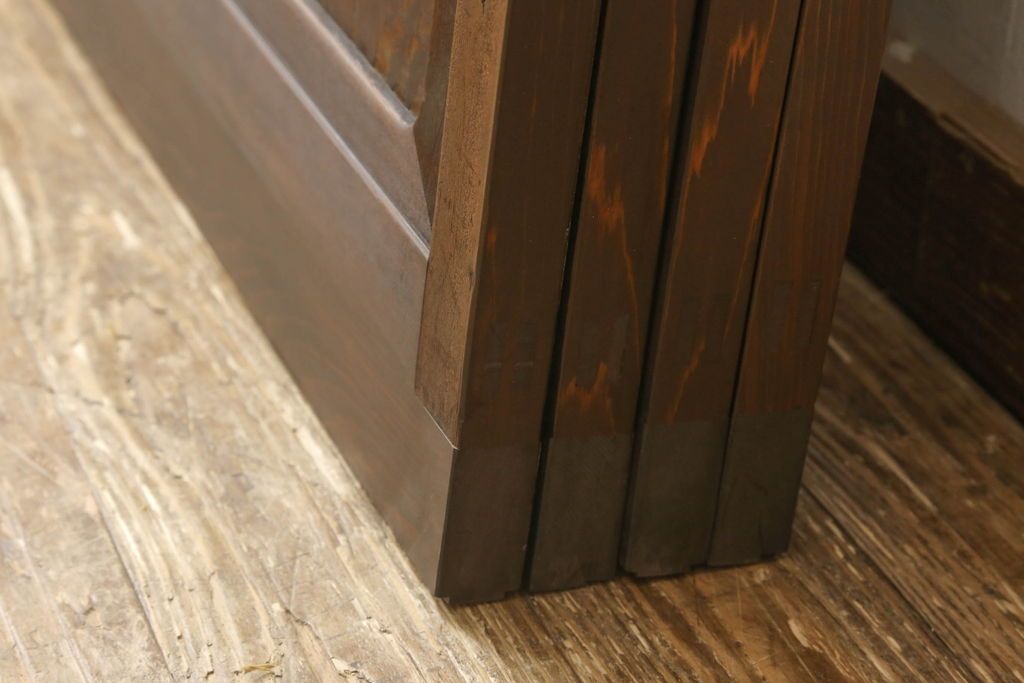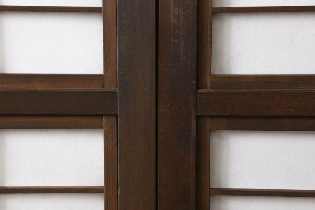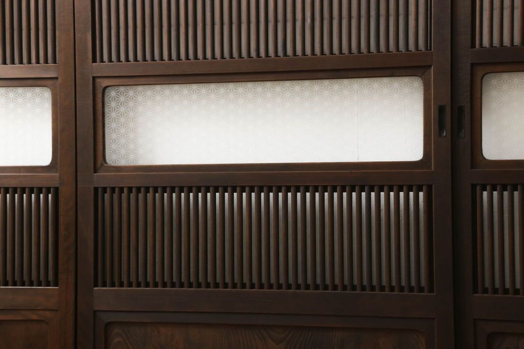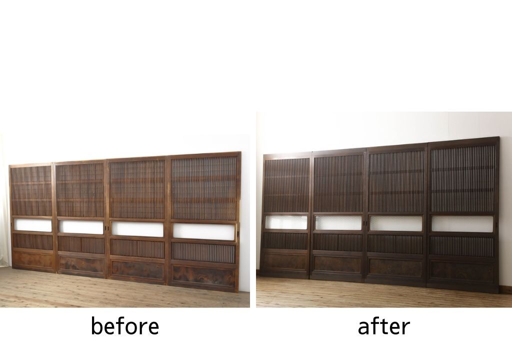 セミオーダー家具実績 > 裏障子付き格子戸4枚をリペア&カスタム!高さと幅をリサイズし、平戸車を取り付け。裏障子はプラスチック障子を貼り付け、ガラス部分は当店オリジナルの麻の葉紋様ガラスに交換。色味は当店商品を参考に着色。(引き戸、ガラス帯戸)