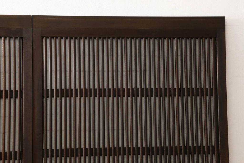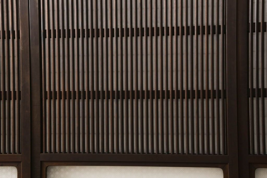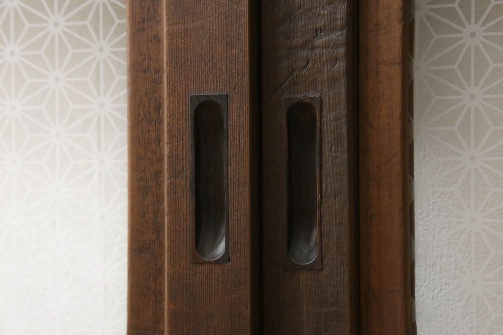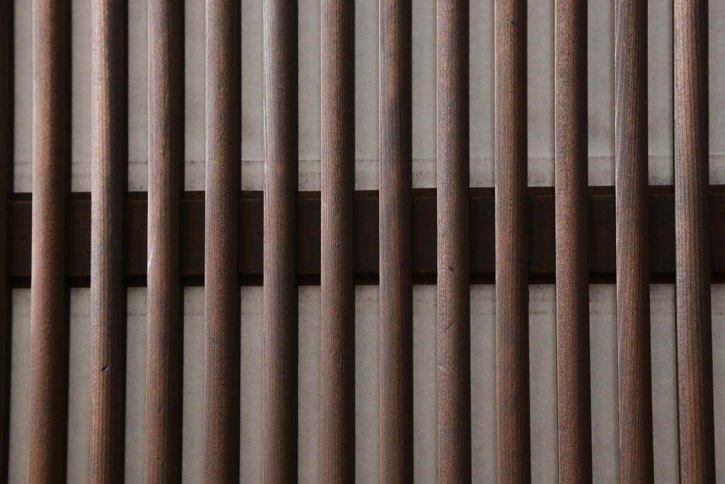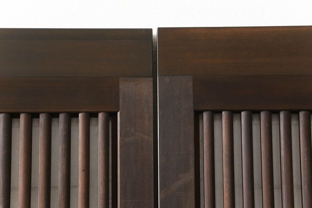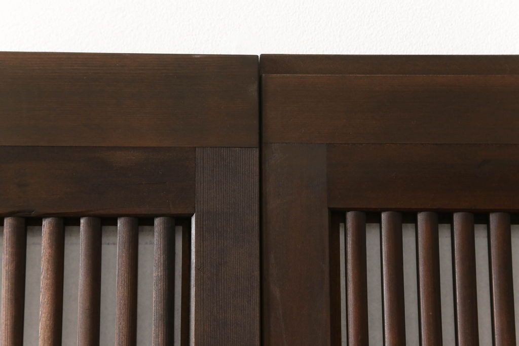 セミオーダー家具実績 > 裏障子付き格子戸4枚をリペア&カスタム!高さと幅をリサイズし、平戸車を取り付け。裏障子はプラスチック障子を貼り付け、ガラス部分は当店オリジナルの麻の葉紋様ガラスに交換。色味は当店商品を参考に着色。(引き戸、ガラス帯戸)