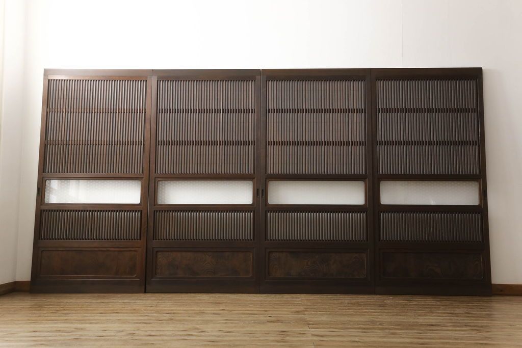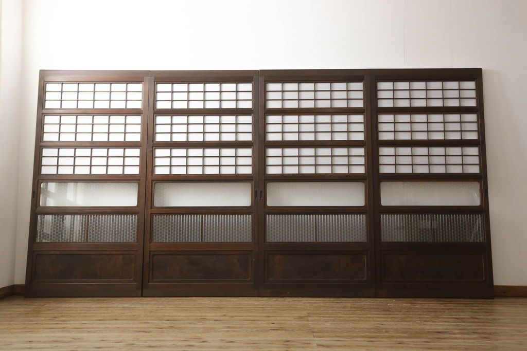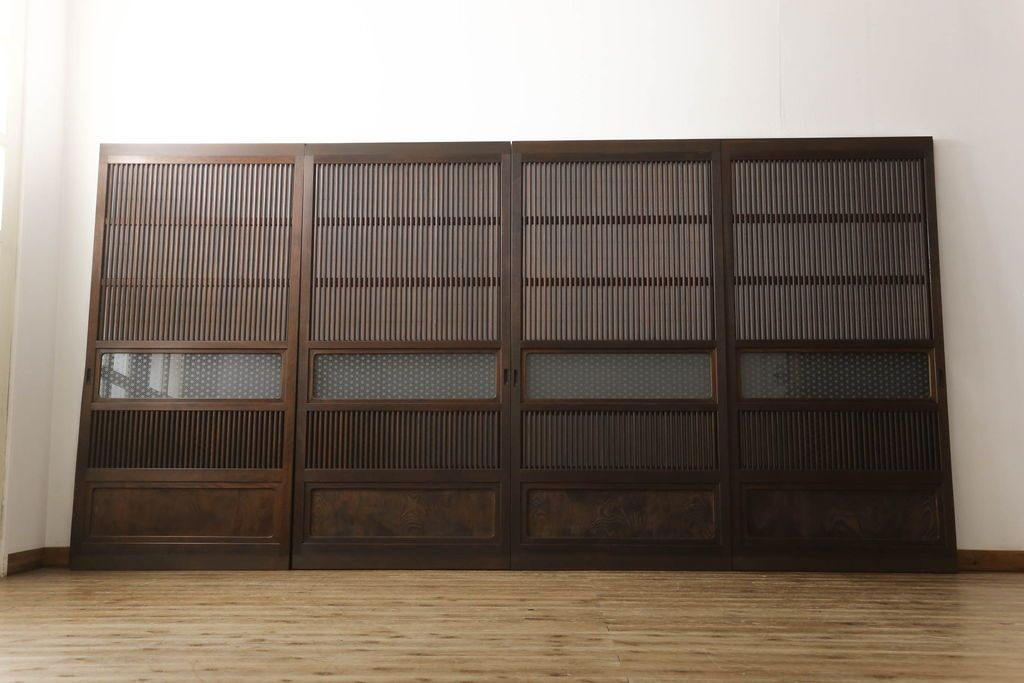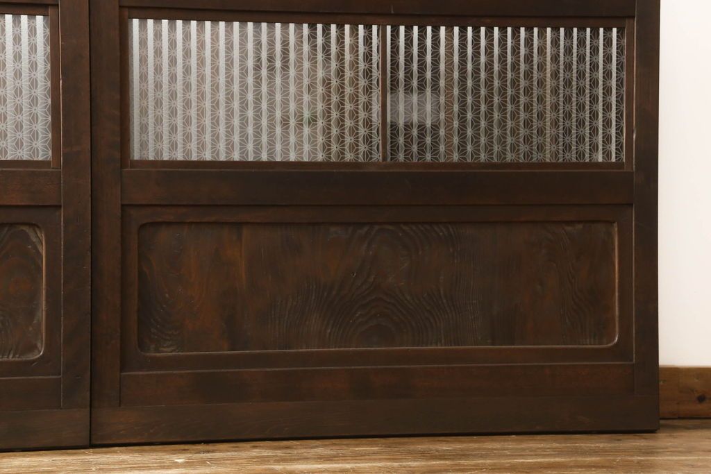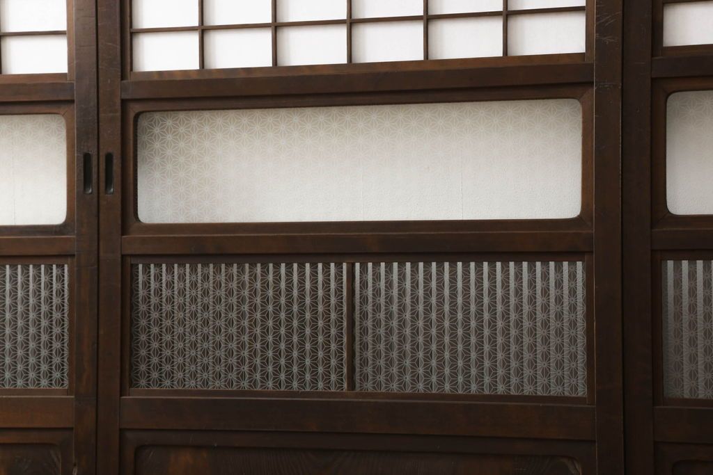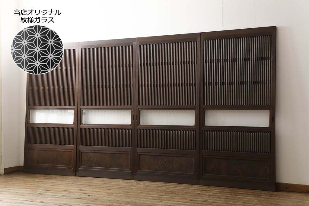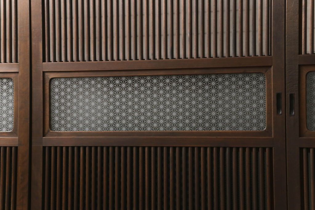 ドア・建具> 引き戸 > 裏障子付き格子戸4枚をリペア&カスタム!高さと幅をリサイズし、平戸車を取り付け。裏障子はプラスチック障子を貼り付け、ガラス部分は当店オリジナルの麻の葉紋様ガラスに交換。色味は当店商品を参考に着色。(引き戸、ガラス帯戸)