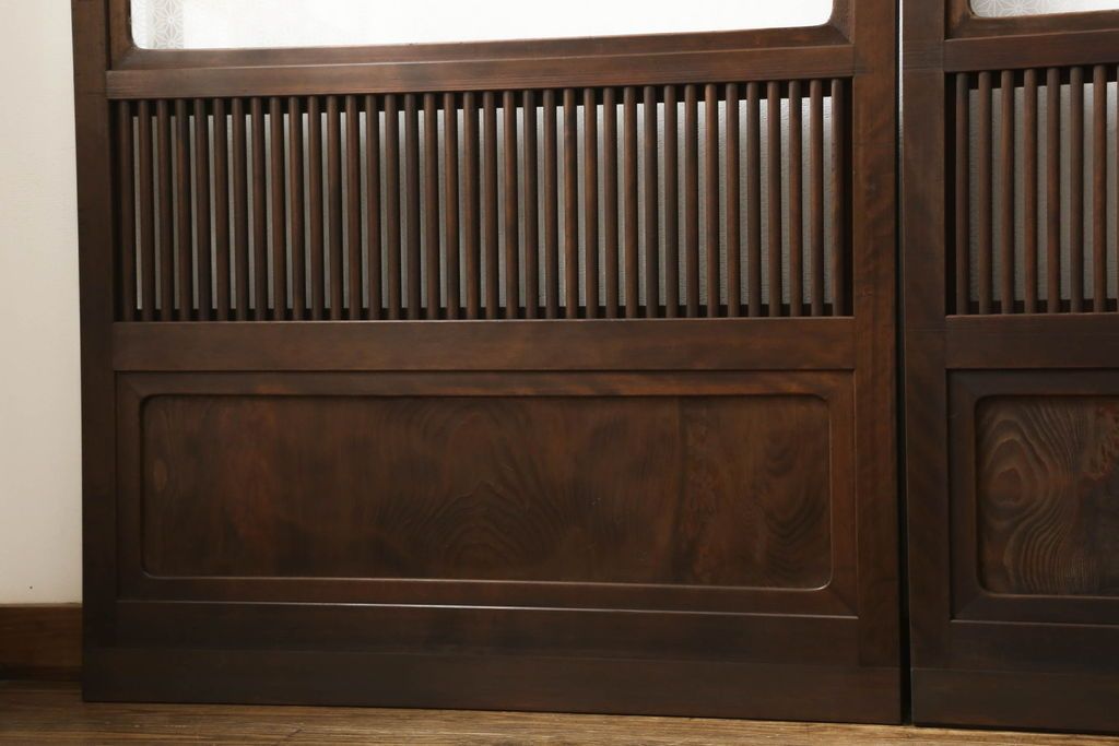ドア・建具> 障子戸 > 裏障子付き格子戸4枚をリペア&カスタム!高さと幅をリサイズし、平戸車を取り付け。裏障子はプラスチック障子を貼り付け、ガラス部分は当店オリジナルの麻の葉紋様ガラスに交換。色味は当店商品を参考に着色。(引き戸、ガラス帯戸)