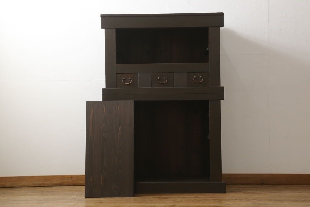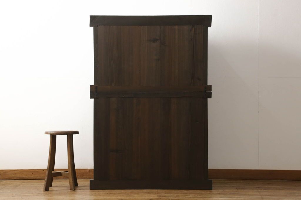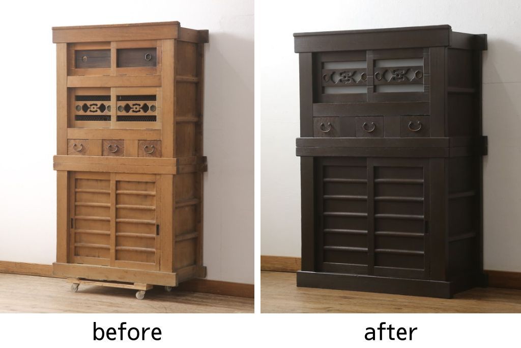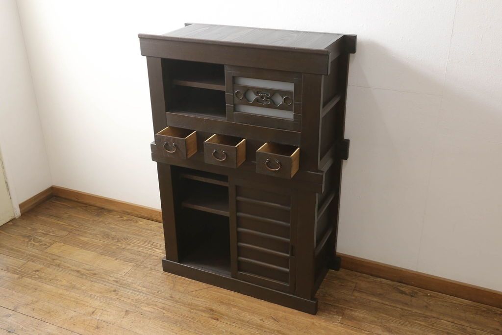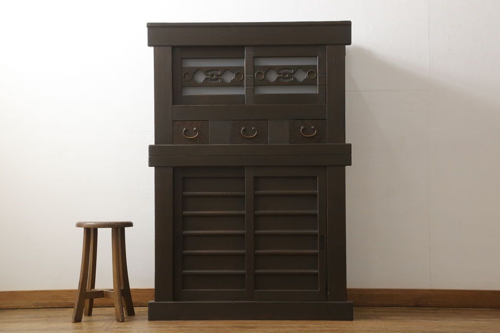 和箪笥> 水屋箪笥 > 三尺水屋箪笥をリペア&カスタム!高さをリサイズし、本体を上下分割できるように加工。網部分にはすりガラスを取り付け、棚板を新たに製作。色味はチェス系に着色し蜜蝋ワックスにて仕上げ。(収納棚、戸棚、キャビネット、食器棚)