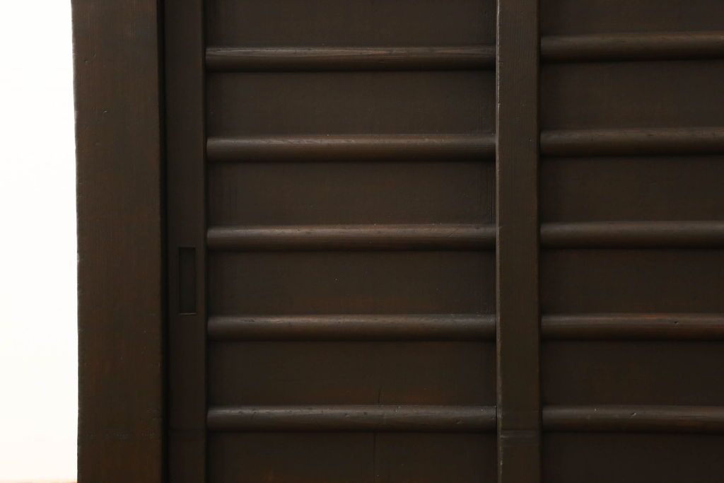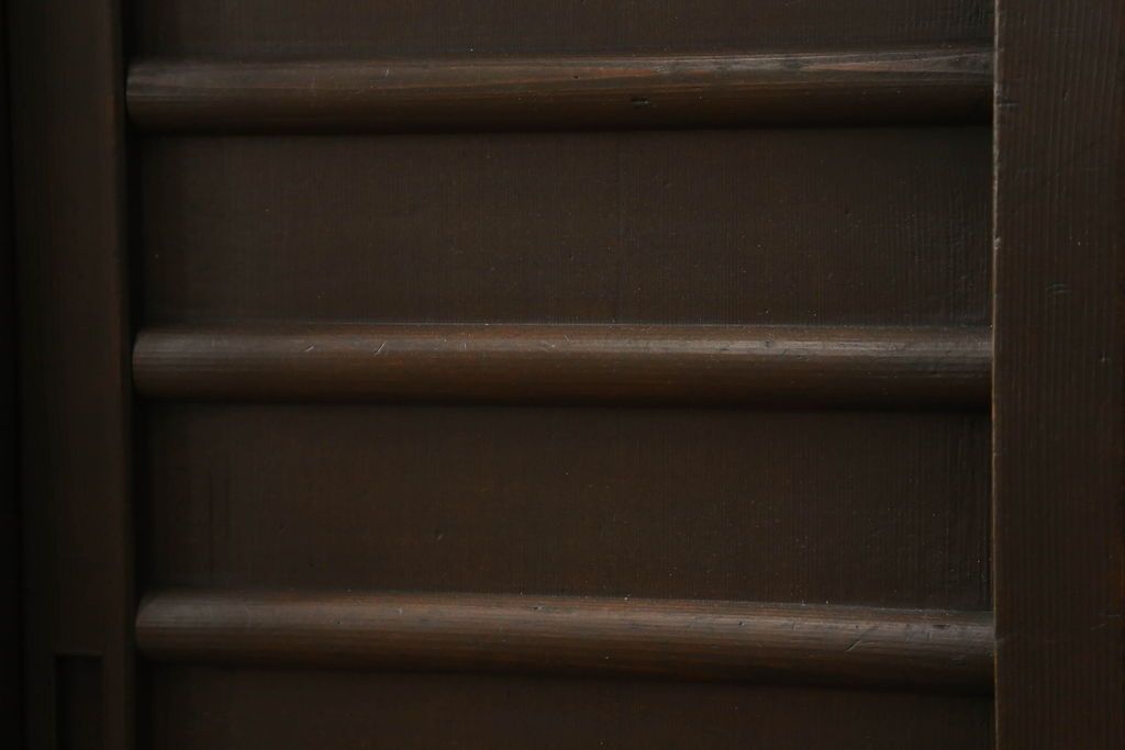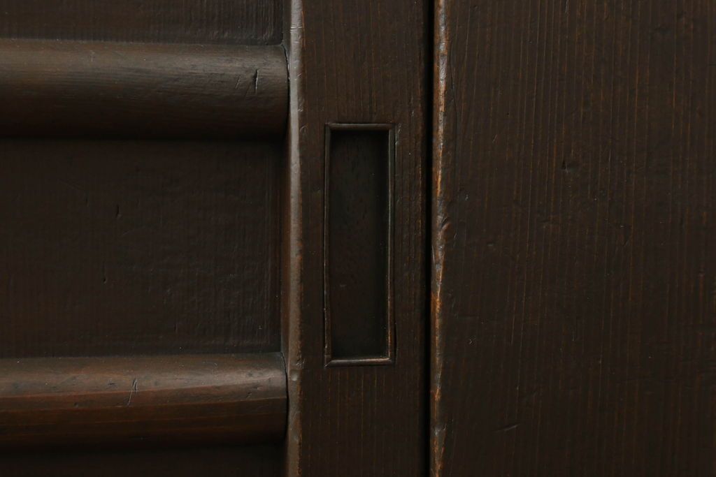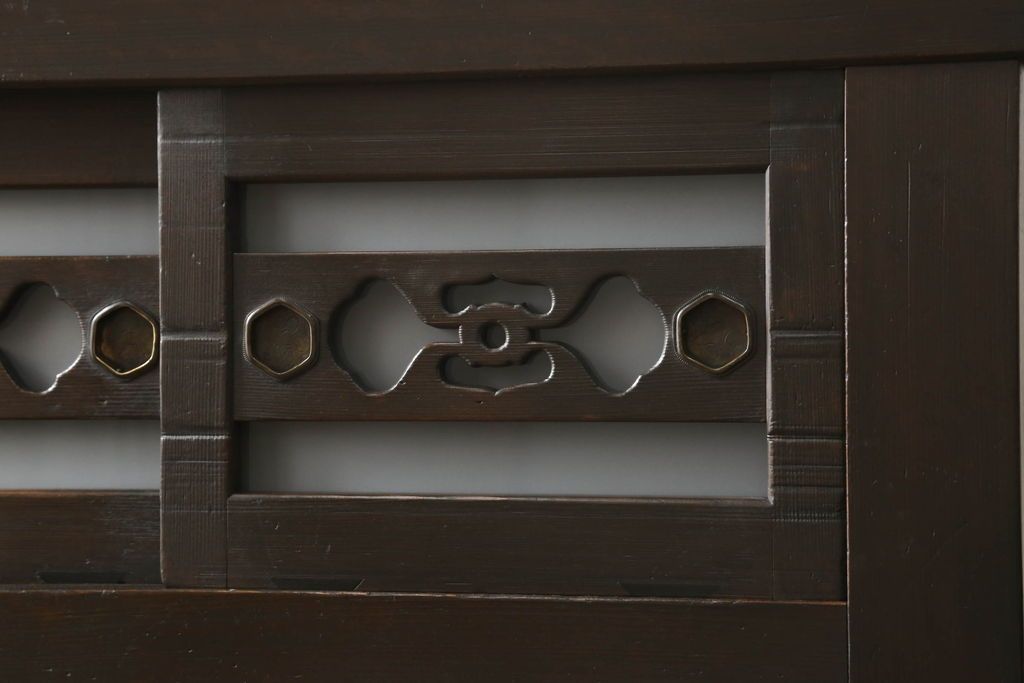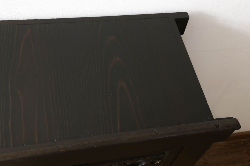 和箪笥> 水屋箪笥 > 三尺水屋箪笥をリペア&カスタム!高さをリサイズし、本体を上下分割できるように加工。網部分にはすりガラスを取り付け、棚板を新たに製作。色味はチェス系に着色し蜜蝋ワックスにて仕上げ。(収納棚、戸棚、キャビネット、食器棚)