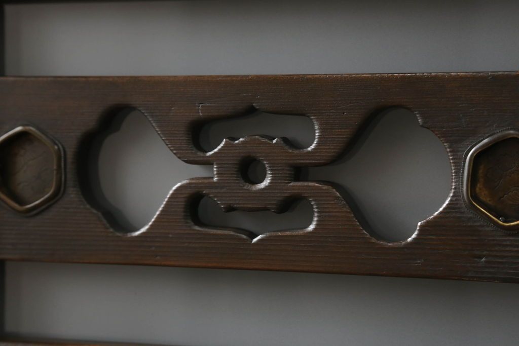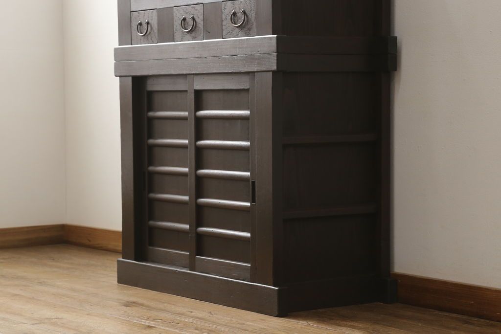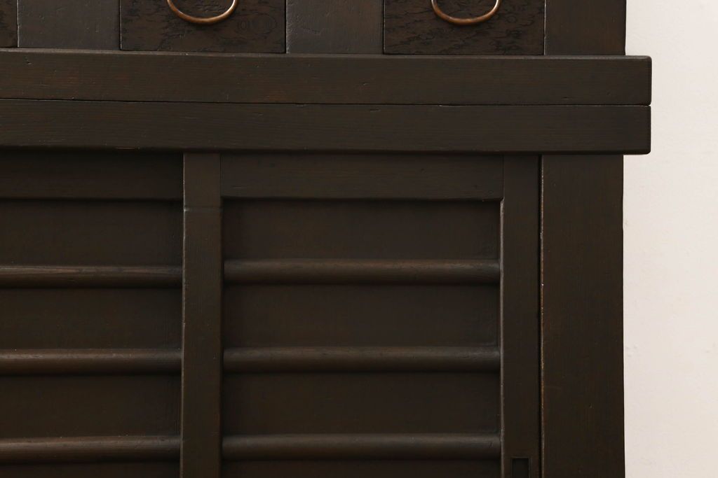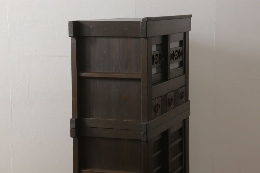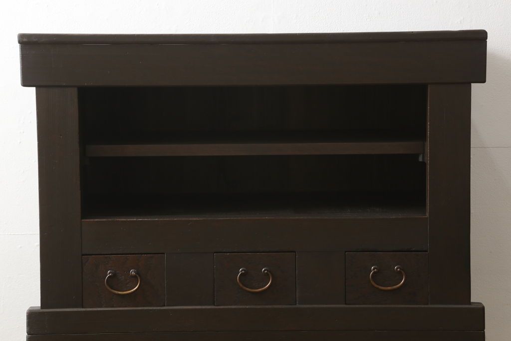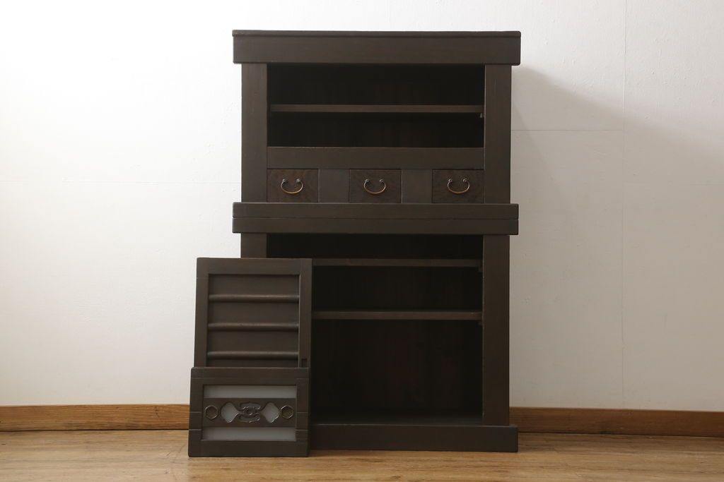 キャビネット・戸棚> 食器棚・カップボード > 三尺水屋箪笥をリペア&カスタム!高さをリサイズし、本体を上下分割できるように加工。網部分にはすりガラスを取り付け、棚板を新たに製作。色味はチェス系に着色し蜜蝋ワックスにて仕上げ。(収納棚、戸棚、キャビネット、食器棚)