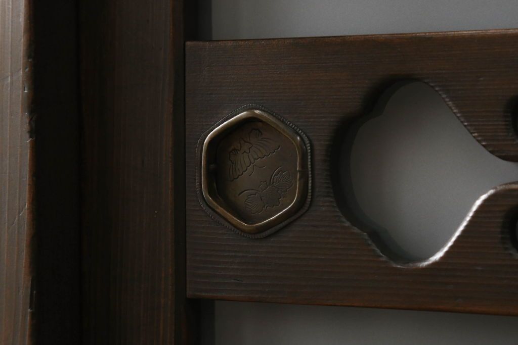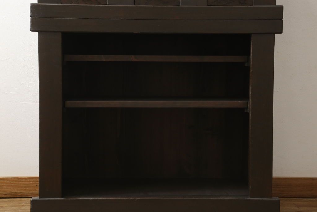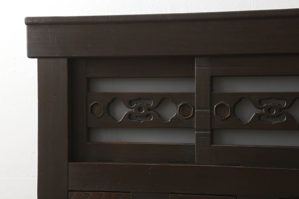 セミオーダー家具実績 > 三尺水屋箪笥をリペア&カスタム!高さをリサイズし、本体を上下分割できるように加工。網部分にはすりガラスを取り付け、棚板を新たに製作。色味はチェス系に着色し蜜蝋ワックスにて仕上げ。(収納棚、戸棚、キャビネット、食器棚)