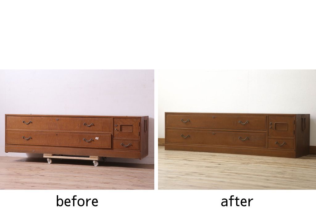 セミオーダー家具実績 > チェストをリペア&カスタム!左側上段引き出しをフラップダウン扉仕様にし、背板を切り取り加工。修繕箇所は本体と馴染ませ、現状のお品物に合わせて1トーン程落ち着いた色に着色。(ローボード)