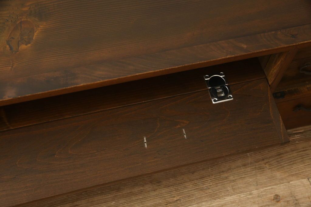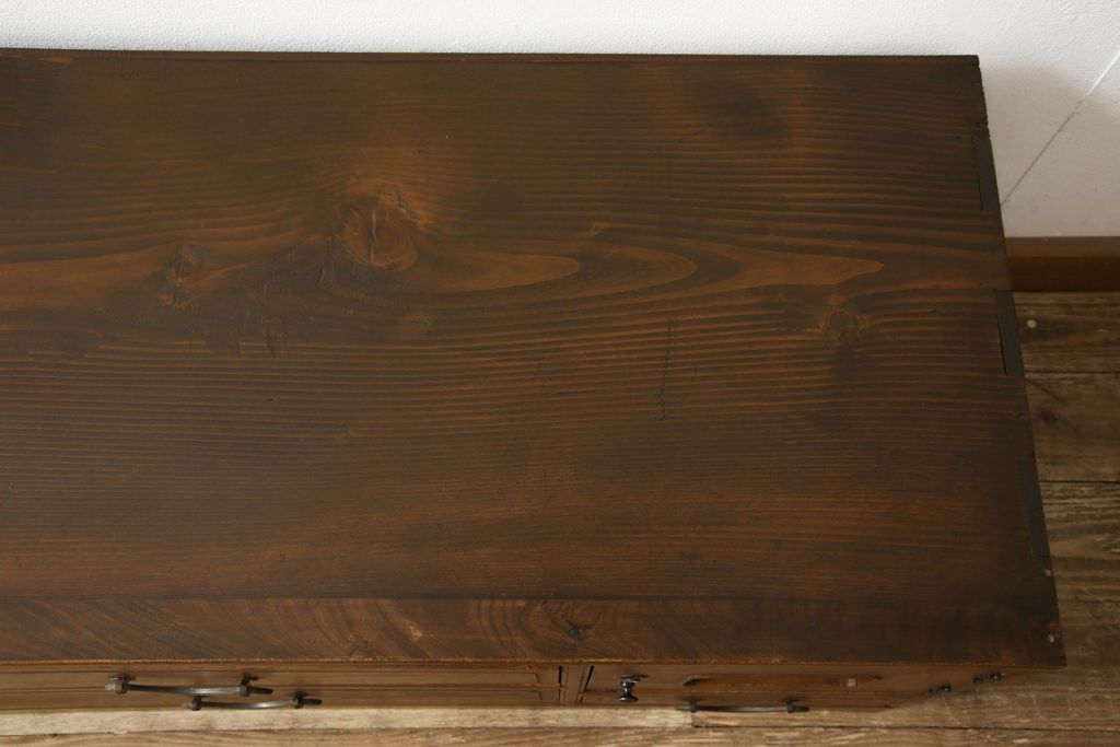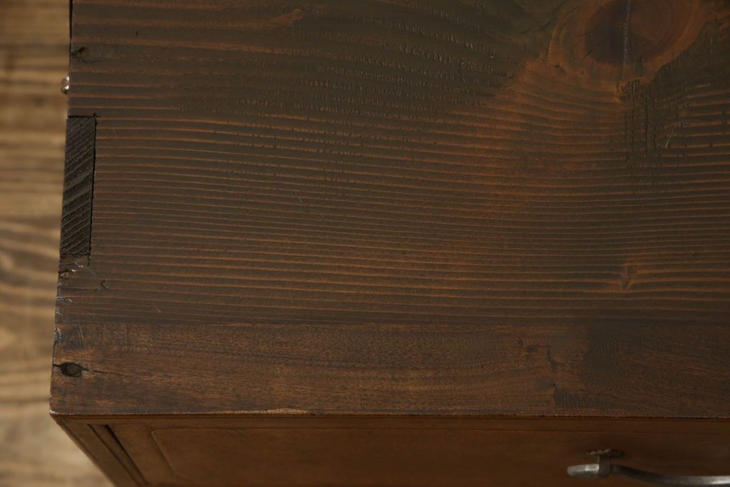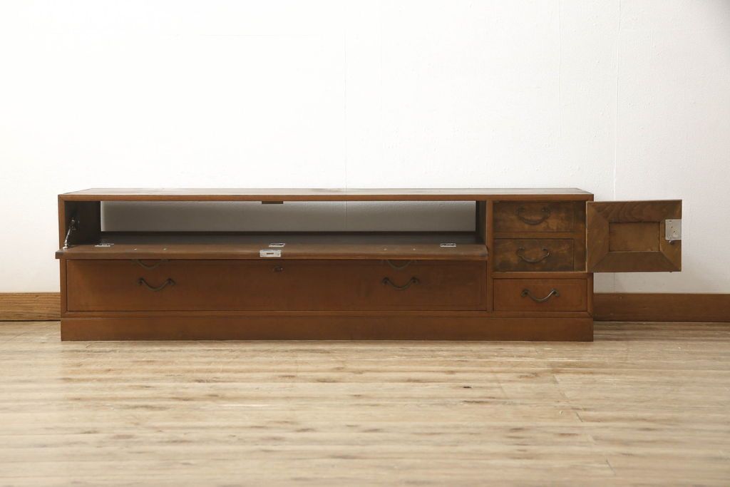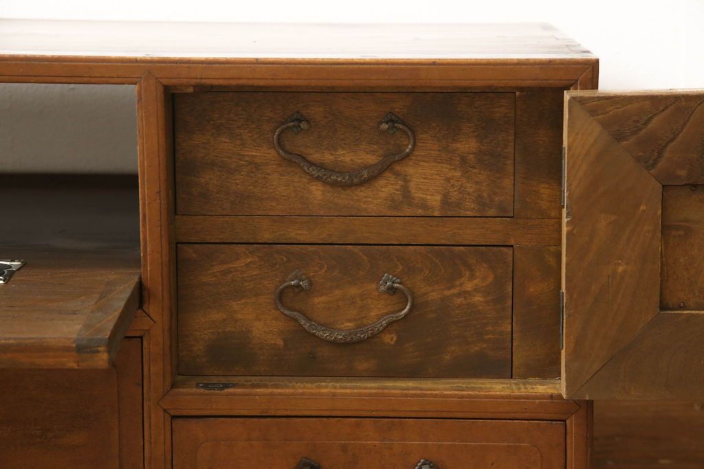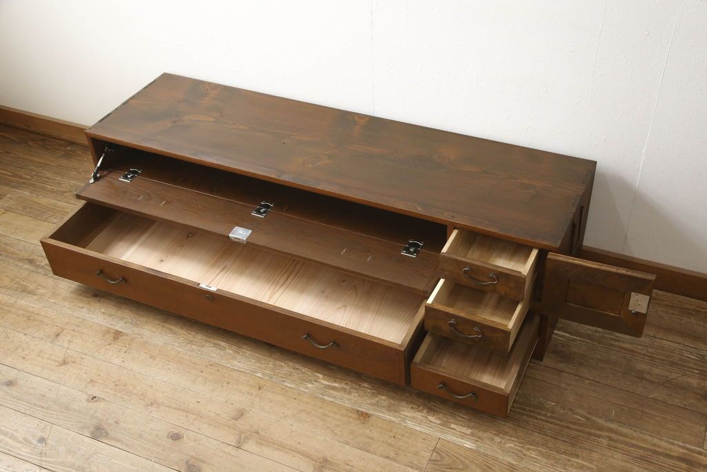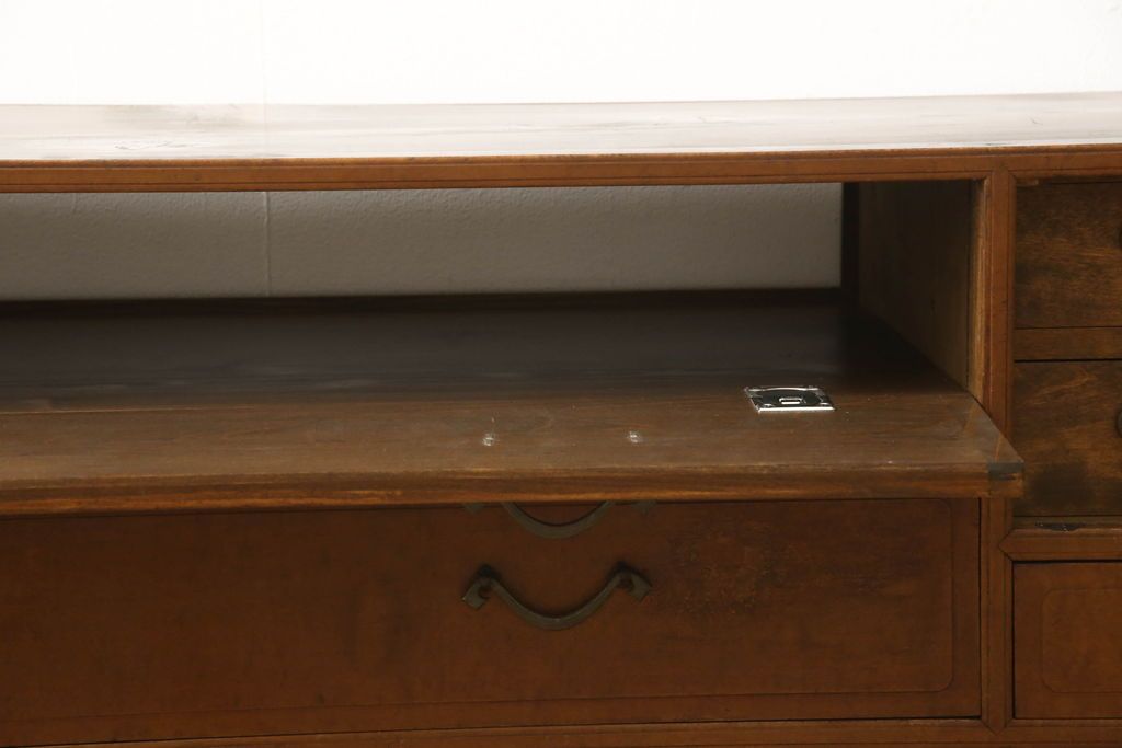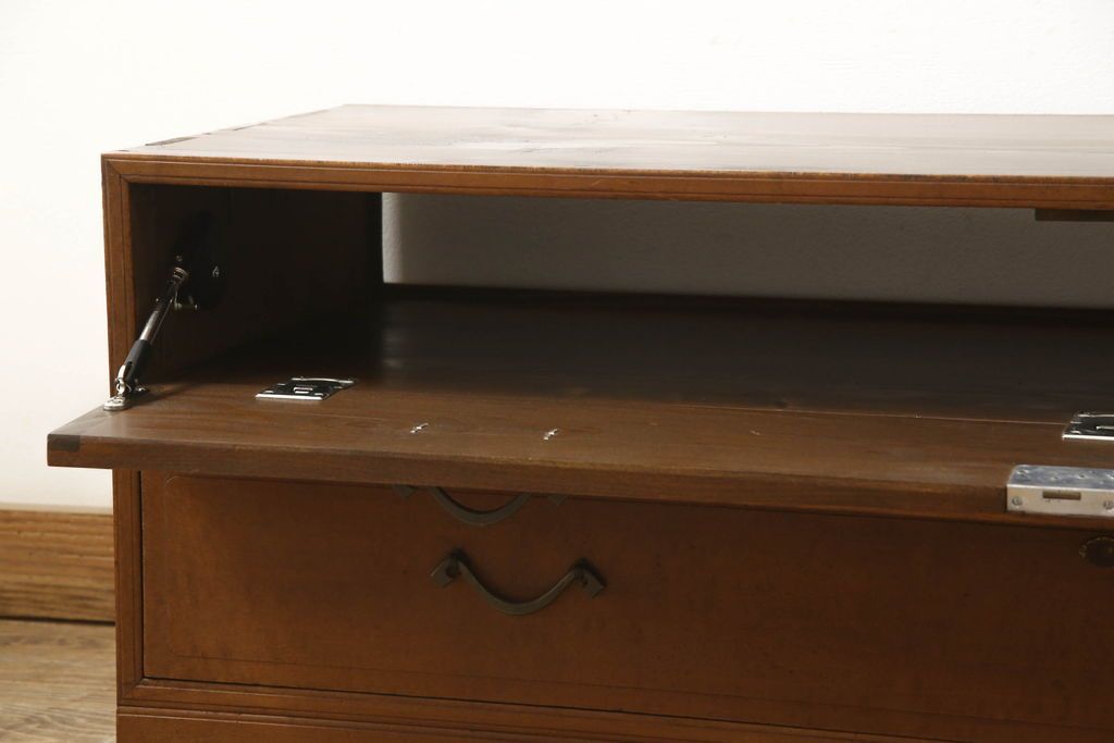 チェスト・引き出し> ローチェスト > チェストをリペア&カスタム!左側上段引き出しをフラップダウン扉仕様にし、背板を切り取り加工。修繕箇所は本体と馴染ませ、現状のお品物に合わせて1トーン程落ち着いた色に着色。(ローボード)
