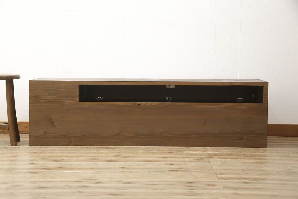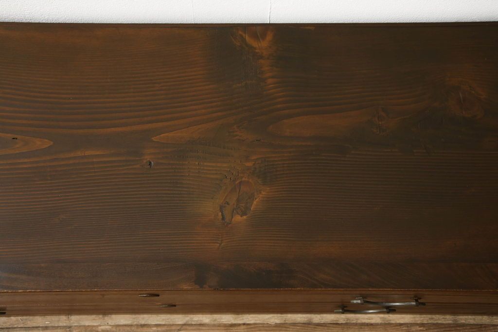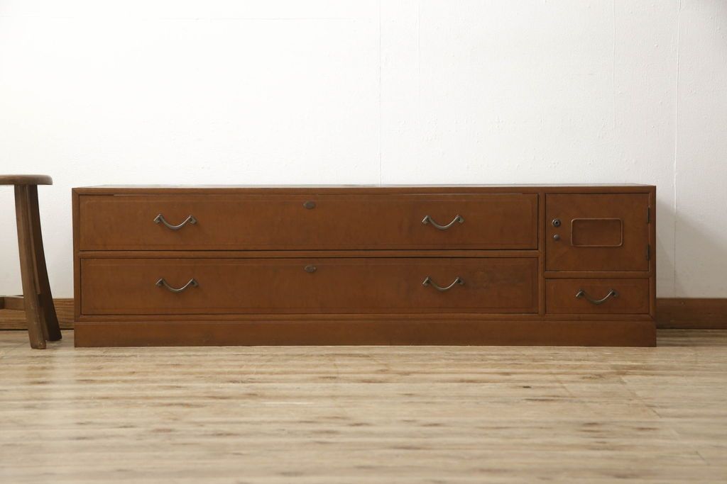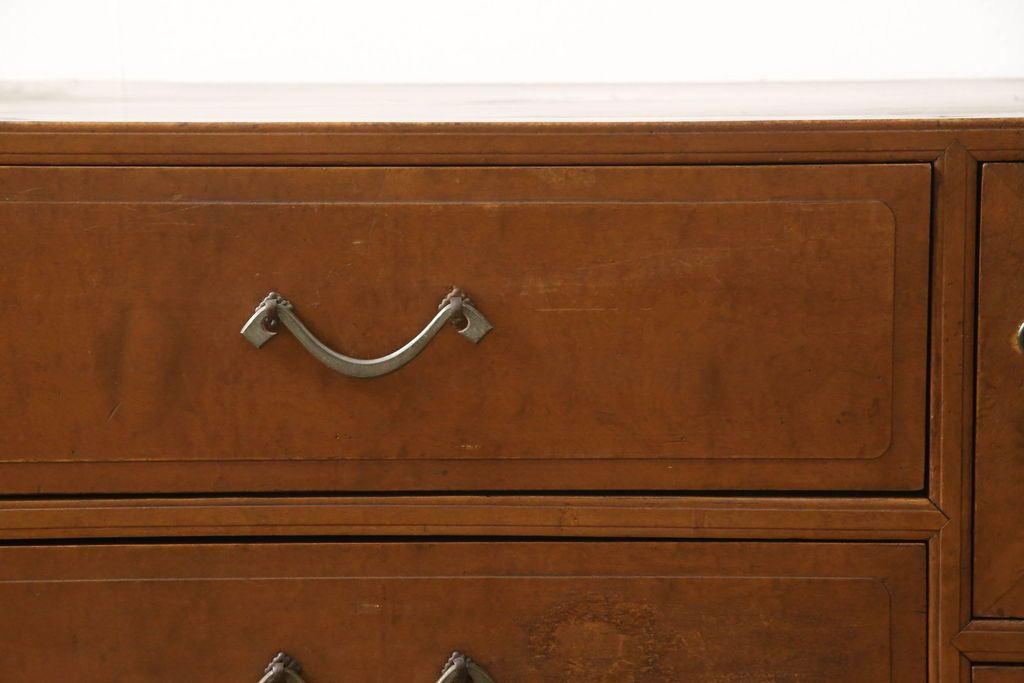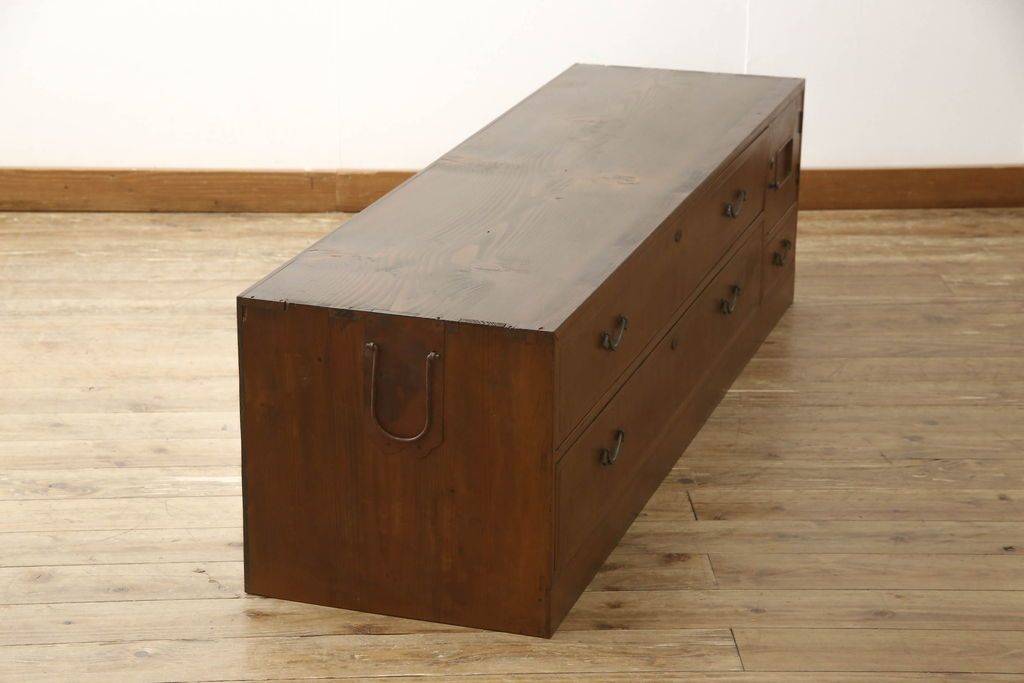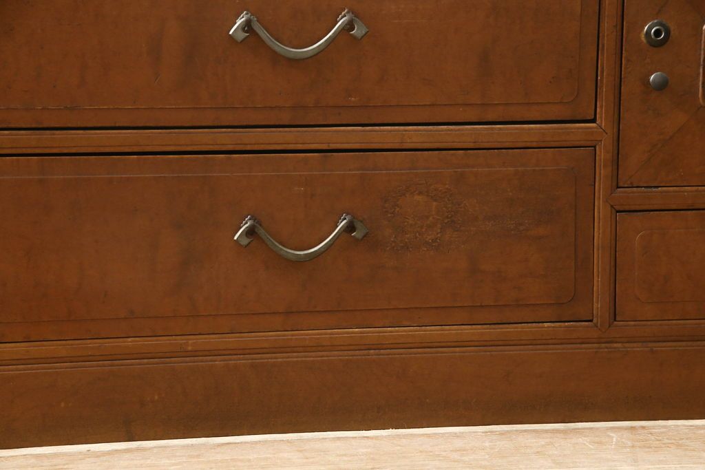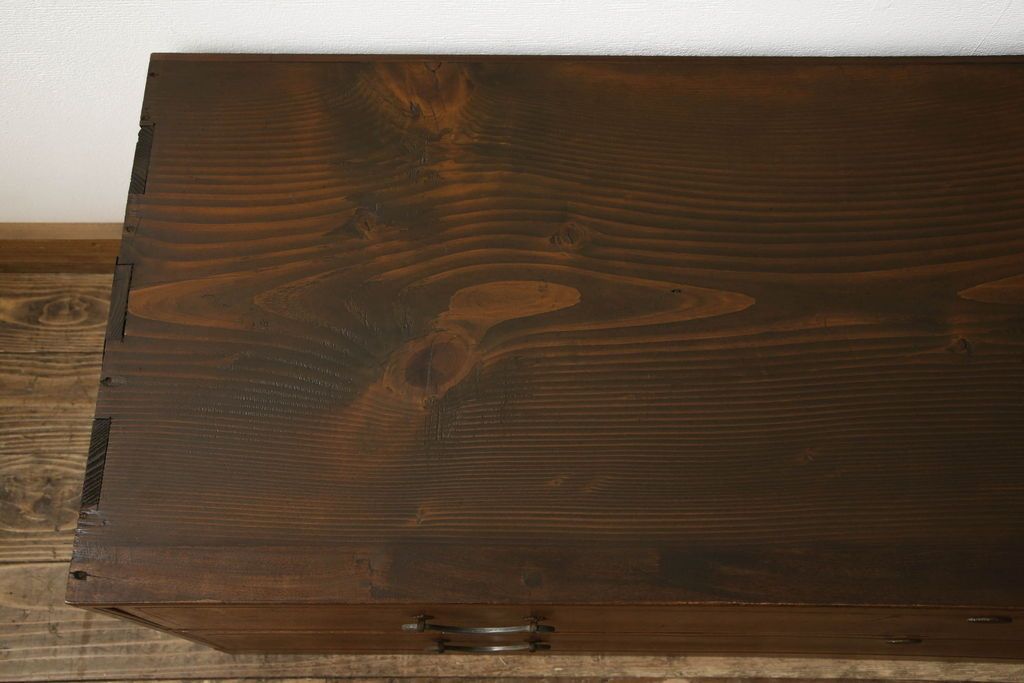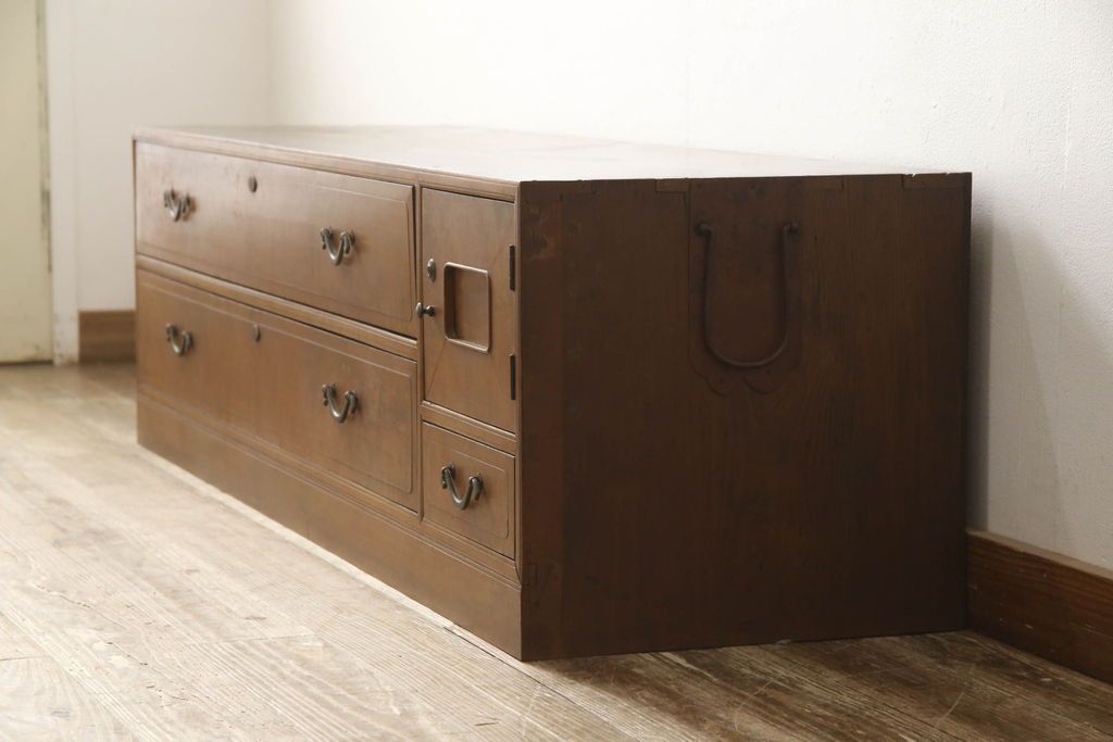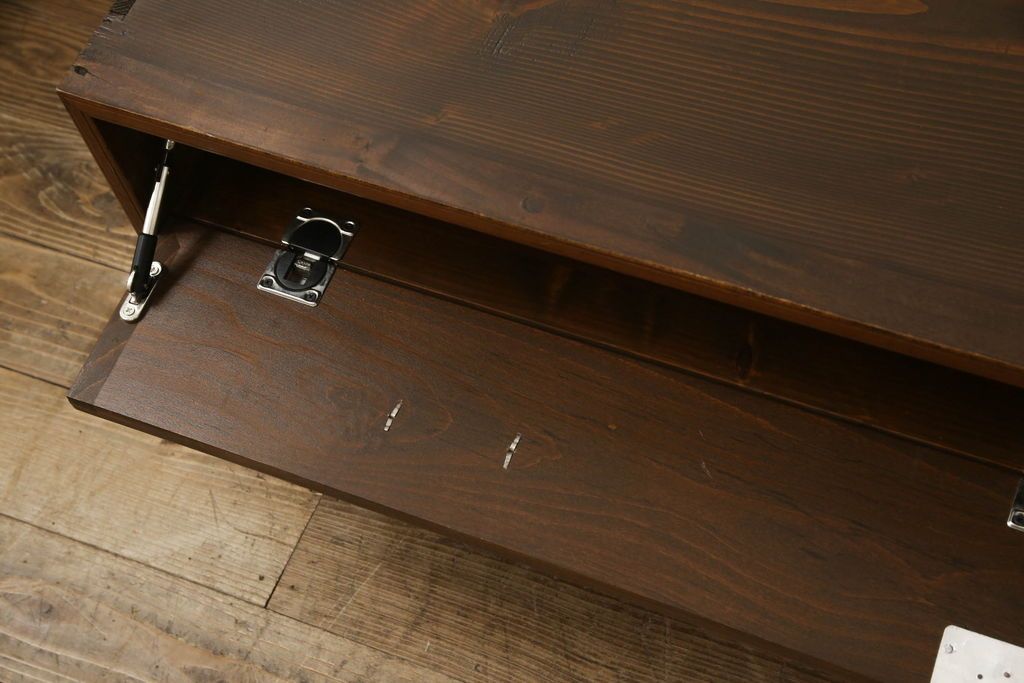 チェスト・引き出し> ローチェスト > チェストをリペア&カスタム!左側上段引き出しをフラップダウン扉仕様にし、背板を切り取り加工。修繕箇所は本体と馴染ませ、現状のお品物に合わせて1トーン程落ち着いた色に着色。(ローボード)