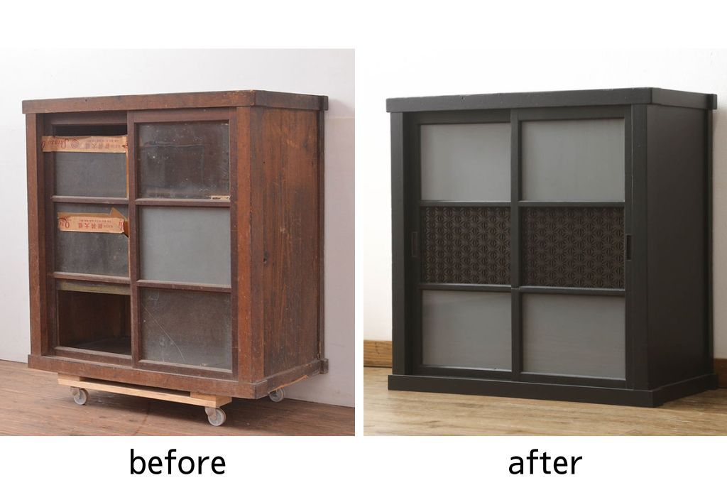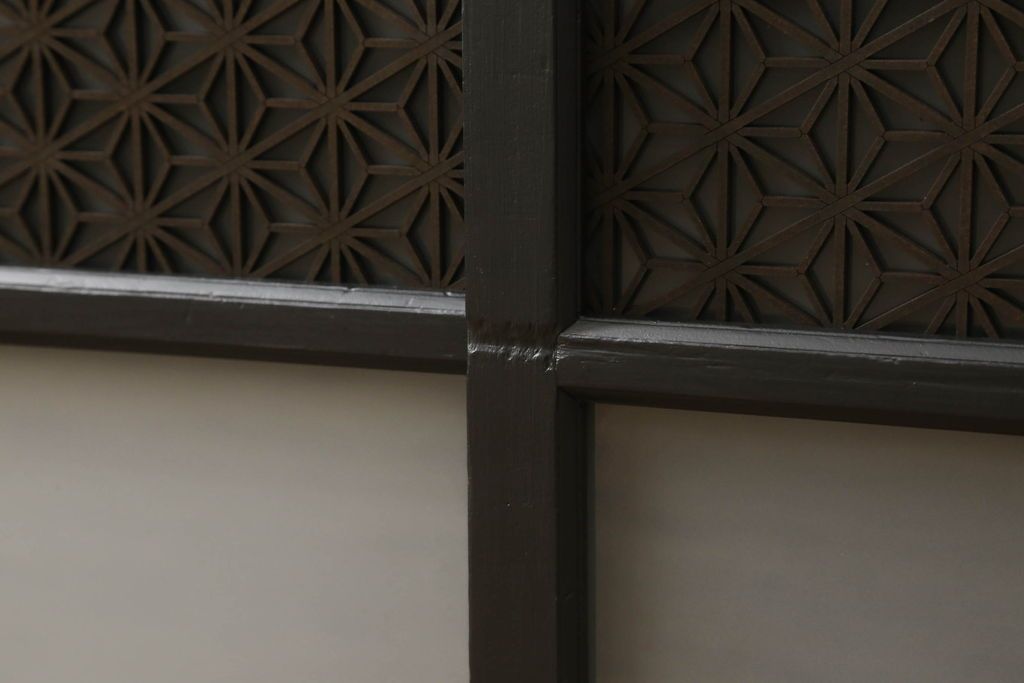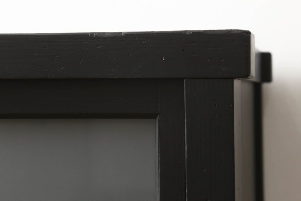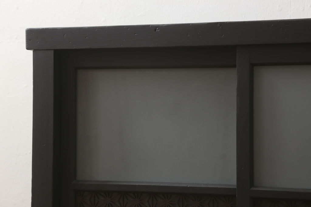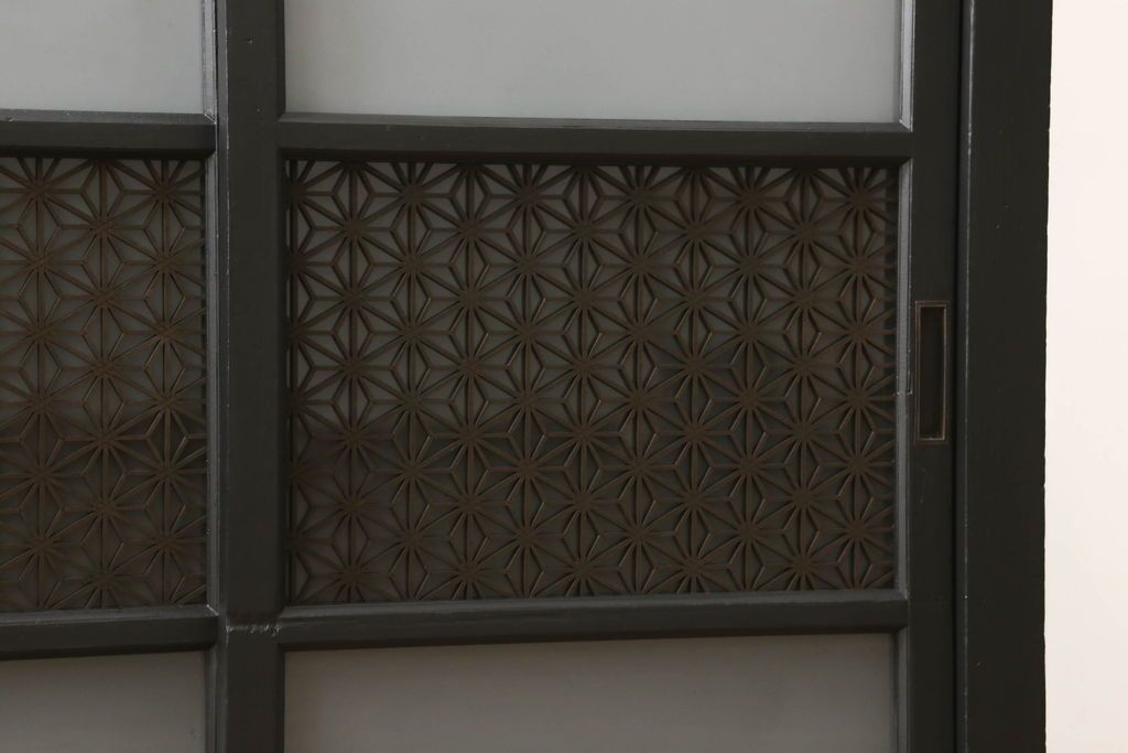 ガラス戸棚をリペア&カスタム!天板を補強し、棚内部中央に縦方向の仕切り製作。棚板を可動式に加工。麻の葉デザインのレーザー組子を製作し、上からすりガラス・組子入りすりガラス・すりガラスの順に引き戸ガラスを交換。組子の色味は暗めの茶色、本体はマットブラックに着色。 (収納棚、戸棚、キャビネット)