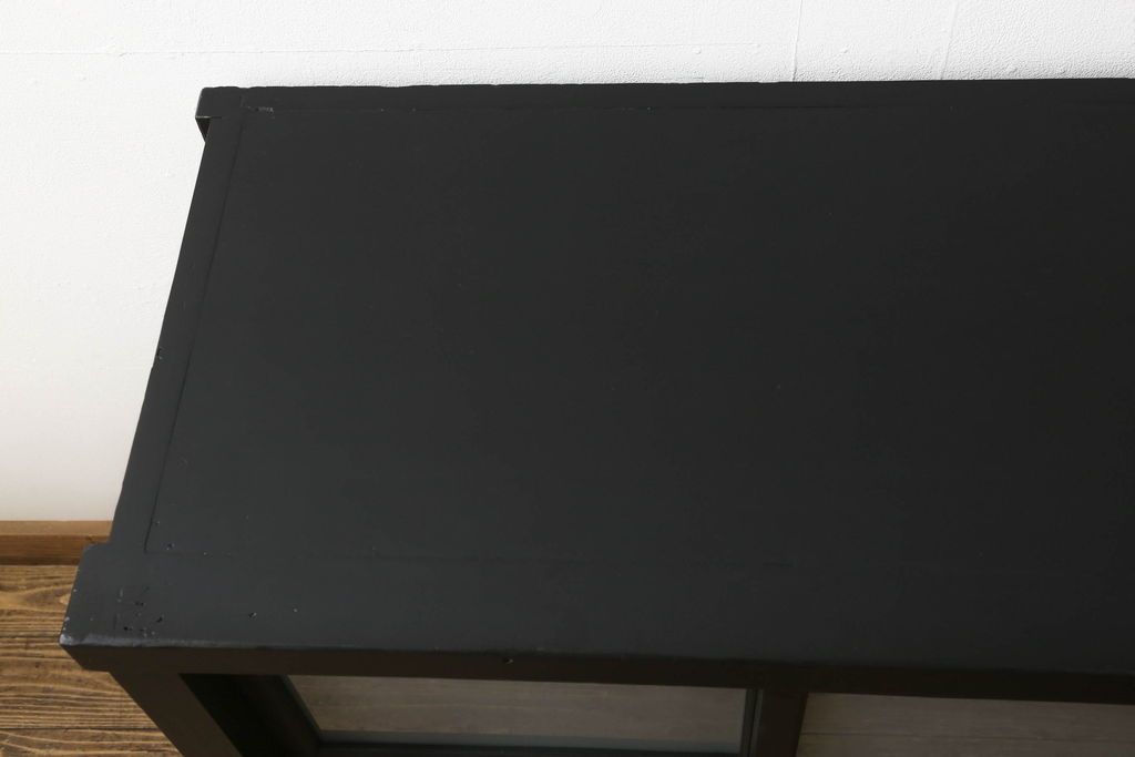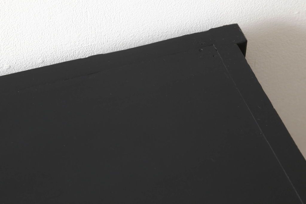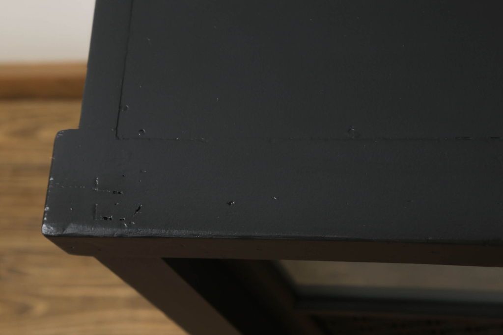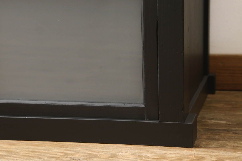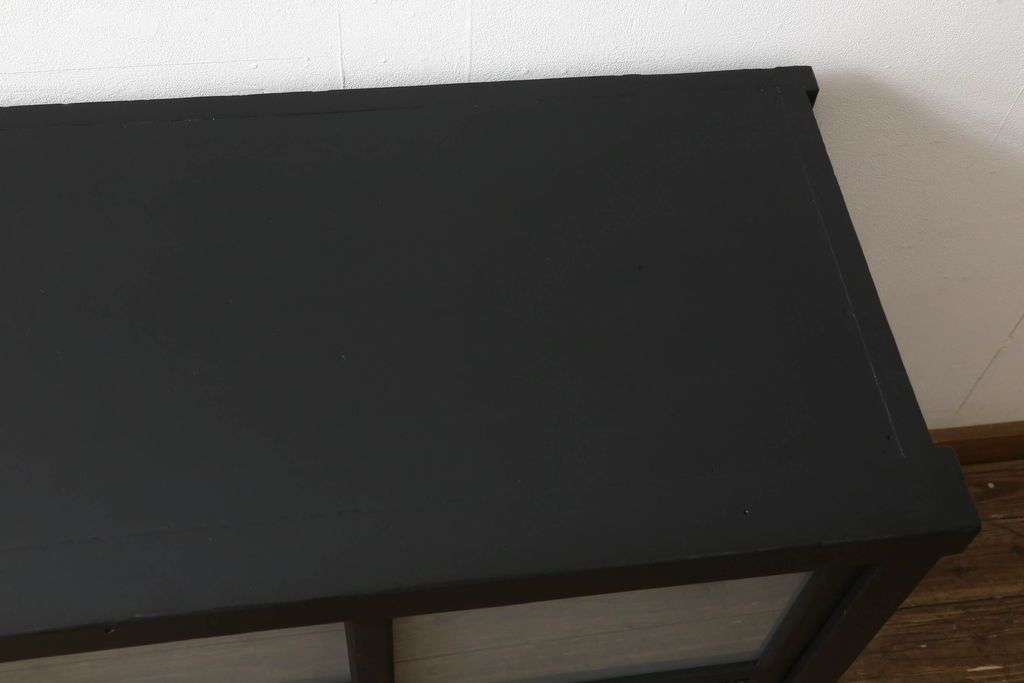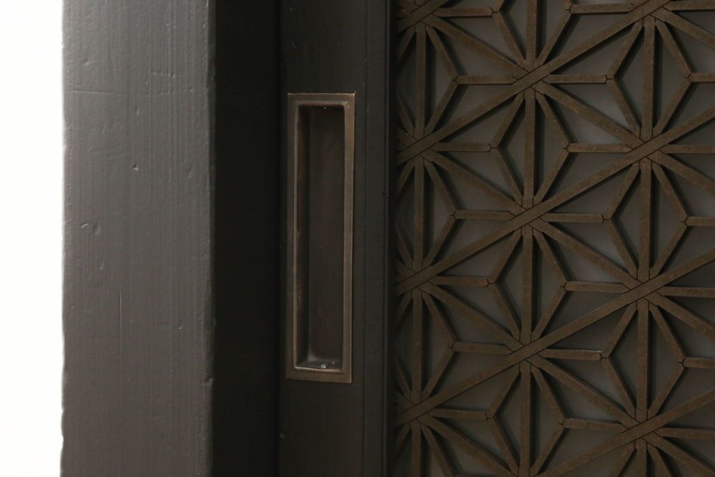 ガラス戸棚をリペア&カスタム!天板を補強し、棚内部中央に縦方向の仕切り製作。棚板を可動式に加工。麻の葉デザインのレーザー組子を製作し、上からすりガラス・組子入りすりガラス・すりガラスの順に引き戸ガラスを交換。組子の色味は暗めの茶色、本体はマットブラックに着色。 (収納棚、戸棚、キャビネット)