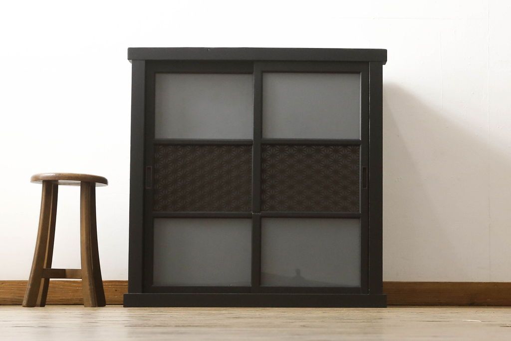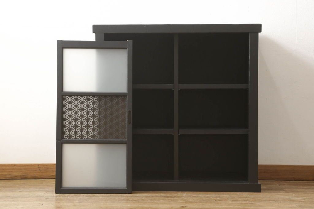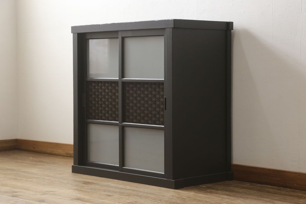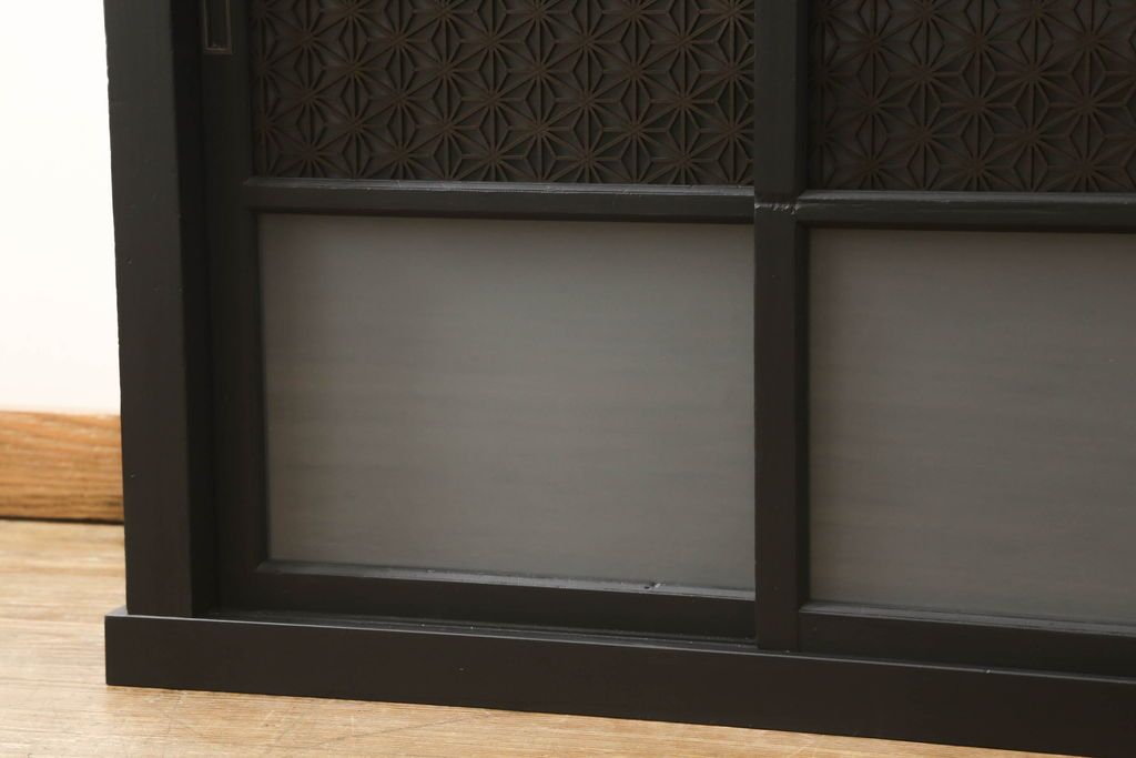 セミオーダー家具実績 > ガラス戸棚をリペア&カスタム!天板を補強し、棚内部中央に縦方向の仕切り製作。棚板を可動式に加工。麻の葉デザインのレーザー組子を製作し、上からすりガラス・組子入りすりガラス・すりガラスの順に引き戸ガラスを交換。組子の色味は暗めの茶色、本体はマットブラックに着色。 (収納棚、戸棚、キャビネット)