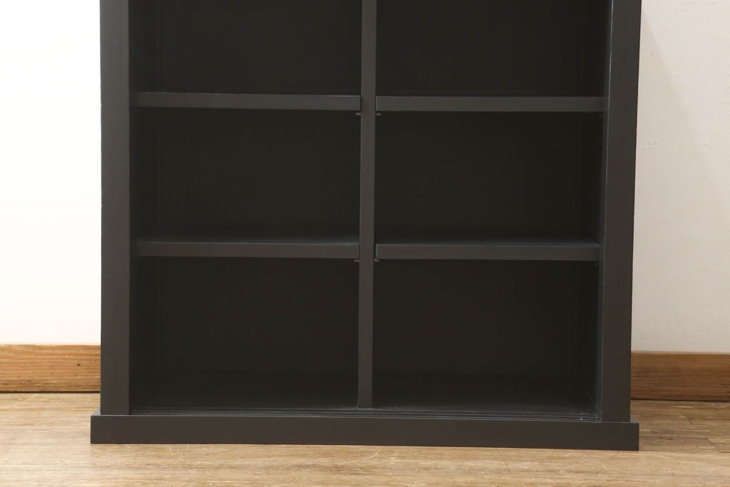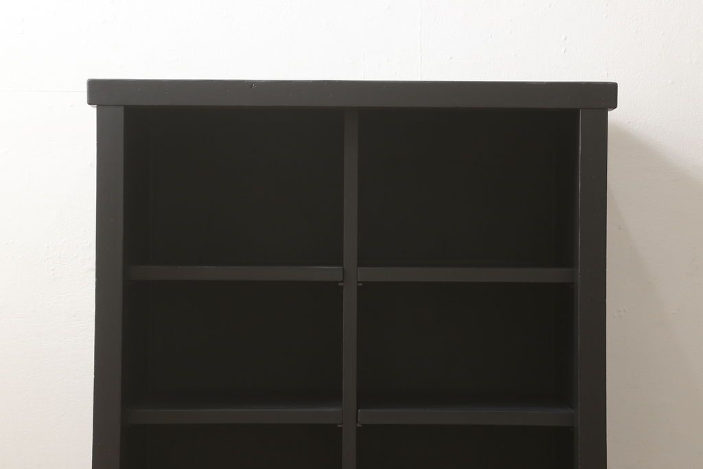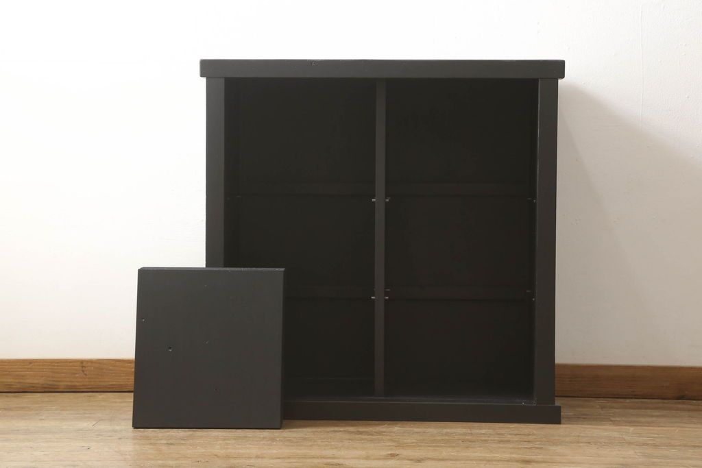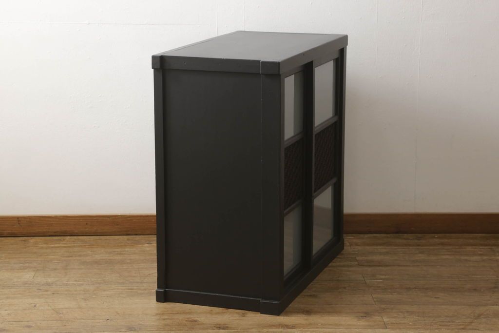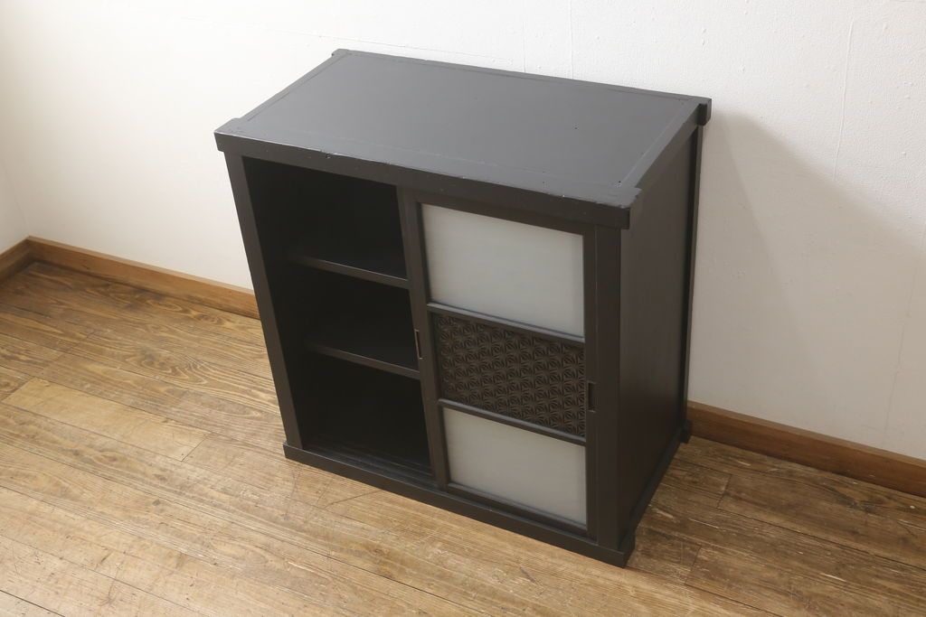 セミオーダー家具実績 > ガラス戸棚をリペア&カスタム!天板を補強し、棚内部中央に縦方向の仕切り製作。棚板を可動式に加工。麻の葉デザインのレーザー組子を製作し、上からすりガラス・組子入りすりガラス・すりガラスの順に引き戸ガラスを交換。組子の色味は暗めの茶色、本体はマットブラックに着色。 (収納棚、戸棚、キャビネット)
